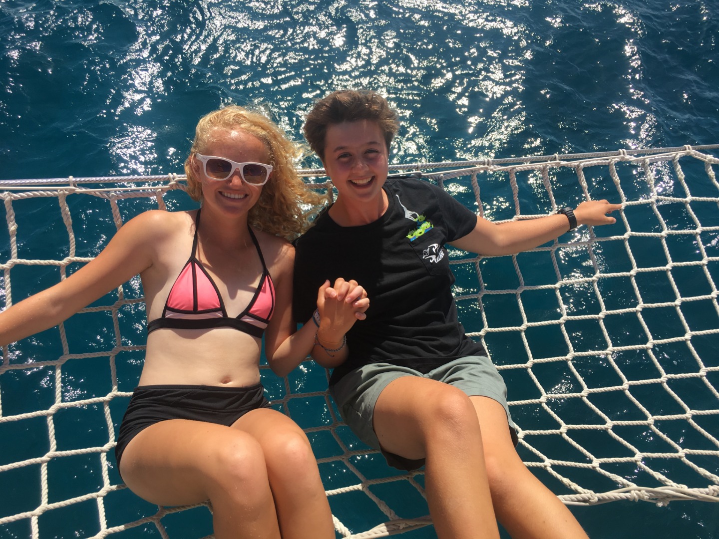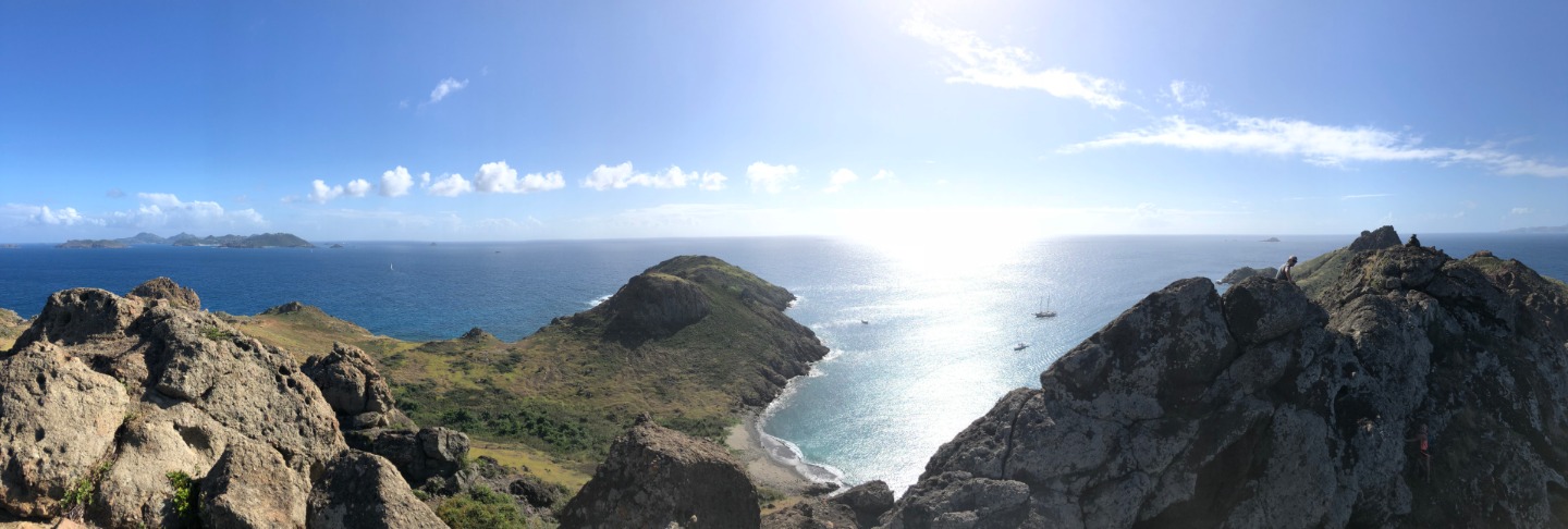 Pictured: Views from the top of the peaks on Ile Fourche; James exploring the island during shore time; Sydney and Ev relaxing in the martingale.