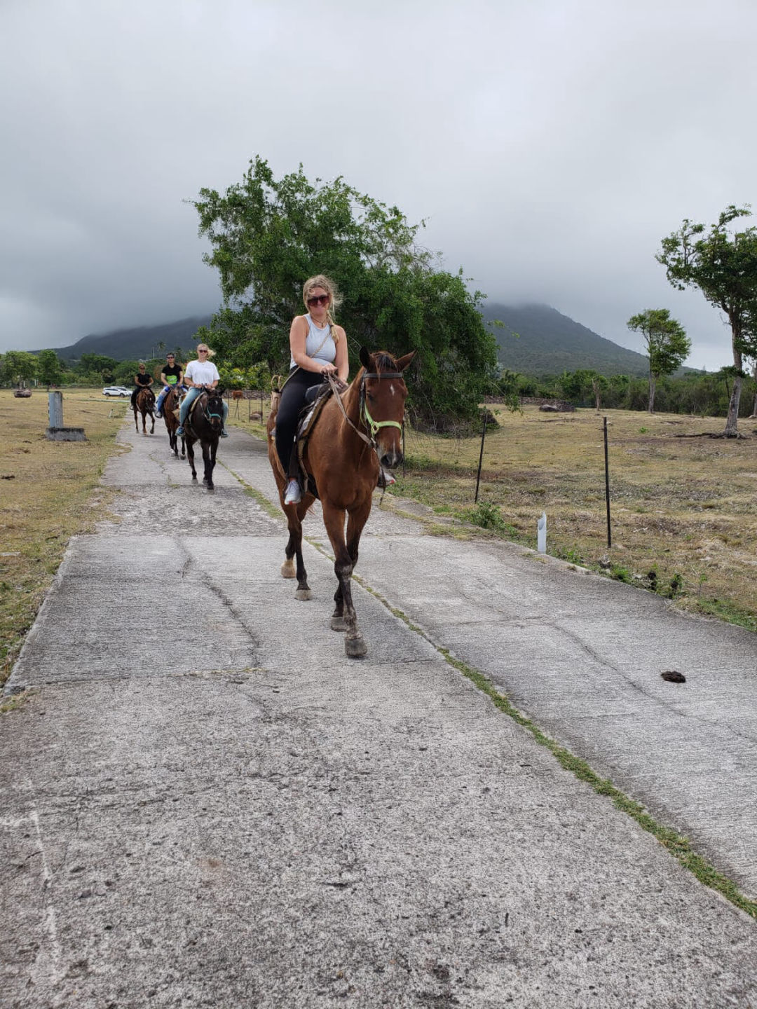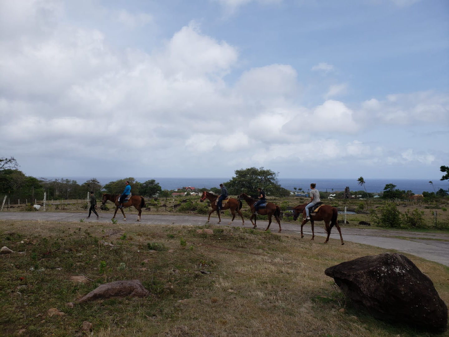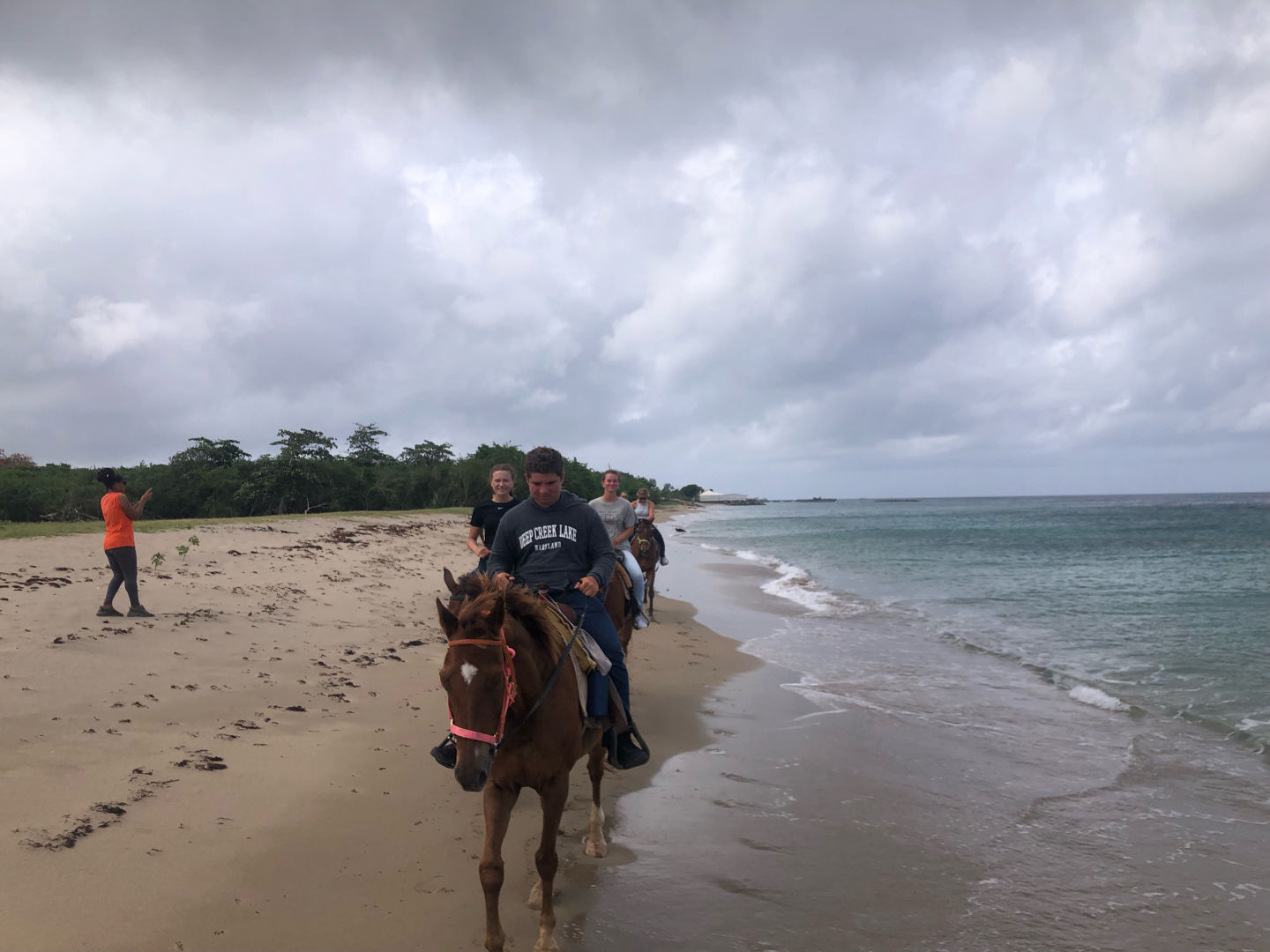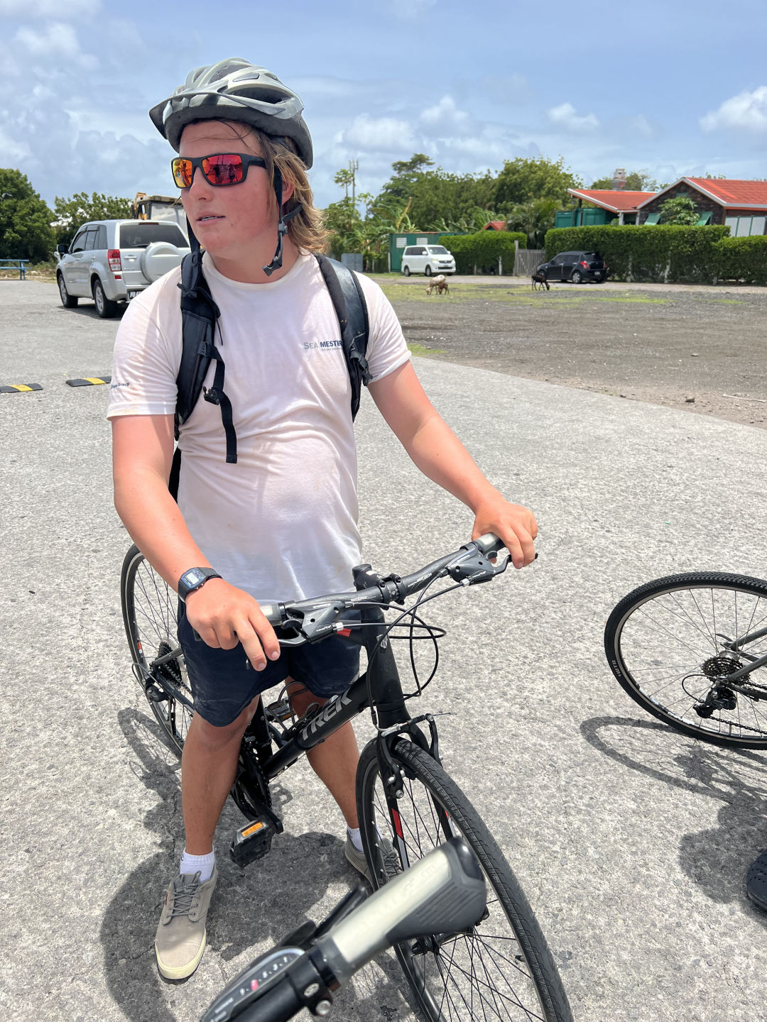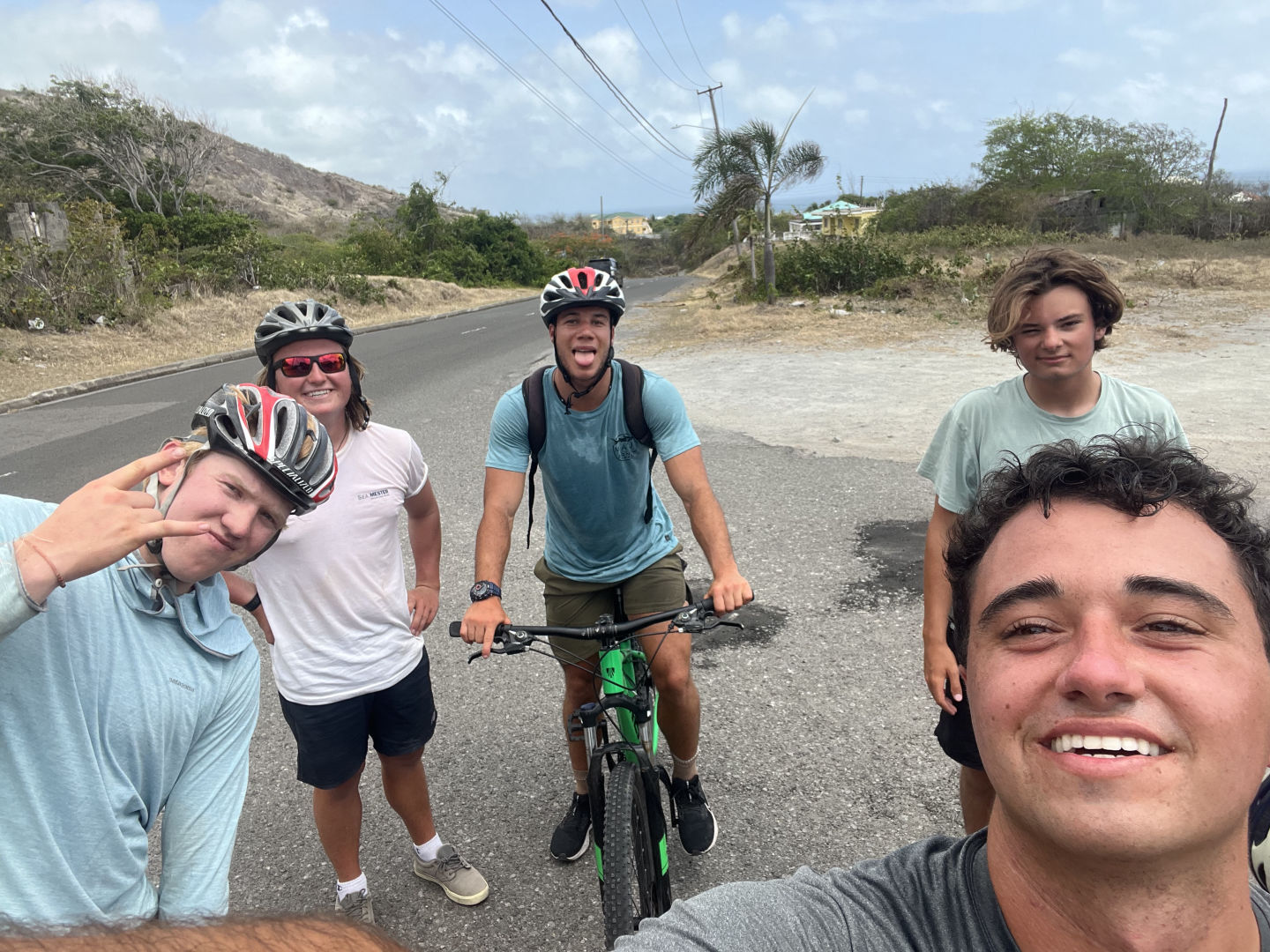 I am writing to you all with a full stomach of delicious chicken and boxed mashed potatoes with a side of broccoli and green peas. Today was an adventure for sure. We woke up excited but moving a little slow, or maybe that was just me because last night was a sign-out night (where you can drink). Once I had my morning coffee, I was ready to take on the day, at least I thought… Most of us wanted to go on the horseback ride, but to the fate of a random number generator, only eight contestants were picked. I was not one of them. My new activity of “choice” was biking. It was not your average scenic tropical island cruiser bike ride. Once we got to the bike and kayak shop, we were greeted by a brummie, as Drew would say, an English man named Winston. He got us all suited up and told the kayak group if they did not want to end up in Puerto Rico because of the high winds, they should join the bike group. Then we set off. One member of our bike team, Owen, took the smart way out and turned back about thirty minutes into the ride to return to have a beach day to himself. The rest of us moseyed on biking/pushing the bike up the hill after hill. After a few sweaty hours and many false summits, we made it to the promised long downhill.