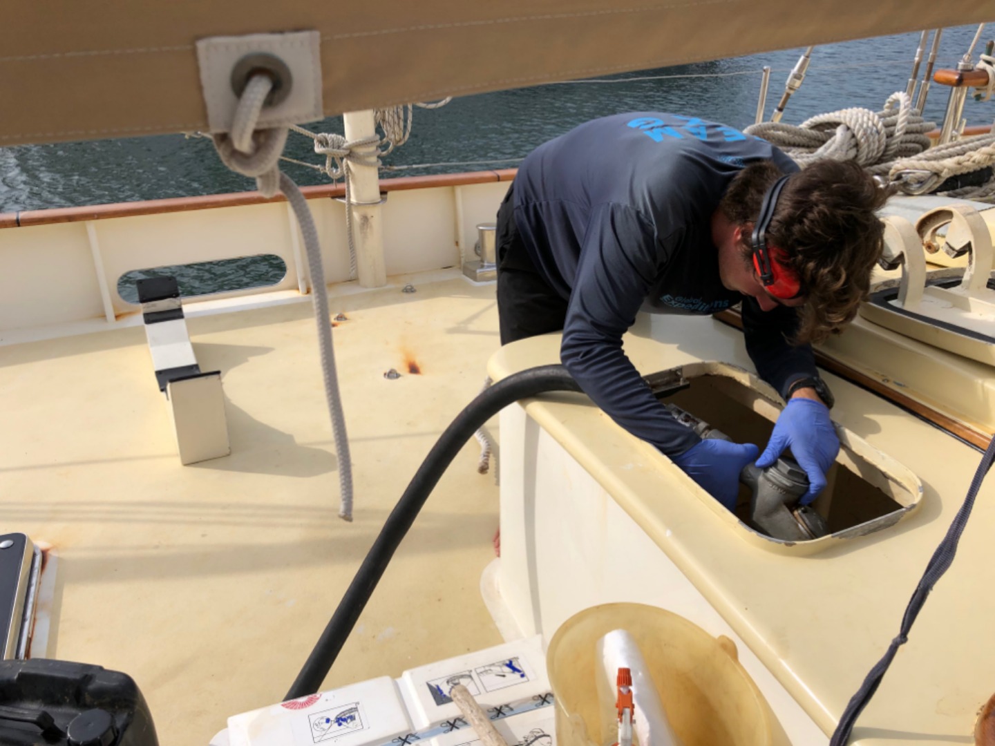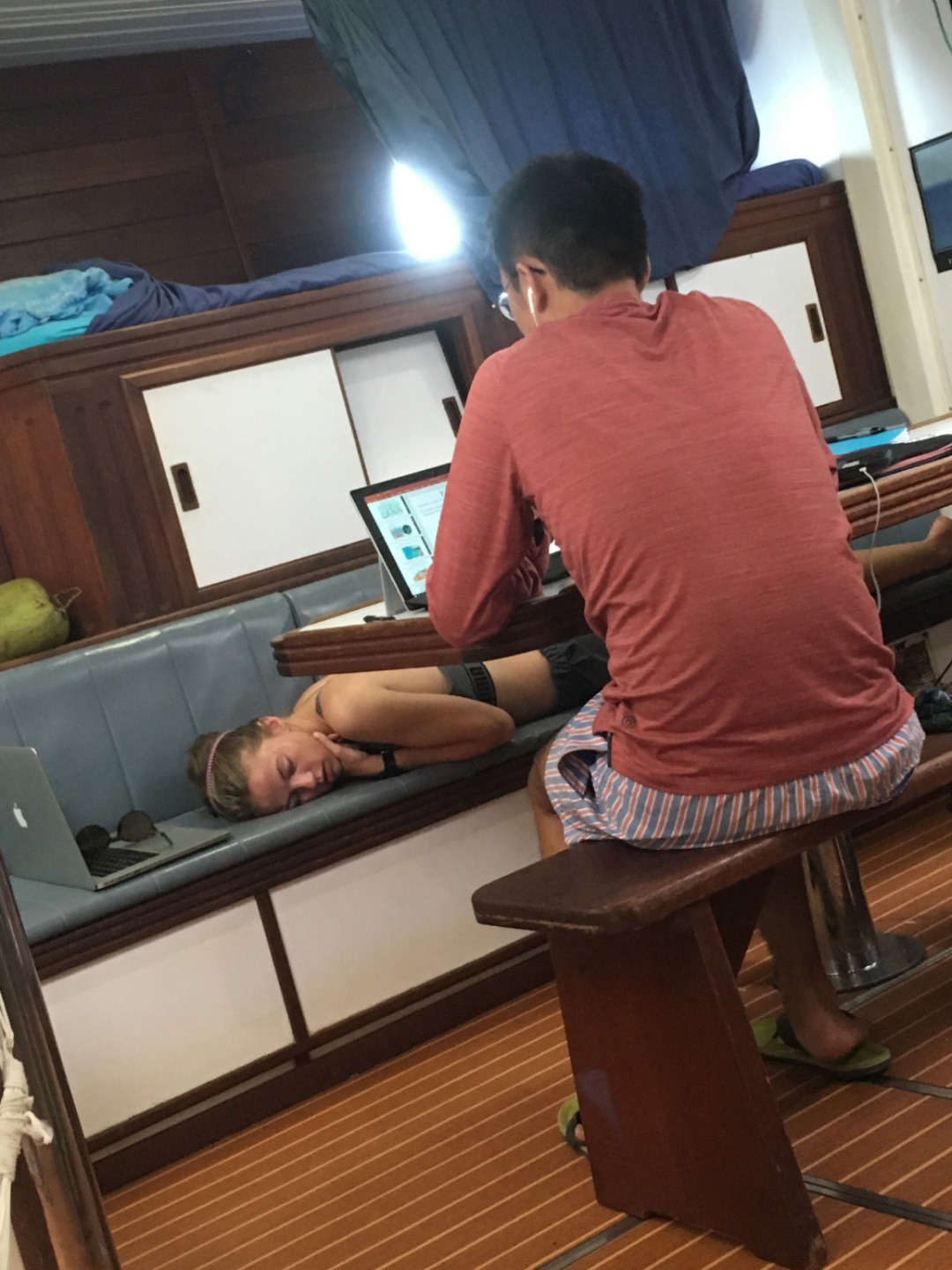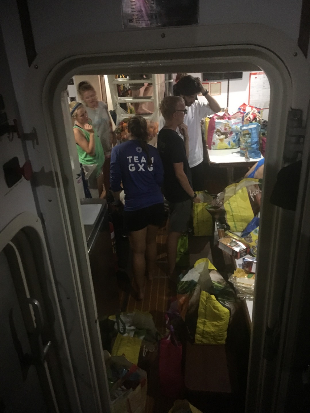 Behind the scenes, Amanda, Steph, and Amy were undertaking the monumental task of provisioning for 24 people for over a month. You know when your extended family is coming over for the holidays, and your parents go grocery shopping for those four days of meals, and the minivan is full of shopping bags? Well, that was child’s play compared to what Amanda, Steph, and Amy accomplished. The receipt went from the stern to midships… 50+ ft! As I type, four months’ worth of food is overflowing in the salon, bound for the deepest, darkest corners of Argo’s vast storage compartments. On the surface, she looks calm and ready, yet down below the mother of all organizational undertakings is being…. undertaken.