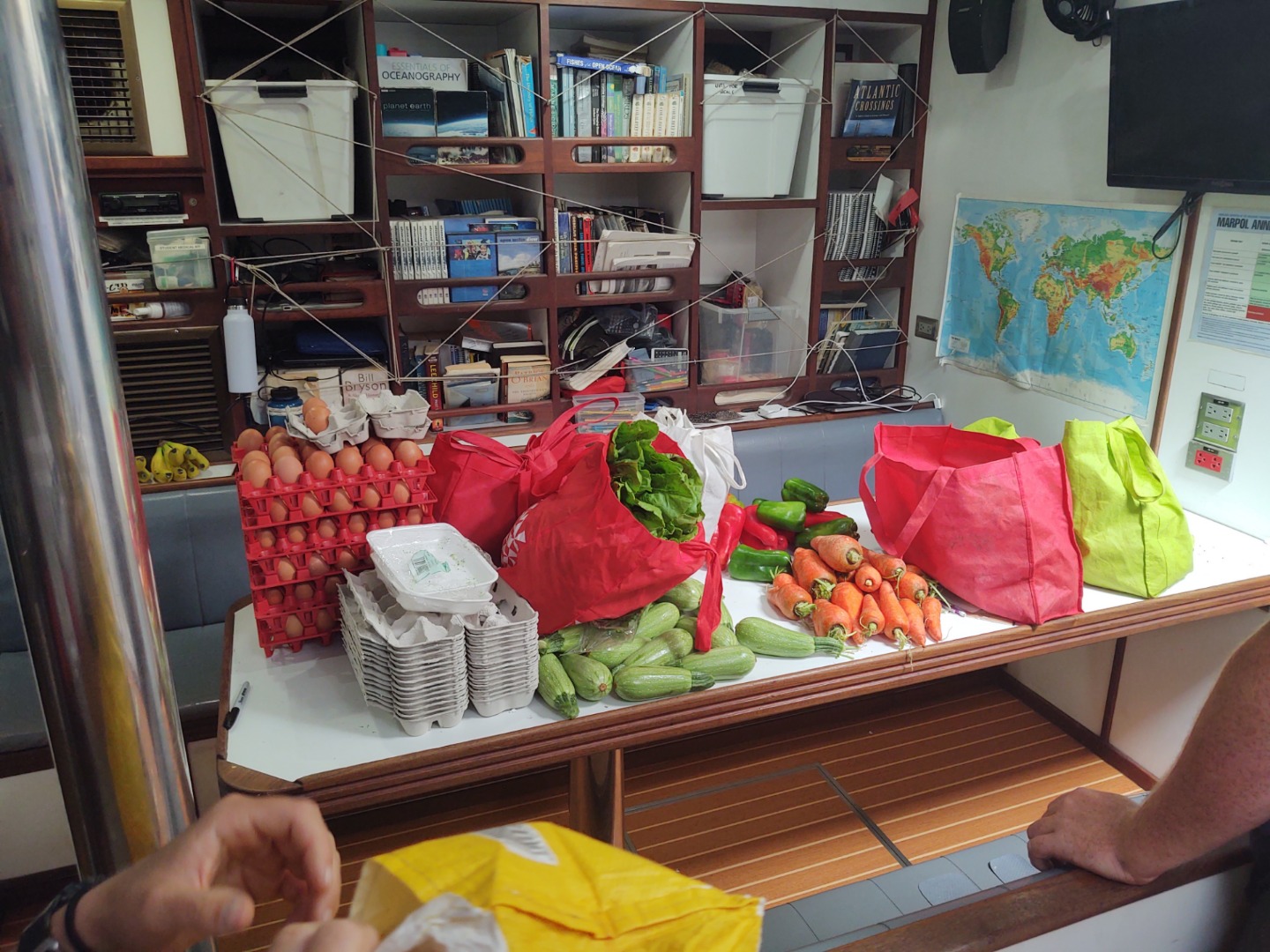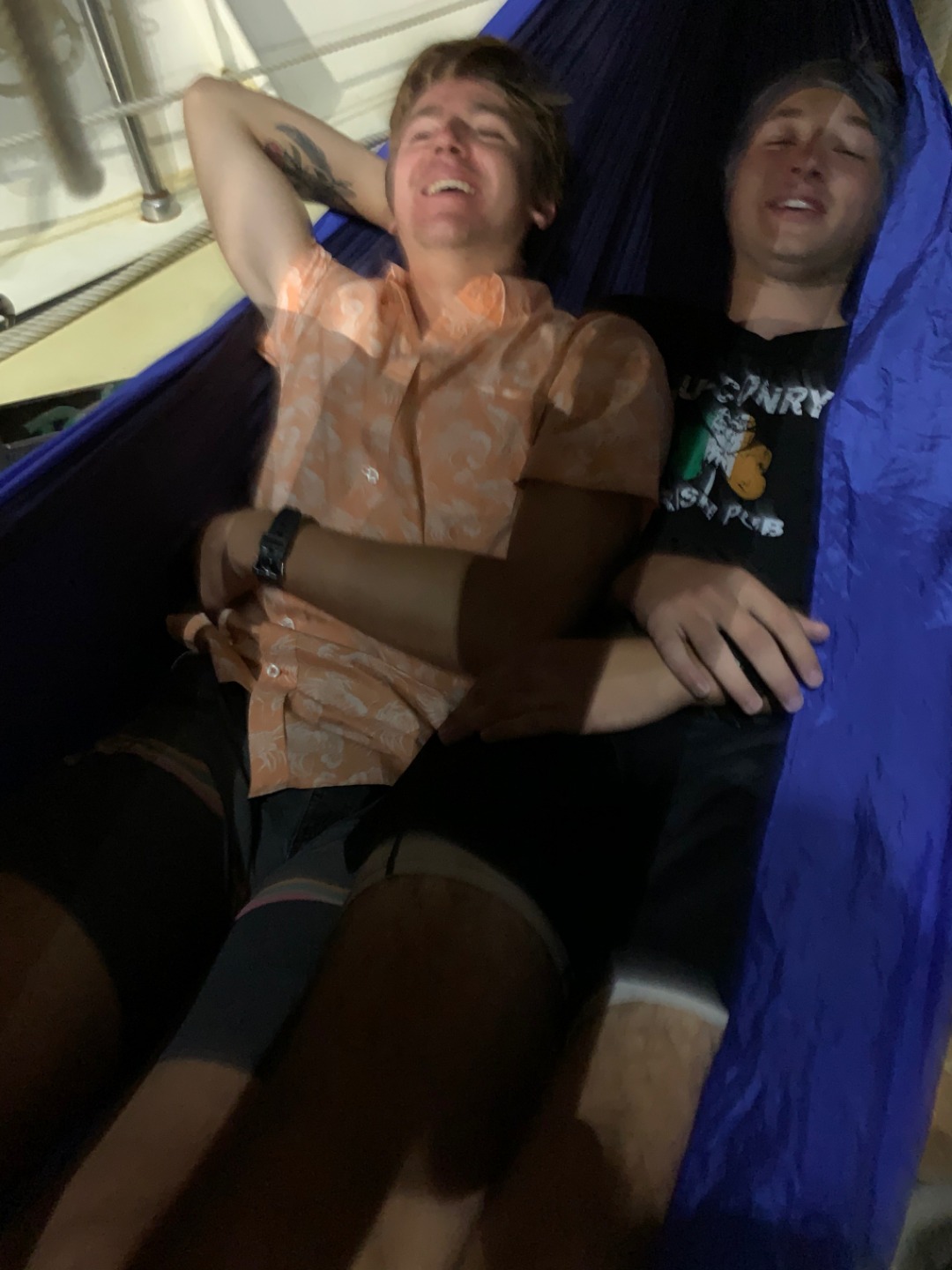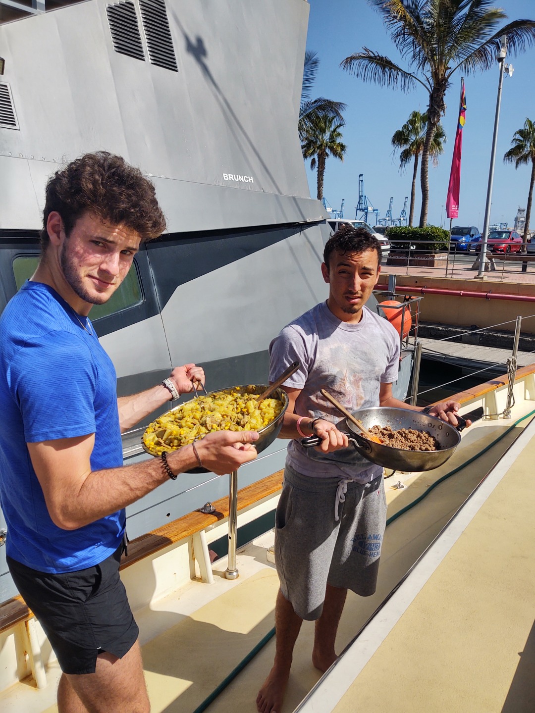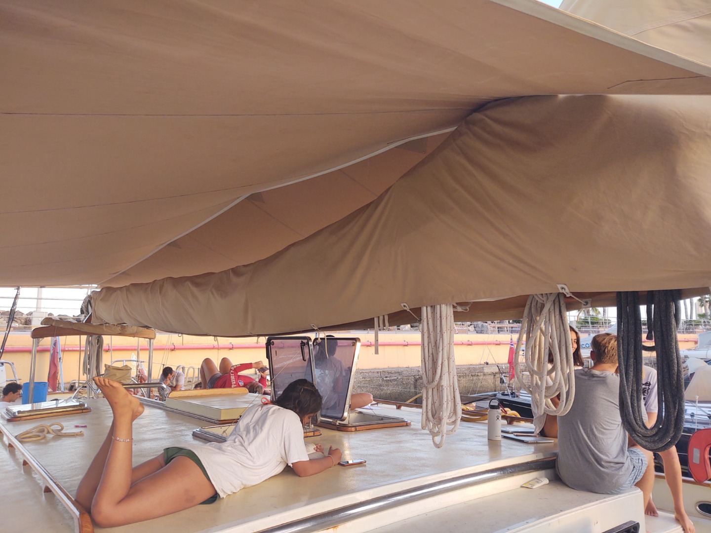Today started with quite the surprise as everyone found out we would stay in Gran Canaria another two days before moving to Tenerife for our final destination before departing for the Caribbean. This was not met with any resistance. It was actually pretty exciting as the days we have been on the dock have been pretty refreshing and a bit of a break from the chaotic life at sea. With two classes in the morning and some fun activities, we all went our respective ways around lunch. I personally went with the group that set up the MEGA tarp, which covers most of the chart house and was quite the respite from the glaring sun today. After ample shade was available, we had a diddy bag-making class in the cool shade with Brahm. The other two groups did some exciting things, as well as there was a beach trip and an emergency first responder class. Tomorrow will be when all the groups switch, so everyone has a chance to do each activity we have planned. We ended the day with a great lasagna made by quite the crew, which turned out amazing, wrapping up an amazing day on Argo. Our squeeze question was, “Share a fun fact.” We had many fun facts about animals, particularly sloths. We also learned about ancient animals like dinosaurs, and we learned about knights and medieval history.