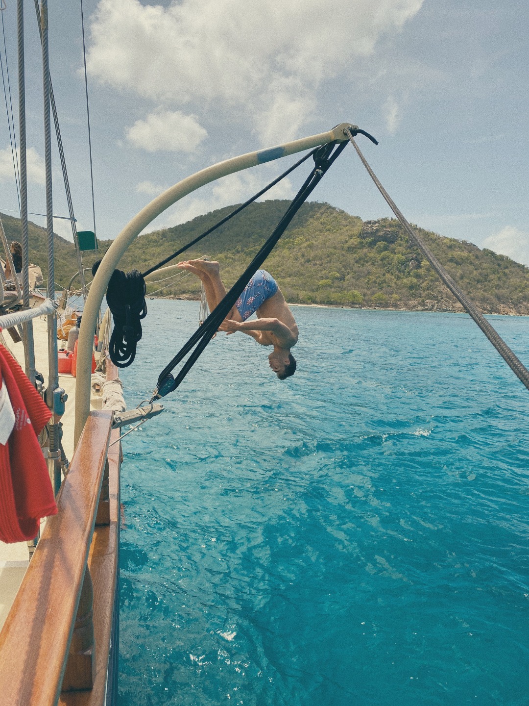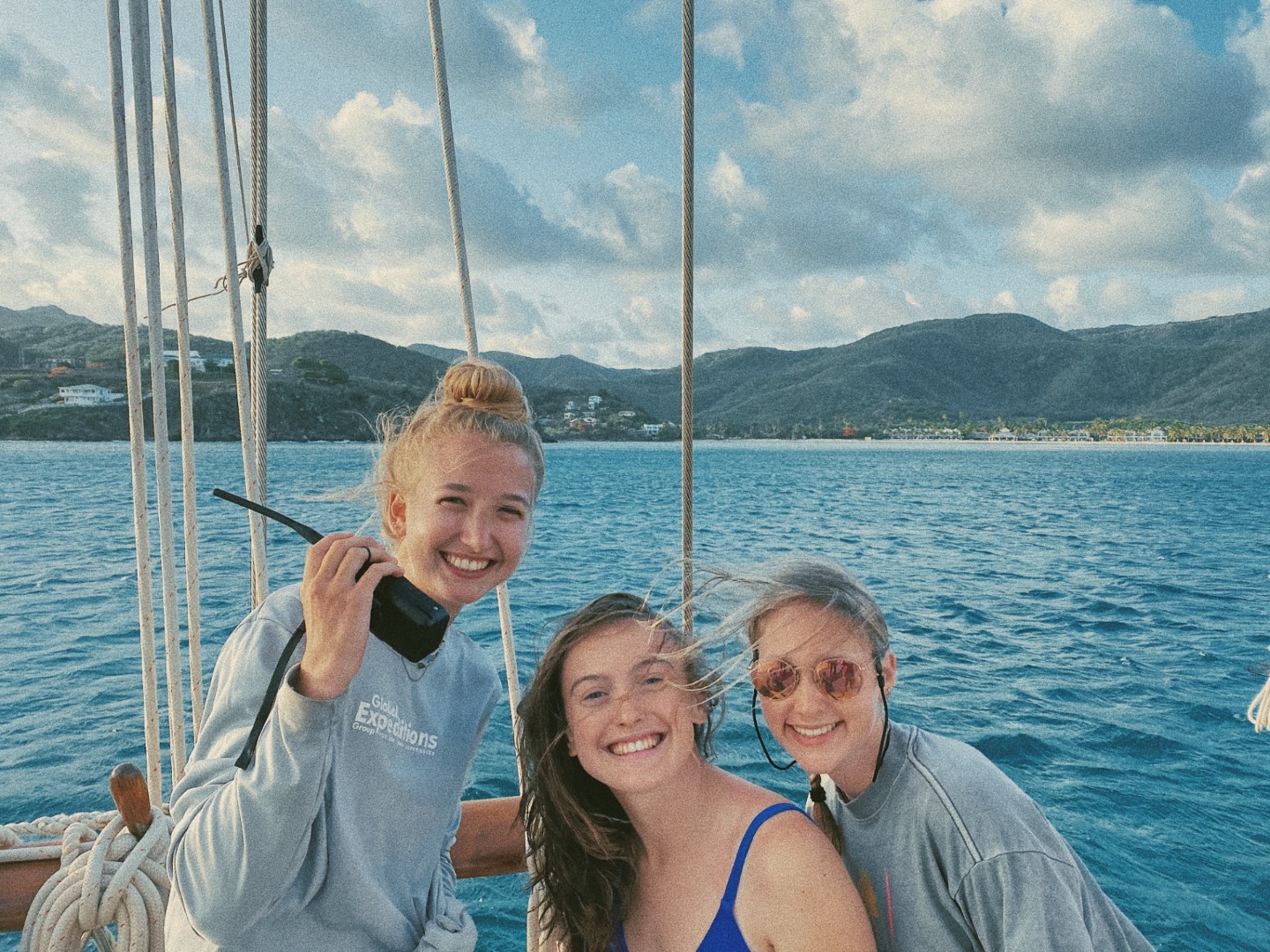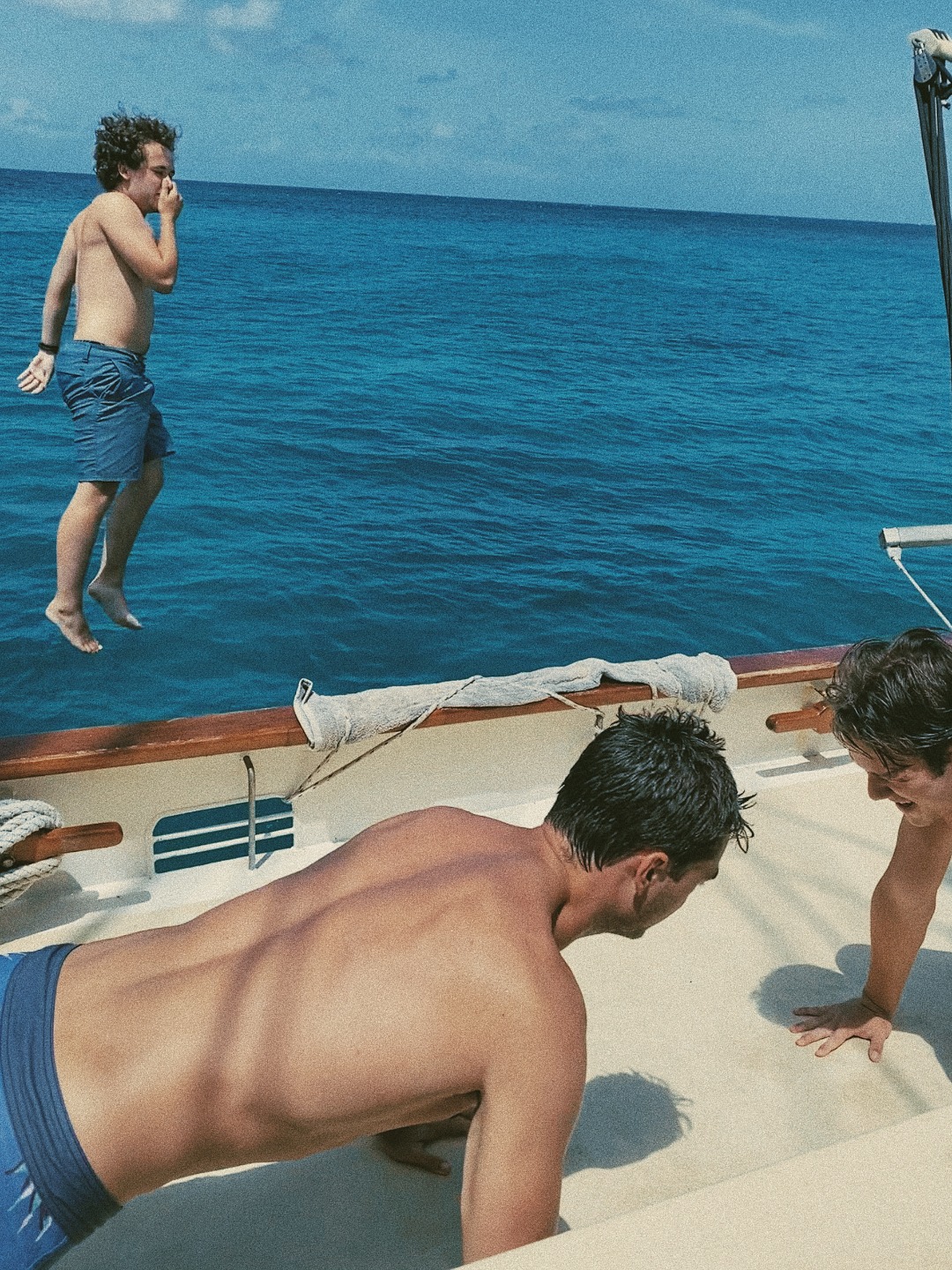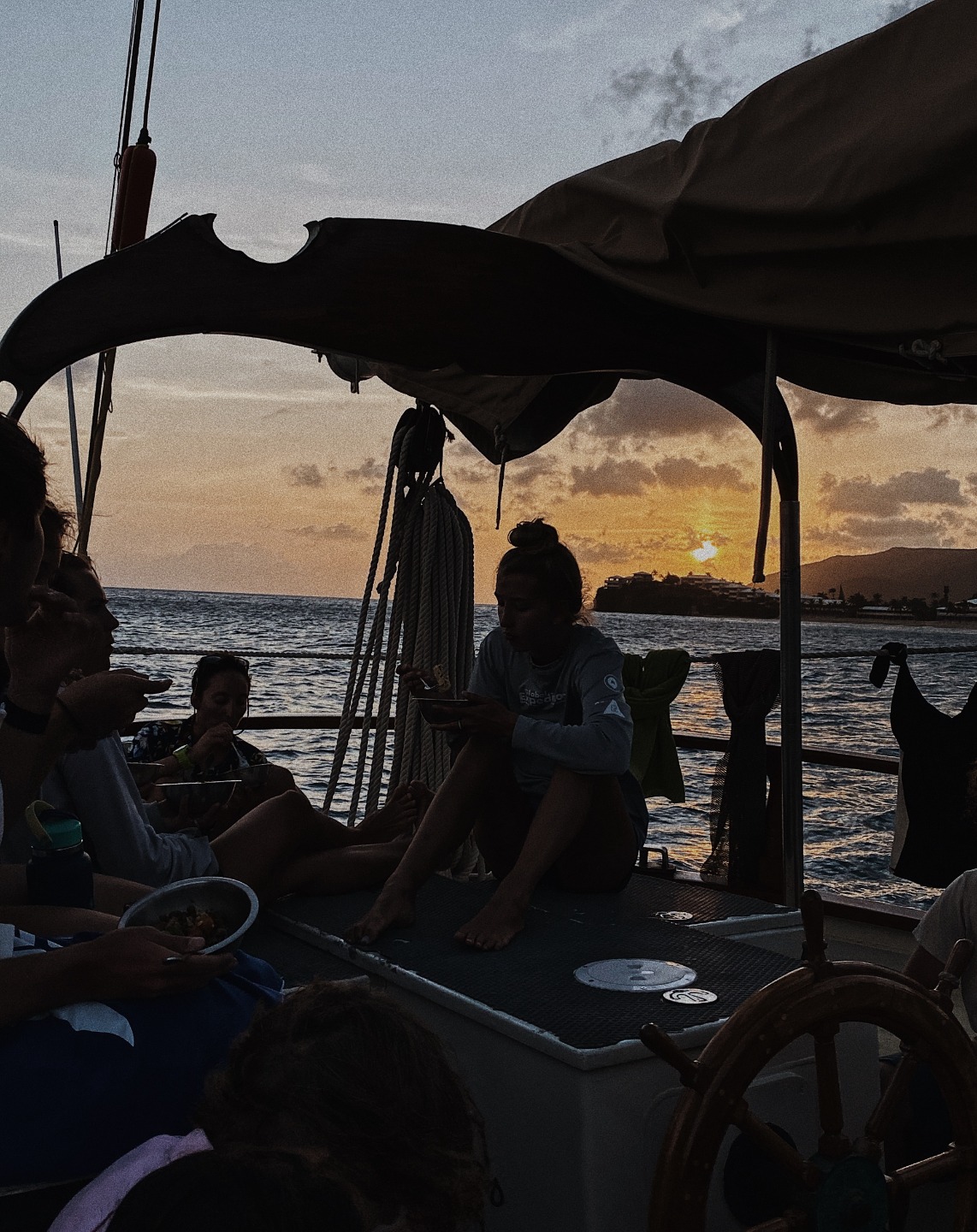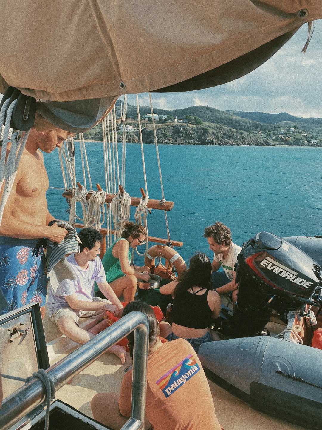 Howdy friends and family. This morning the galley was filled with the delicious smell of veggie scramble and the sounds of Jack Johnson Banana Pancakes. Everyone got up bright and early, excited for today. Once the deck was washed and the gophers closed the hatch until lunch, we began our day. We were split up into two groups where one would take the final exam, and the second would use their scuba gear for the first time. The first group celebrated passing the final exam with everyone jumping into the water and even making some friends with two people on jet skis. After, Jaden and Joel began their journey to being “swole” for the summer. While group one was having a dance party on the deck, group two was exploring the world under the sea. They honed in on their scuba skills and even saw a few schools of fish. We reconvened for lunch at around noon, where we all exchanged our adventures for the first half of the day. Afterward, the groups switched places, and group one began their start in confined diving, while group two prepared for their exam. Teagan and Jaden were able to find a large crab, while the others discovered schools of fish. Learning is never over. As the day was winding down, Jaden got a crash course on bringing up the dinghy with the moral support of the majority of the boat. We ended our day with our sea showers and even learned some french from Megan when deciding how to cook buckwheat. Everyone spent the rest of the night chatting about their adventures and their excitement for the rest of the voyage!