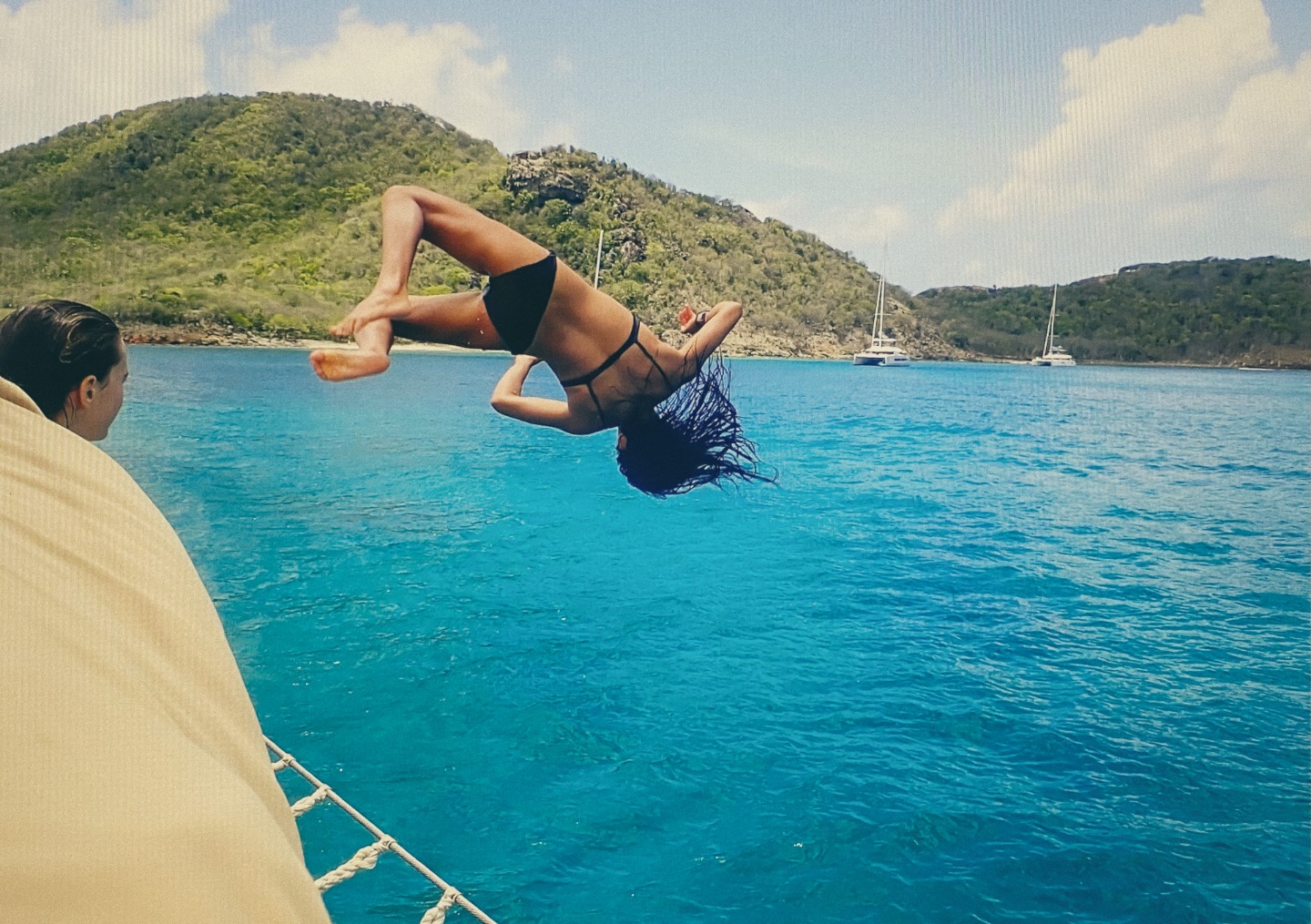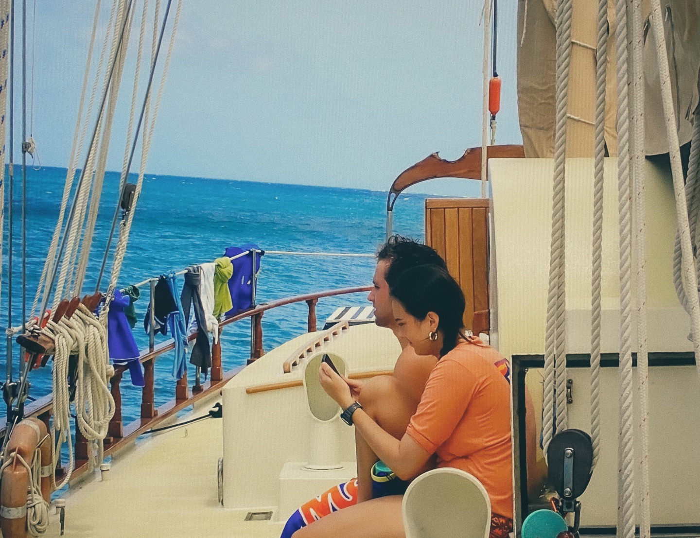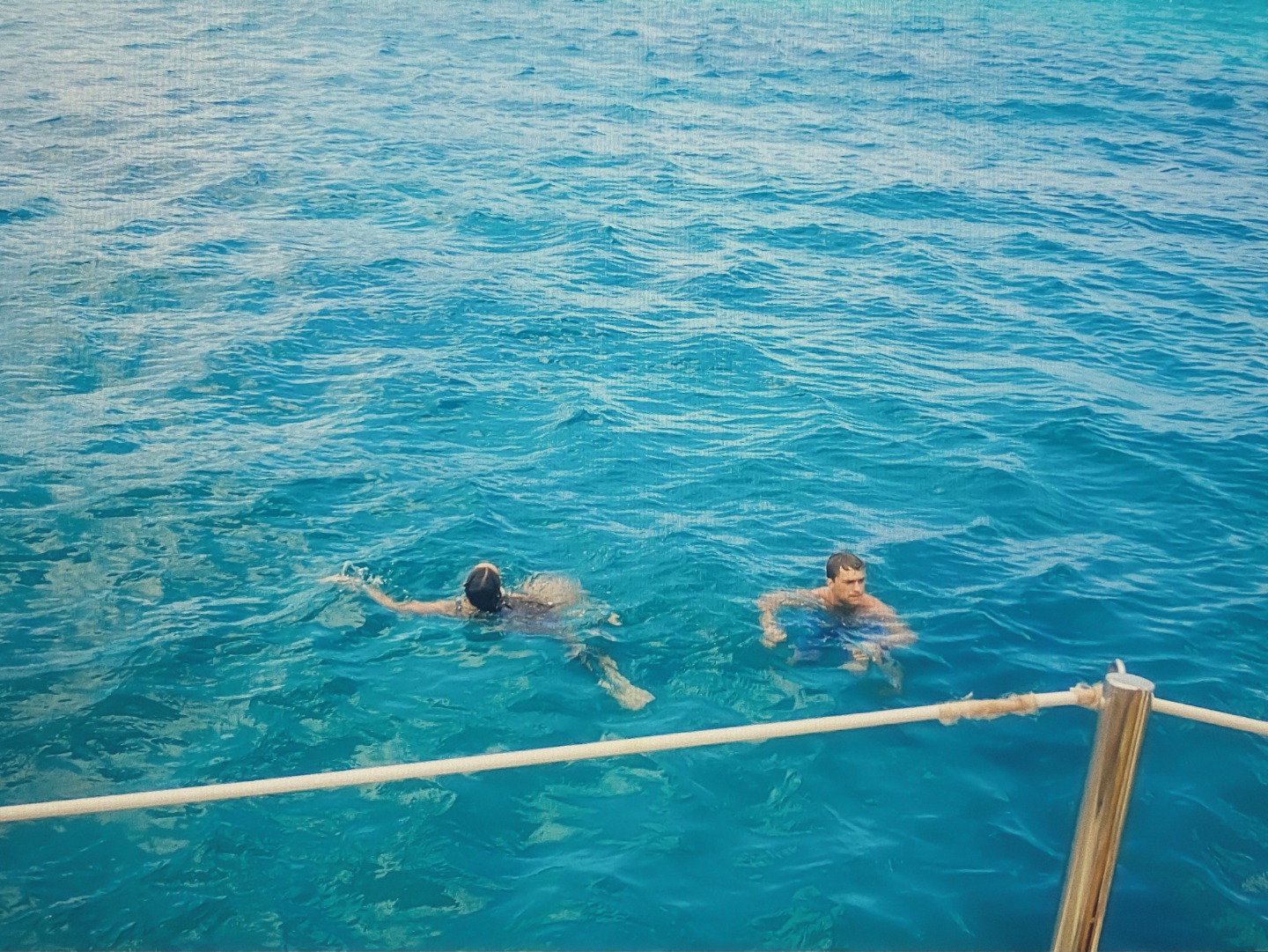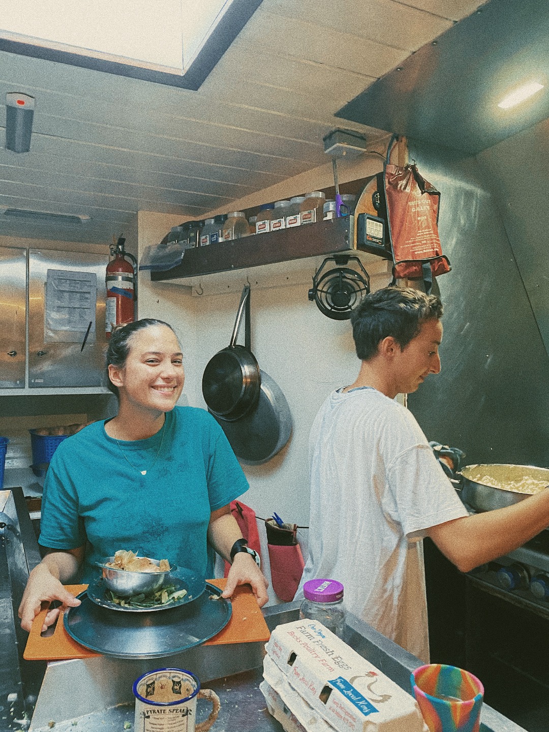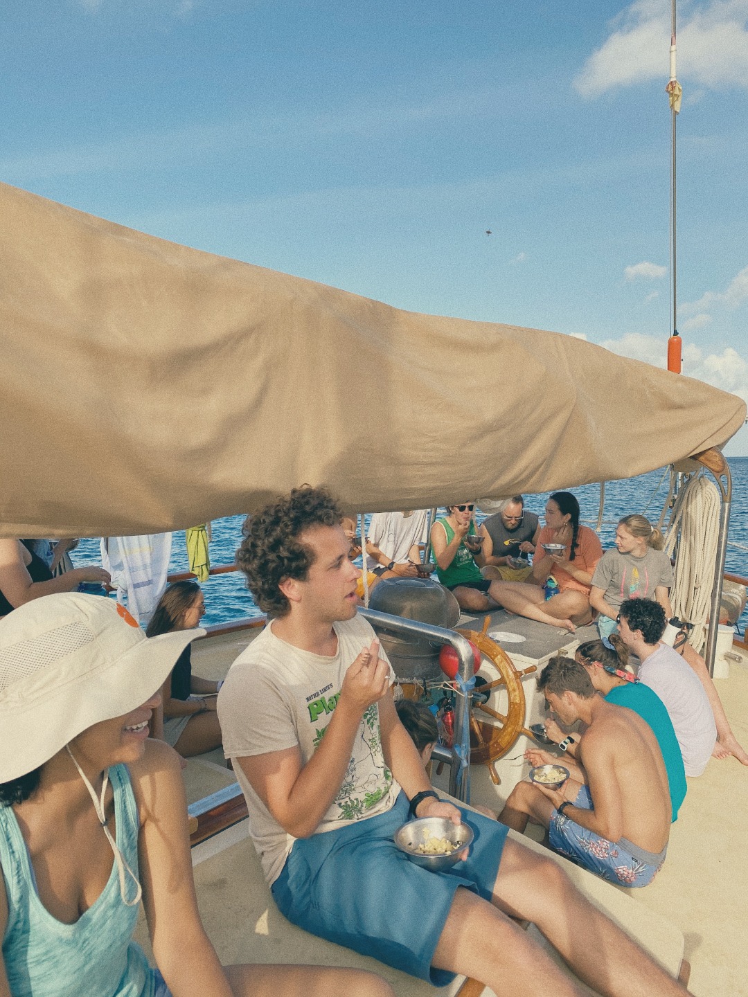 Howdy friends and family. This morning the galley was filled with the delicious smell of veggie scramble and the sounds of Jack Johnson Banana Pancakes. Everyone got up bright and early, excited for today. Once the deck was washed and the gophers closed the hatch until lunch, we began our day. We were split up into two groups where one would take the final exam, and the second would use their scuba gear for the first time. The first group celebrated passing the final exam with everyone jumping into the water and even making some friends with two people on jet skis. After, Jaden and Joel began their journey to being “swole” for the summer. While group one was having a dance party on the deck, group two was exploring the world under the sea. They honed in on their scuba skills and even saw a few schools of fish. We reconvened for lunch at around noon, where we all exchanged our adventures for the first half of the day. Afterward, the groups switched places, and group one began their start in confined diving, while group two prepared for their exam. Teagan and Jaden were able to find a large crab, while the others discovered schools of fish. Learning is never over. As the day was winding down, Jaden got a crash course on bringing up the dinghy with the moral support of the majority of the boat. We ended our day with our sea showers and even learned some french from Megan when deciding how to cook buckwheat. Everyone spent the rest of the night chatting about their adventures and their excitement for the rest of the voyage!