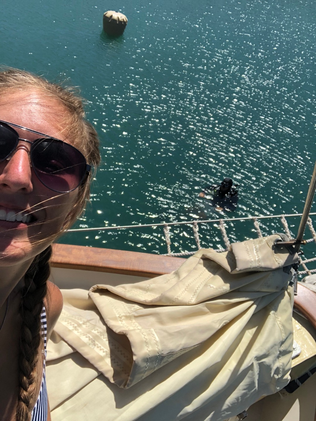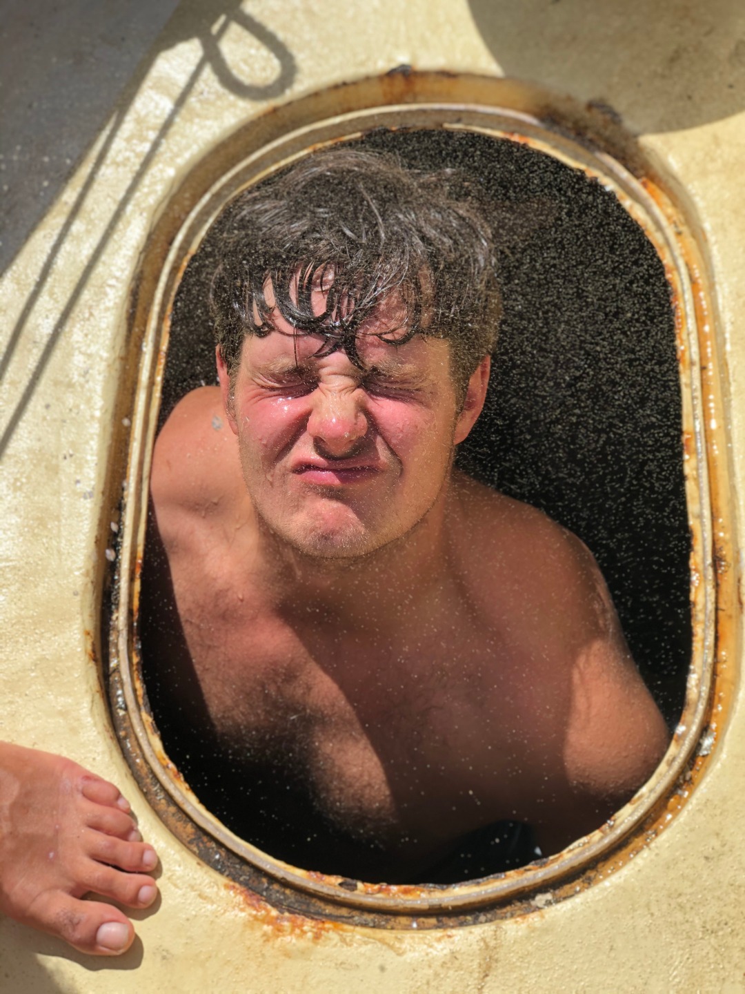 Picture 1: Selfie of the anchor lift crew while we watched Ash’s bubbles as we wrestled with the anchor chain