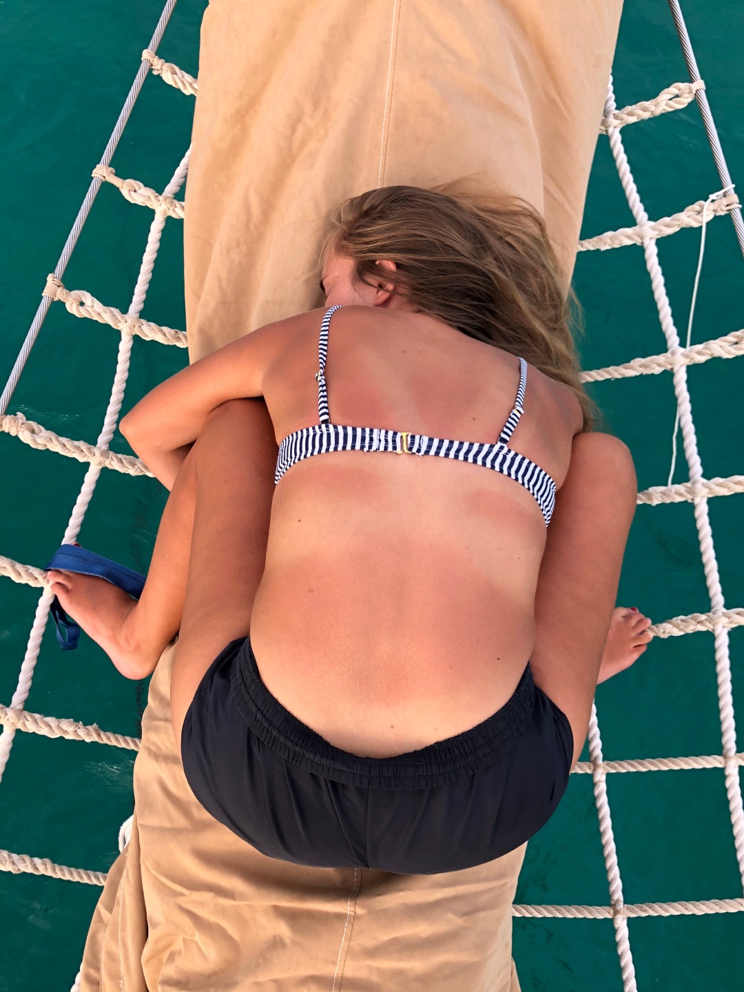 Picture 2: Your lovely skipper putting the jib sail cover back on, showing off my incredible PFD burn
