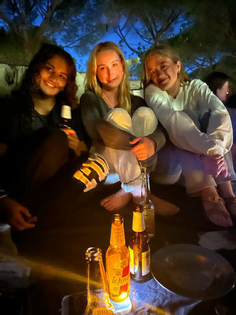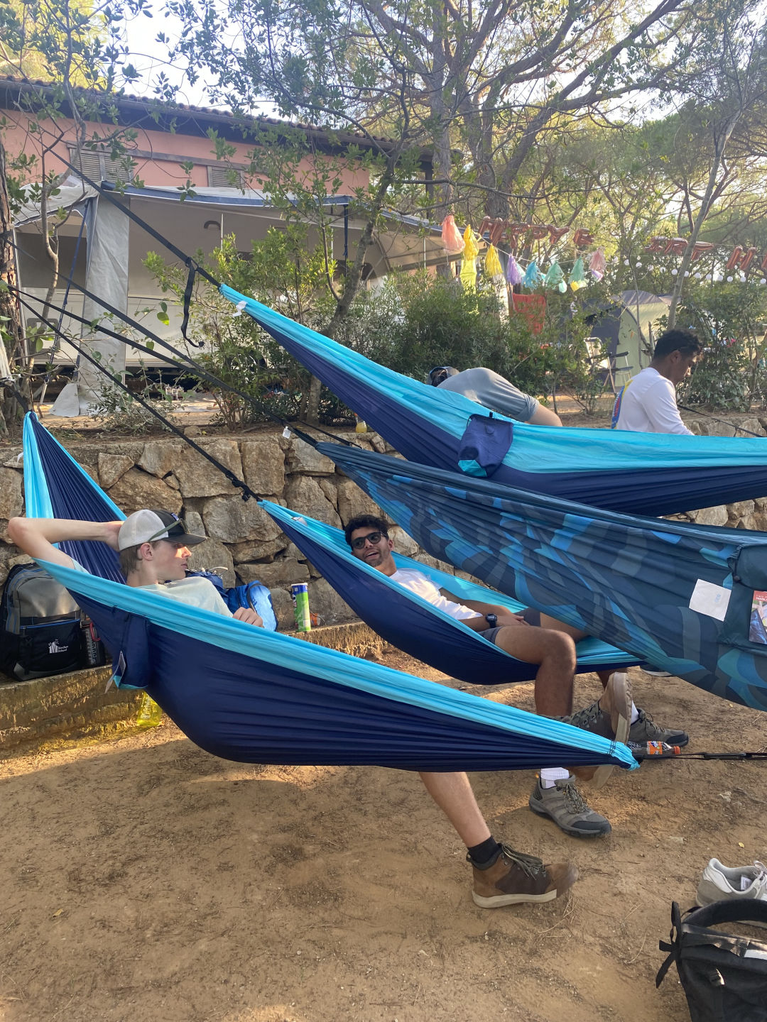 We all got gelato, and I really recommend pistachio. Then, we shopped and got snacks at the COOP grocery store, where everyone was stocked and ready for our camping trip. Joe got to see the boat lifted out of the water for repairs, and this is a very rare experience because, mostly, you never see Argo from that angle. A bus met us to take us to Lacona on the other side of the island, where we were met with 20-something hammocks set up by Amanda all by herself WHAT. There were double-decker hammocks. Caroline and I had our own double-decker, where she pulled an awesome maneuver to get up to the top hammock. We then raced to the beach on the Gulf dLacona, where there were no waves. The water was so salty that we would float. After the warmest showers in all of history, emphasis on the s. The best dinner yet happened as we dried off under the umbrella trees. A COOKOUT! Let me tell you that after an 11.5-hour hike, burgers and Italian beer are heavenly. Rob was especially excited about the beer and the beer lights, where we strapped our headlamps to the bottles to make a yellowish light from the liquid. We stayed up talking for hours, careful not to anger the Italian and German people at the campsites around us. Sleeping under the stars was one of the best experiences so far, filled with yummy burgers thanks to Anna and sore, blistered feetall for now from Argo.