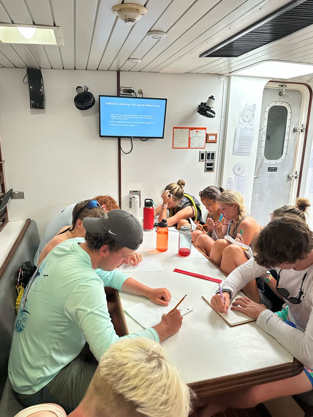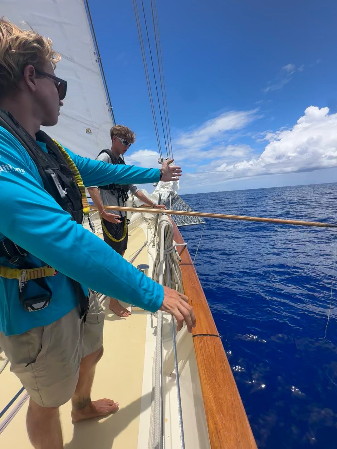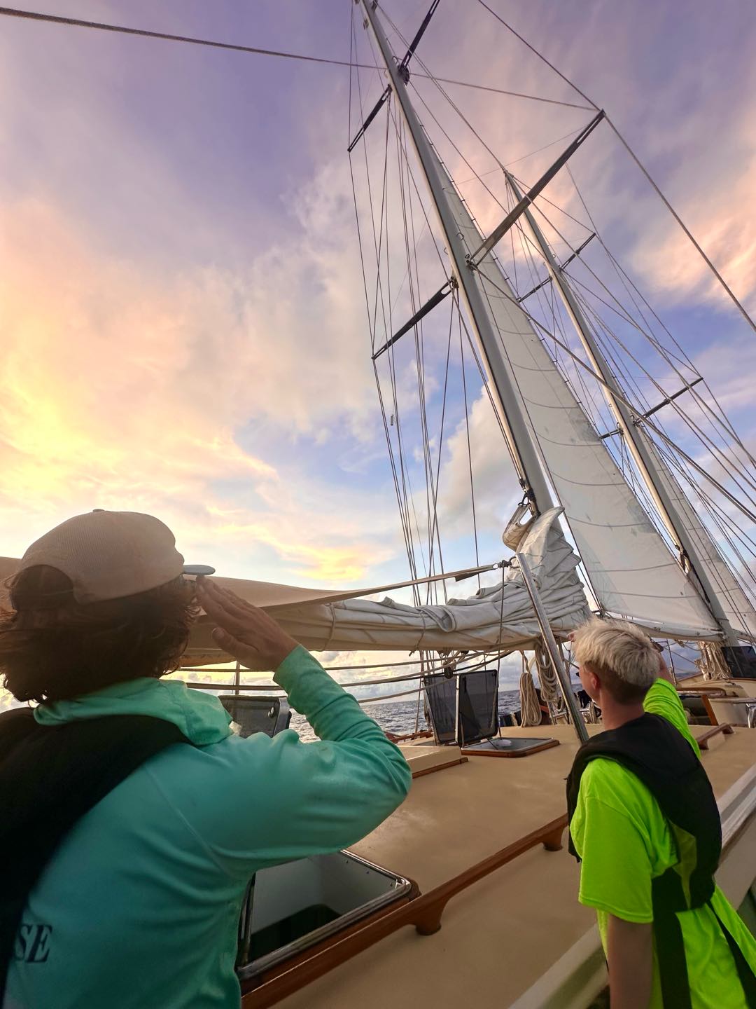 Since Nick is quickly going through his sweet treat supply, a true emergency, we are trying to get to the Azores as quickly as possible! However, still without any wind to sail, we continue motoring our way through Lake Atlantic and trekking our way north. Avery and Mimi took the opportunity to clean their laundry in the calm seas and were pleasantly surprised that it wasn’t as bad as they expected. In the spirit of cleaning, Watch Team 3 did a floor sweep and scrub down below. Down in the galley, Hayes cooked up chicken Caesar wraps while simultaneously playing Mario Kart and Super Smash Bros; turns out he is a master chef and multitasker. During lunch, Dylan spotted something floating a few boat lengths away, and Nick was convinced it was treasure, so we prepared to pick it up. Unfortunately, it was not a treasure map or a message in a bottle but just some old fishing gear. In leadership today, we did some reflective journaling and, of course, played a game. I also introduced them to their first big assignment, an autobiography essay. For many of them, it will be their first school essay that they have had to write the old-fashioned way, with just pen and paper. In seamanship, Charlie guest-starred to help with some practice problems plotting waypoints. For dinner, we ate another Argo classic: taco bowls! While many people were scared of the soya protein at first, in the end, they were s”rprised that “it actually tast”d kinda good.” During dinner, clean Shane and Rooke found some loose water bottles and, concerned for their safety, promptly hoisted them up the flag halyard and saluted them.