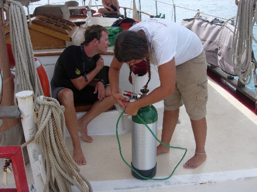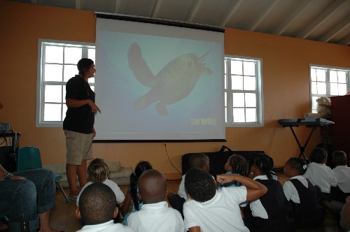 This morning, we headed off to St. Mary’s Elementary School to educate the students about the environmental hazards that plastics present in our oceans. We prepared a slide show and participated with the students in drawing scenes of how garbage affects the oceans. They were very enthusiastic about marine life, and they even performed the song “Under The Sea” for us. It felt very rewarding to interact with young people about something we feel so passionate about and to witness their little minds working and getting excited about the ocean as well. The day continued on with a motor to Gorda Sound, where we were unexpectedly surprised with our final rescue diver scenario. We had to rescue an unconscious diver, performed by Simon, as well as a diver with decompression sickness, as performed by Dan. We conducted a safe and successful rescue and are now certified rescue divers. This great day was topped with Curry’s famous chicken parm and a conch-blowing competition between Sam and two other boats in the anchorage. I’ll have to say Sam has a lot of wind in him!