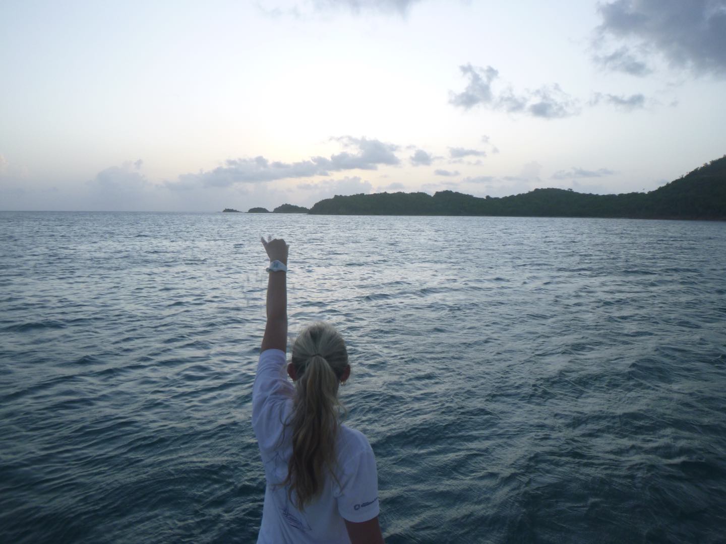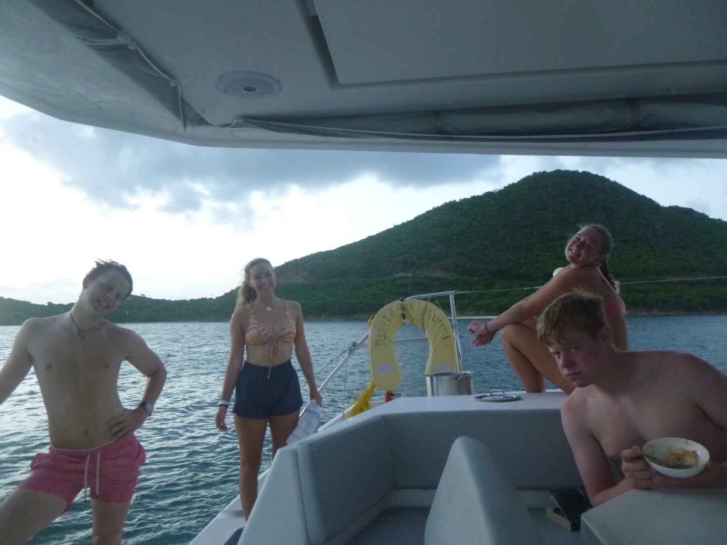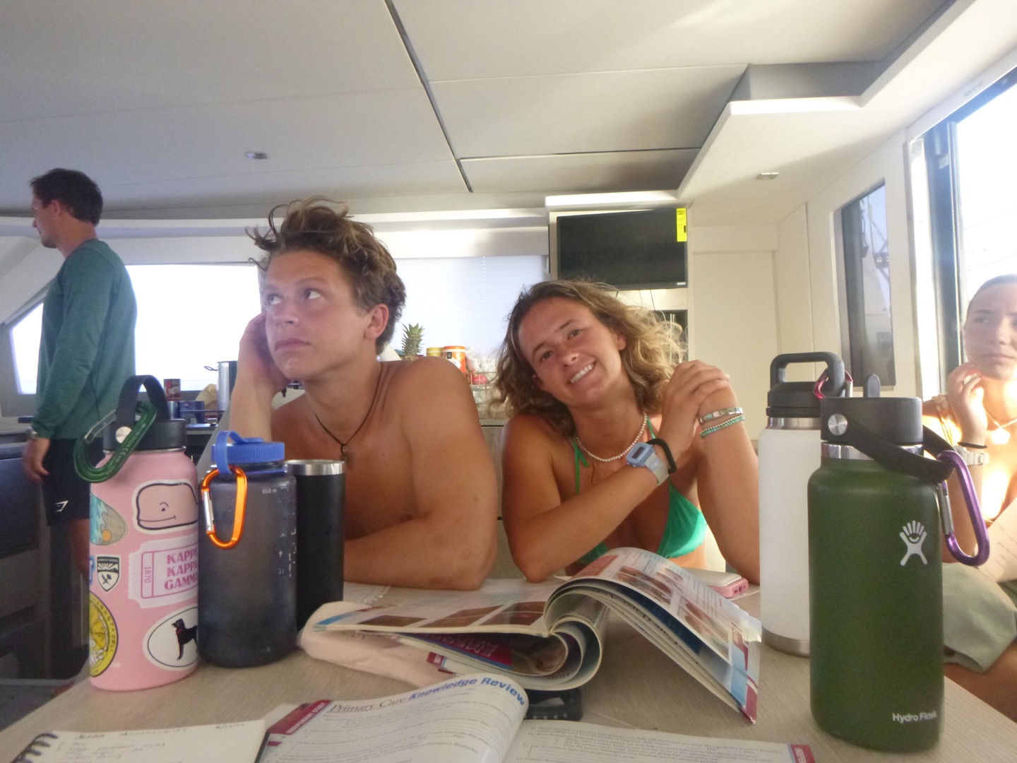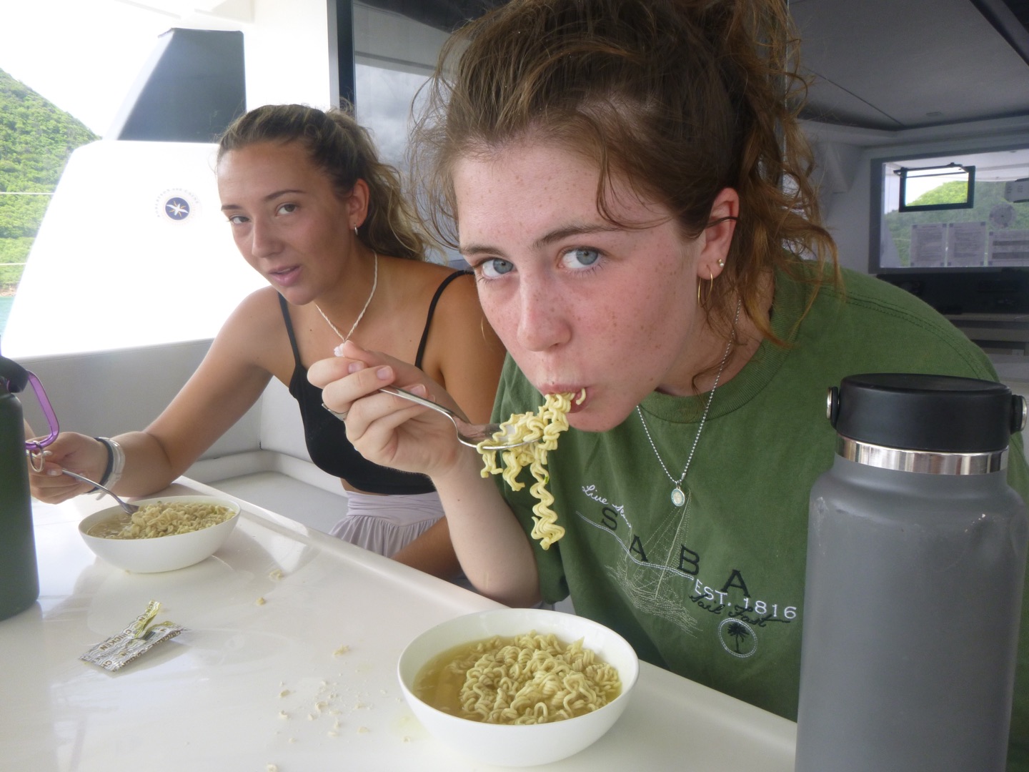 Last night during dinner, we were informed that there was not one, but two storms headed our way, one being a few days away. Because of this, we had to change our course once again and scratch our plan to sail to St. Kitts and Nevis. Instead, we basically had to drop everything and begin a delightfully short 16-hour voyage to Antigua, where we would camp out the rest of the trip. After quickly securing everything on the boat 40/40, Arlo went into (very minor) foot surgery to remove a mystery splinter via tweezers and a headlamp, performed by Maddie and Griff and spectated by all. After digging around in his foot and having no luck, they gave up and went to bed. Prolly for the best tho, when is he not running around causing a ruckus, at least hell be somewhat slowed down for now. Spirits rose when it was time for watch team 2 to take over between the lively hours of 1 and 3 am (the best watch team consisting of Paige Arlo and I). We had a lovely time singing the Pitch Perfect riff over and over, as well as doing bow watch, where we were sprayed with ocean water and strapped in to avoid being thrown off. After finally anchoring around 2:00 pm, we finally got to indulge in our nutrient-filled lunch of chicken ramen noodles. The rest of the day we were just doing our best to stay awake. We learned about rules for CPR, ship knots, and different fire extinguishers to use during various boat emergencies during our ICC and EFR classes. Finally, at dinner, we had some delicious curry, broccoli, and rice, which afterward was thrown at me, but also into the water compacted into rice snowballs. Check out my awesome follow-through in my shot of the ocean pictured above. Everyones pleased that that was our last passage of the trip, especially Katand now everyone else just gets to chill and listen to my speaker instead of my own awful singing of pitch perfect.