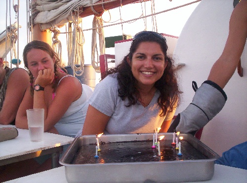 The skipper greeted the pristine morning with the echoes of the fire alarm at 06:50. All hands reported on deck in a hasty/groggy manner and then on to their muster stations to fight the simulated galley fire. Things improved vastly from there with boiled eggs and toast for breakfast. The day consisted of an oceanography quiz, an MTE review, and an all-vegetarian dinner, including a birthday cake followed by Venezuelan chocolate bars (Nuggles and Bonanzas), chefed up by Beaker, and a birthday party for Lisette. The crew is still dancing as the skipper begins to fade.