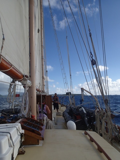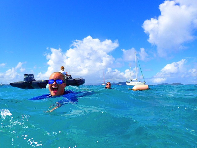 After finding our way back to the beach and swimming back to the dinghy, we were back on Ocean Star. We got ready for a short motor to Salt Island, where we were going to dive. While Ocean Star stayed anchored in a protected area off the north coast, the majority of the crew split into two dinghies to drive to the dive site: The RMS Rhone, a shipwreck broken in several pieces. We, the ones that stayed on board, raised the anchor with a five-person team and moved further west to pick up the divers on our way to Peter Island. Once we picked them up and got all the dive gear in the laz, we continued our way to Great Harbor Peter, where we moored. By the time we got there, it was time for dinner: Hamburgers fresh from the BBQ. It was a good day!