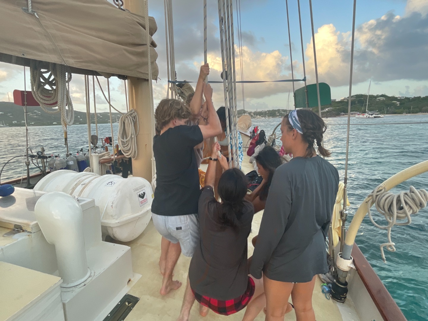 What up, my peeps and dudes! Once again, great day on the S/Y Ocean Star! The crew started their day off with some BOMB pancakes made by none other than Chloe Grace and her two trusty sous chefs, Joel and Maria. After breakfast, we did some hands-on learning with transects and quadrants to begin studying the underwater world. We had to be back on the boat quickly, however, because the doctor man Diesel was waiting at the docks to give everyone the gentlest covid test ever received. Whilst waiting for our tests, the men decided to take some gnarley quad pics to show off the gains they’ve made! Nobody really knows what the girls were trying to do, but a cool picture turned out of it! Once the crew returned, many of the students finished their certifications for scuba diving, while the others attended class. To end the day, we gathered around for dinner and asked the hard-hitting questions… What superpower would you have? Everyone is doing an amazing job aboard, and there is nothing but love and joy here every dayshoutout to Marles.