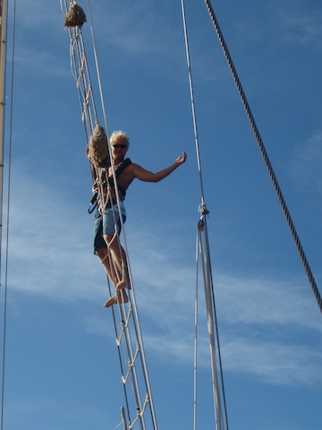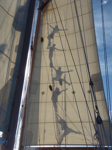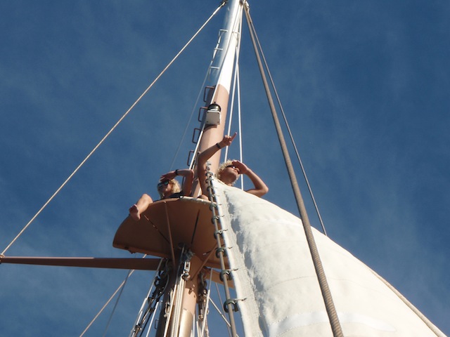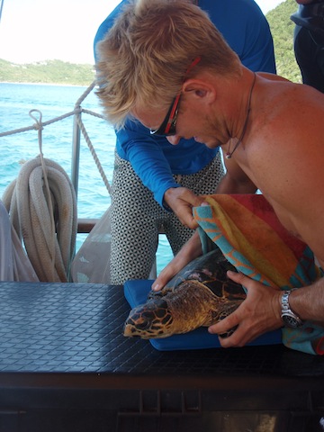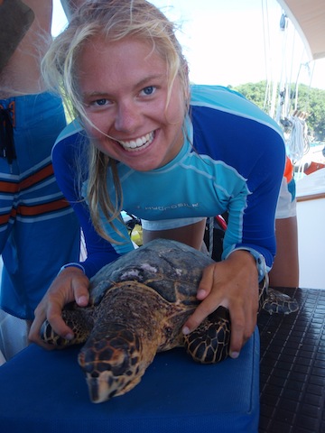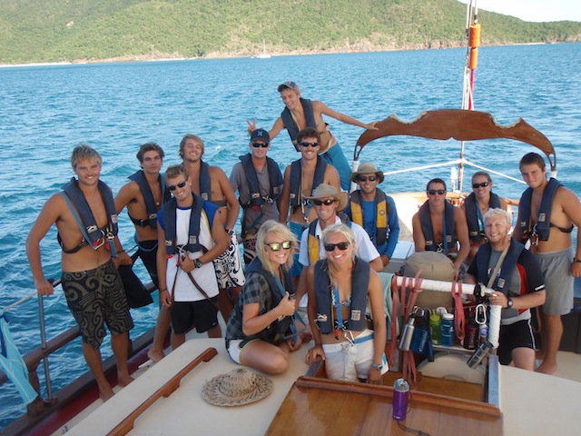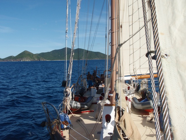 Since we are in the BVIs, we are allowed to tag turtles because we have a research permit. So tag them we did. It was a crazy mad dash of everyone in the water chasing turtles. Four people get dragged behind each dinghy with their heads in the water, trying to spot a turtle. When someone spots something, everyone cooperates to catch it. You swim down and sneak up on it, literally just grabbing onto the top and the back of the shell and swimming them up to the surface. The only catch of the day was made by Eric Burnett and his super awesome mustache. After everyone settled down, we prepped Ocean Star for her last sail of the trip. It is a sad thought. It’s also a very big change from the beginning of the trip, which felt like only a couple of weeks ago when everyone was a total muppet and had no idea how to sail this thing. All the sails were raised smoothly, and we were able to sail off of the anchor without starting the engine. From there, the short passage to Sandy Spit was a fun one. Sunshine was wearing a funny hat, Brendan’s sunglasses were apparently magic, and some shenanigans went down. When we arrived, it was shower time.