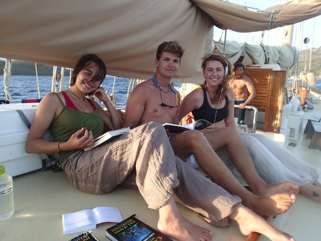 Today, we had the same wake-up time, but the chefs were on top of it, and we ended up having an early breakfast, which turned out to be a good thing, considering that as soon as we were all finishing up, it started to rain. Thankfully, the Caribbean rain never lasts long, so after about a 5-10-minute respite, we could continue with our normal schedule. We all went back on deck and then split into our watch teams to finish up our emergency First Responder skills. That required a lot of acting but resulted in mostly laughing. I am happy to report we all passed our scenarios and are now EFR-certified! We then had SLD, where we talked about understanding others and how important it is to learn to put yourself in other people’s shoes – important things to think about when you live this close to so many people. We then went to shore for a few hours, and most of us spent our time eating lots of delicious food, walking around exploring Les Saintes, maybe a little shopping, and catching up with people via WiFi. Once we got back to Ocean Star, it was shower time and dinner, and now we are getting ready to watch a video of a great white shark dissection for marine biology!