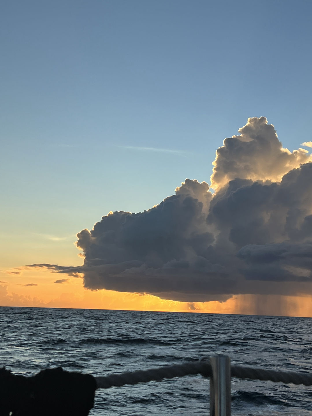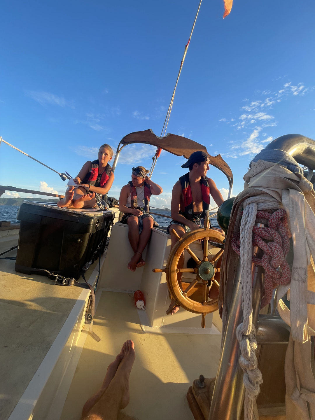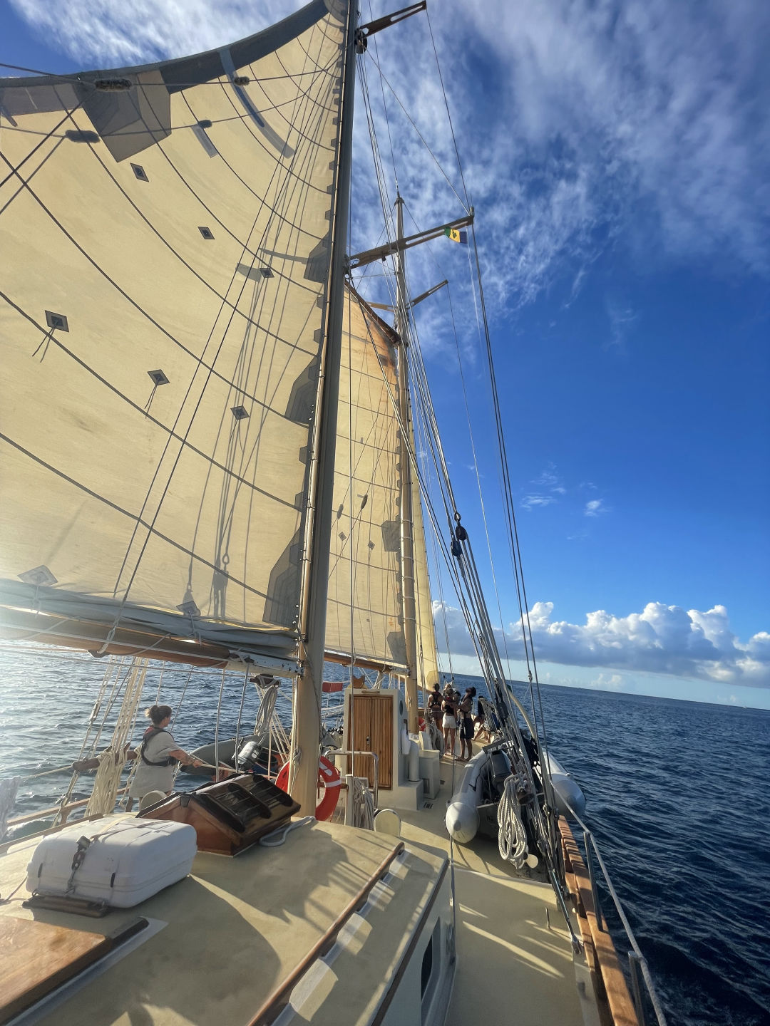 …ok, never mind, it’s now 10 pm. We’ve just left the cover of St. Vincent, and the wind is whipping like crazy. Ocean Star is heeling so far to port I feel as though, any moment, she’ll give out on us and tip over (realistically, we were totally fine). Once I get over the initial panic, with help from other watch teams, we (watch team 3) centerline the sails and lower the foresail in the darkness, cracking up as we fall all over each other with each gust of wind. The bow bounces on each wave like a Cadillac, hitting us with sea spray as it comes back down. After what feels like ages, the sail is down, and we take our wet butts back to the cockpit to be relieved of watch duty. Today was a great day, and I’m really proud of all the hard work the crew put in to get us moving.