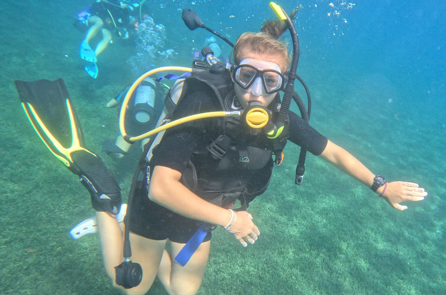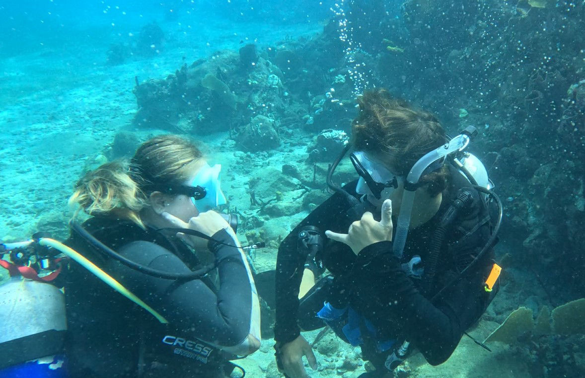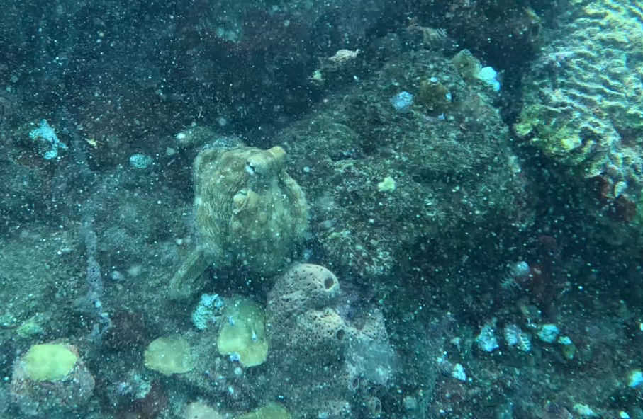 The morning started with delicious banana bread to fuel everyone for the dive that some later called “the best dive yet.” After everyone was stuffed, it was time to break up into dive groups, gear up, and jump in. My group went in first and, after a brief surface swim, spotted what appeared to be an octopus home. We decided that was a great place to start our dive, so we descended down to find our first octopus friend of the dive. The reef wall was full of marine life with many eels, schools of brown chromis, and so many smooth-trunk fish (the fish that quickly became most people’s favorite fish to see). As we swam along the wall, I was surprised by our second octopus as it swam quickly past my head (using jet propulsion, as everyone learned about in my lecture last week). We then got to watch it walk along the wall and change colors (using some chromatophores that we also learned about this dive, which was practically a study session for my next exam). Once we hit the turning point, we headed back, waved to Heather and the other group on our way, and found our final octopus of the dive before heading back to the boat for lunch.