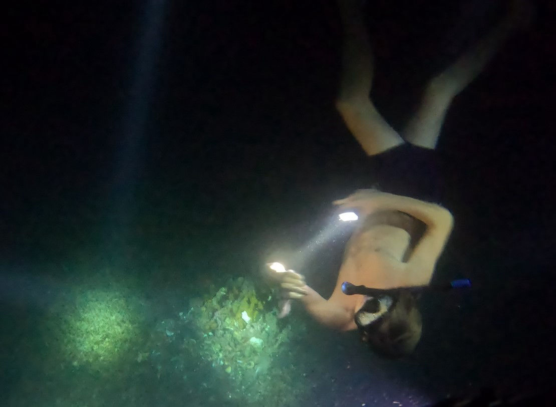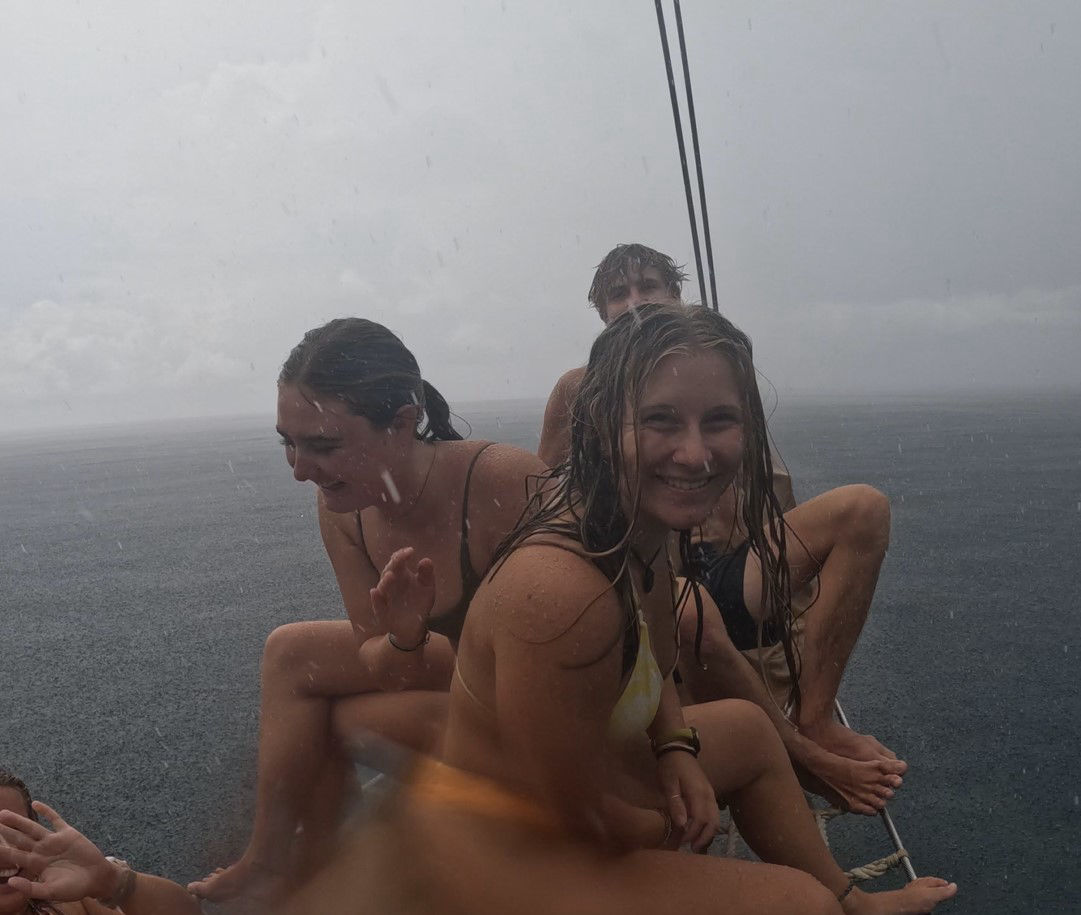 Lunch was delayed a little due to a rainstorm and an impromptu swim to the beach. Some enjoyed the time for an extra fresh water rinse, while others opted to use it as “spa time.” I’ve heard the black sand on the beach is an excellent exfoliator. With nice rejuvenated skin, we made the swim back to the boat for some stir-fried rice to fuel everyone through an afternoon of classes and passage prep. I had a review session for an upcoming marine biology exam, and Heather taught a class about the gases and nutrients in the ocean. As everyone was learning all the tasks involved in passage prep, the boat was quickly prepared for our sail tomorrow, and the crew enjoyed some free time before dinner and their night snorkel on the reef. As I’m writing this blog, I can hear them yelling about the octopus, so I think they have found our friends from this morning again.