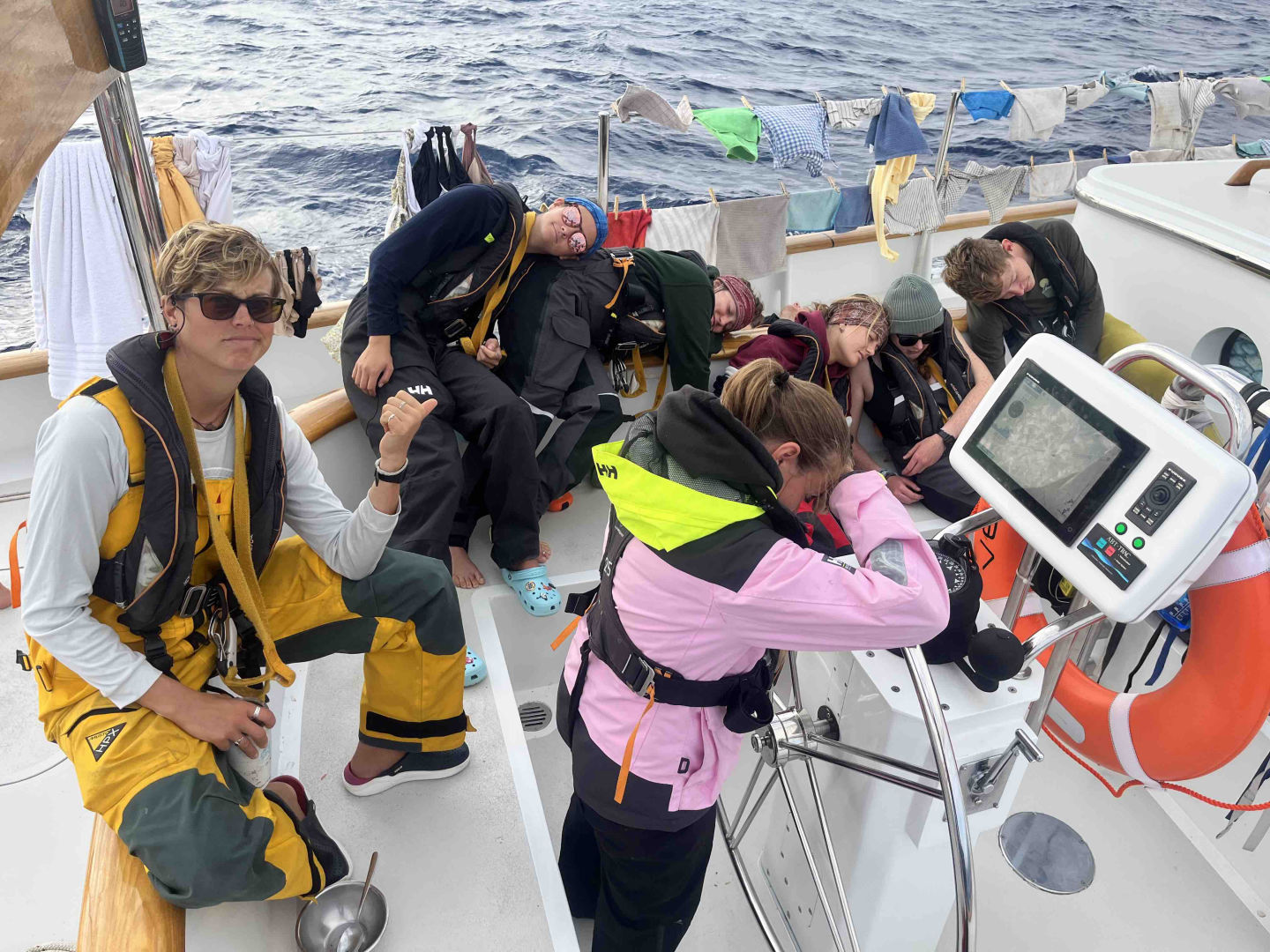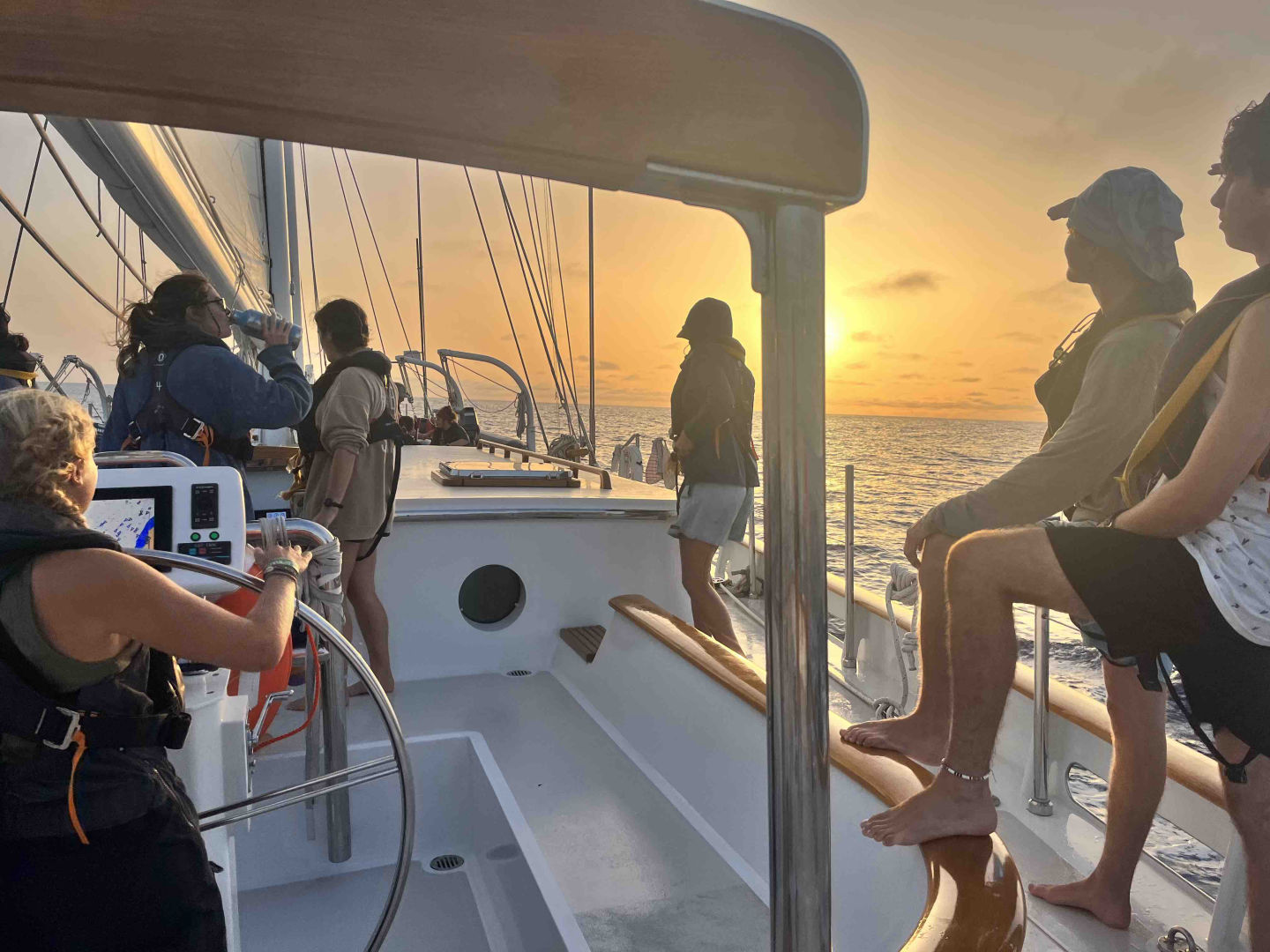 Unfortunately for watch team 1, our next watch started at 8, so we had to roll out of bed 2 hours later. 08:00 to 12:00 was a blast. Sophie and I did a boat check and added it to the engine room selfie collection. Asa was Asa. Skyler and Hendo worked on the fishing line that had been tailing Vela for about a day. Skylar got slap-happy again (this time morning edition!) Carolyn and most of the team posed for magnificent photos. After our fabulous photo sesh, we raised the main sail as well as the jib. As you can clearly see, watch is not a task for the faint of heart.