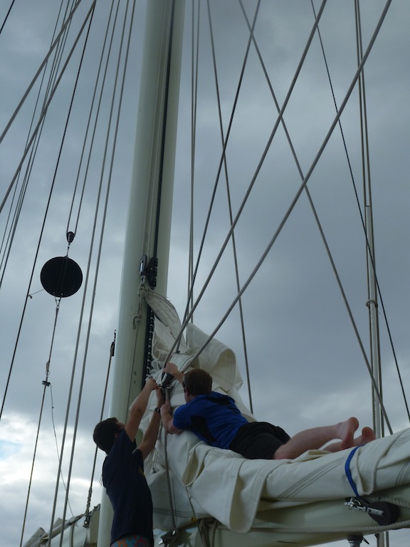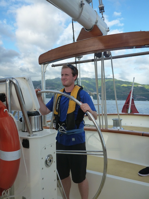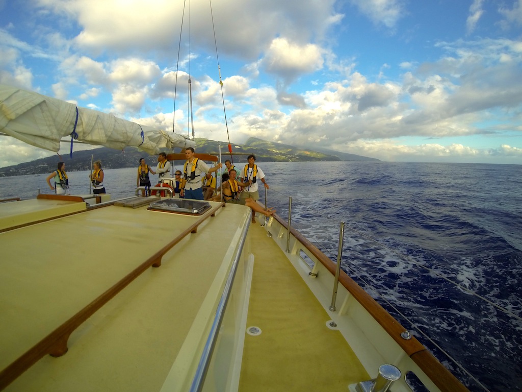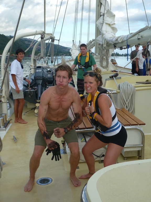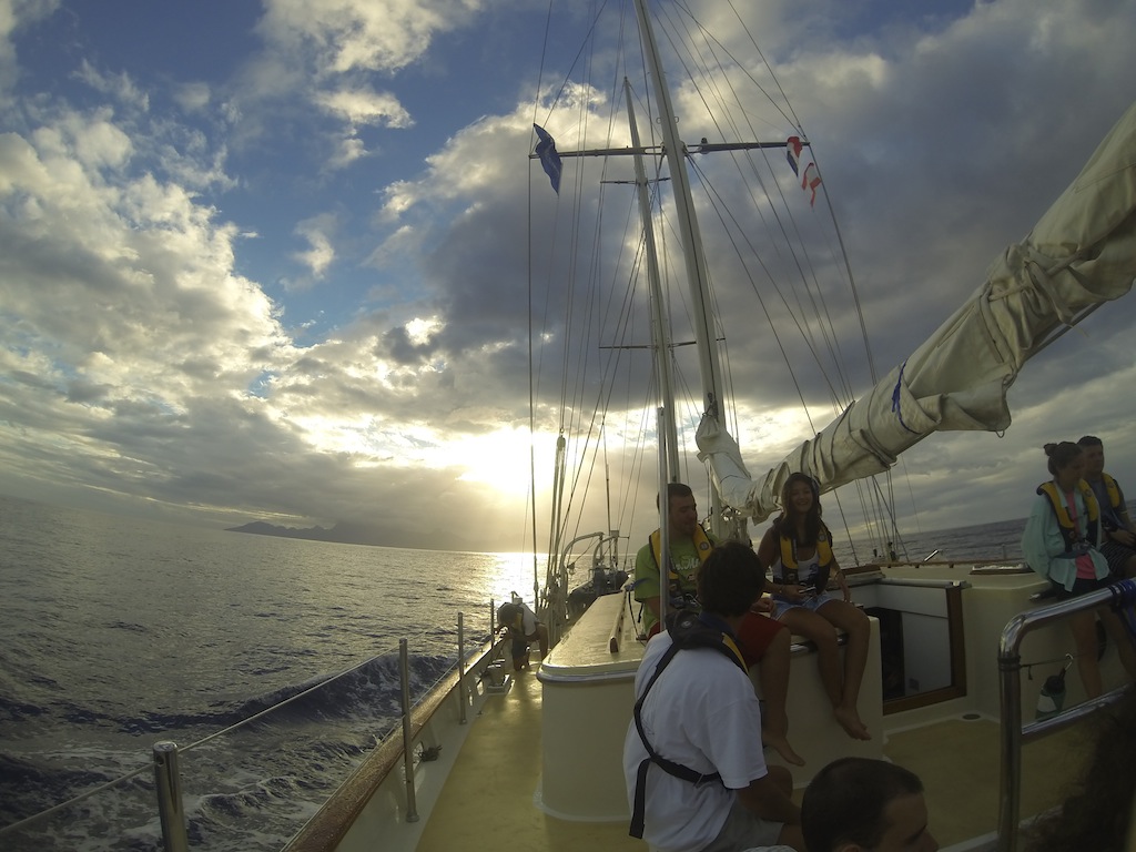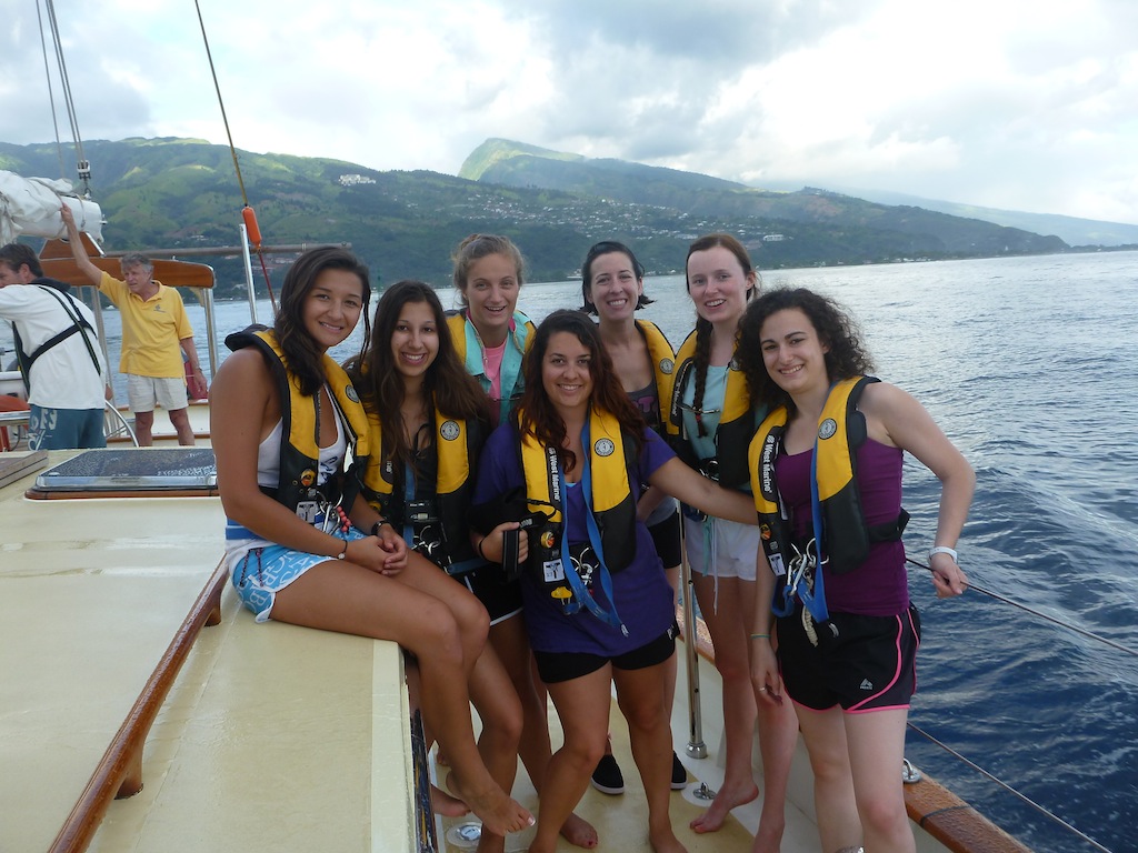 Easiest day as skipper ever! At the early hour, 7 o’clock this morning, every soul aboard Argo was up, dressed, and exploring their new home, meaning that all that had to be done was a little preparation for the morning jobs and then dining on fresh zucchini bread, fruit salad, and yogurt. After this, Jim regaled us with stories of the mutiny on the Bounty and the origins of breadfruit in the Caribbean. The day then started in earnest, with dishes and decks to be washed, sun tarps to be put up, galleys and saloons to be cleaned before the morning talk, and then some free time, which was spent by most on a local Tahitian beach. After lunch, there were proper boat introductions to all areas before a short passage prep for the 18-nautical-mile trip to the neighboring island, Moorea. Fun was had by all on this short first passage, which was a little rolly at times, with a few discovering that below deck was not necessarily where they wanted to be. Darkness had fallen by the time the anchor was dropped, but once we were safely at anchor, we all gathered in the cockpit for dinner, where stories and jokes were shared by all. To finish off this day of firsts for many, there was the Argo shower (a specialty of the boat), during which many attempted their first-ever front flips- with varying success! Hammocks have been strung, and the anchor watch teams briefed! Let’s hope it doesn’t rain tonight!