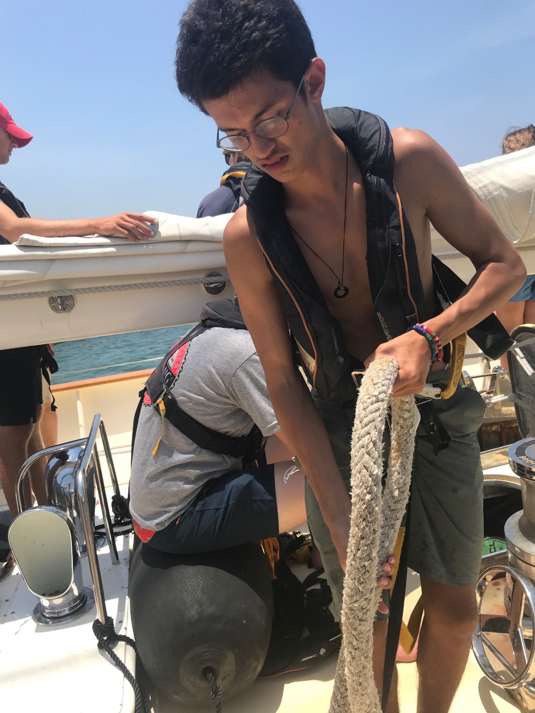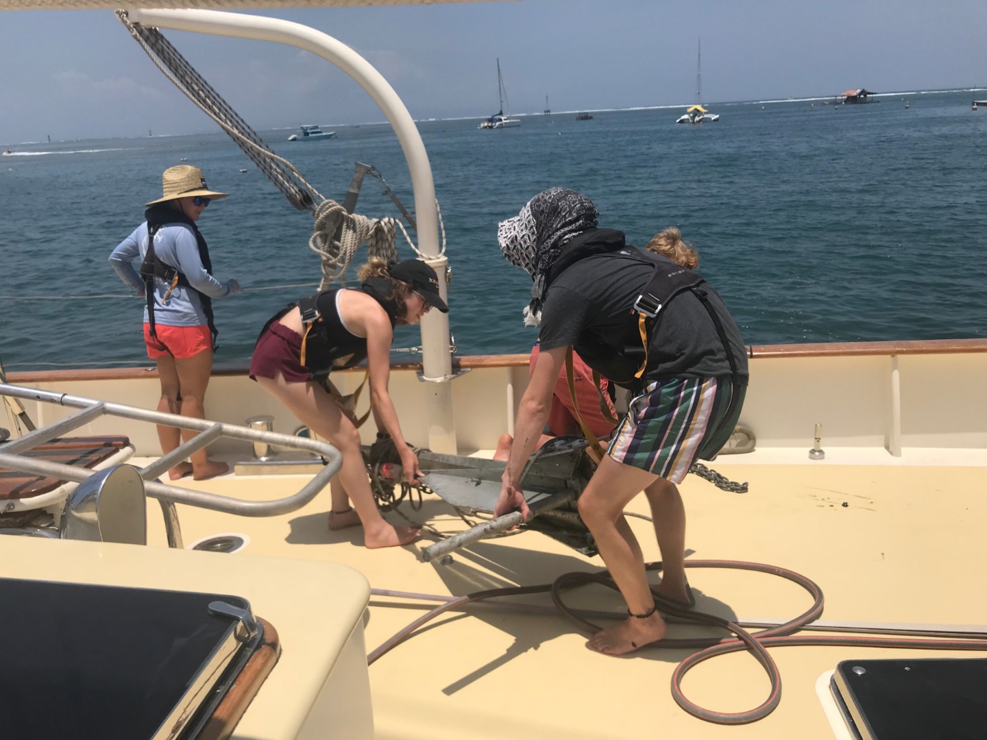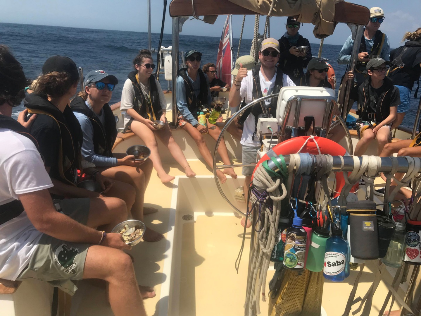 I am so sorry for the delay of this blog post, but yesterday evening got a little tough: The day started off with a beautiful cinnamon muffin breakfast followed by a Seamanship class in which we began learning some essential knots. The day then aimed its way towards Christmas Island with a super-efficient passage prep and exit off the dock. It was high afternoon, the sun was shining brightly upon our fried shoulders (I promise I’m putting on plenty of sunscreen, mom!), and the seas were sloshing high: 10 to 15-foot waves began rocking the boat back and forth. To get right to it, about a third of the crew spent the afternoon and evening with their heads over the side of Argo, praying that the seasickness medication would quickly kick in. I, as some of you may have deduced at this point, was part of that lucky third. However, as much as seasickness wants to debilitate your body, there is something about being in Indonesia, after visiting the most amazing islands you could think of, that just keeps you from thinking negatively or feeling truly bad – staring at a computer screen just wasn’t possible at that time. What is also truly heartwarming is the sense of selflessness that the entire crew has been radiating, as we grow closer and begin to understand the true meaning of “Ship, Ship Mate, Self”: while the third of us were temporarily incapacitated, others picked up the slack with no hesitation, offering to do jobs that were not theirs, while also offering water and comfort to the sick. It was a beautiful, stinky moment of familial bonding. As of right now, we are only half of a day into our crossing to Christmas Island, and the seas are still rocking pretty high. I hope all is well back home and all over. The 24 of us are having the experience of our lives, and we can not wait to share the boundless gratefulness we have for all of you who allowed us this opportunity. Here’s to 67 more days of unbelievable opportunities and untamed excitement.