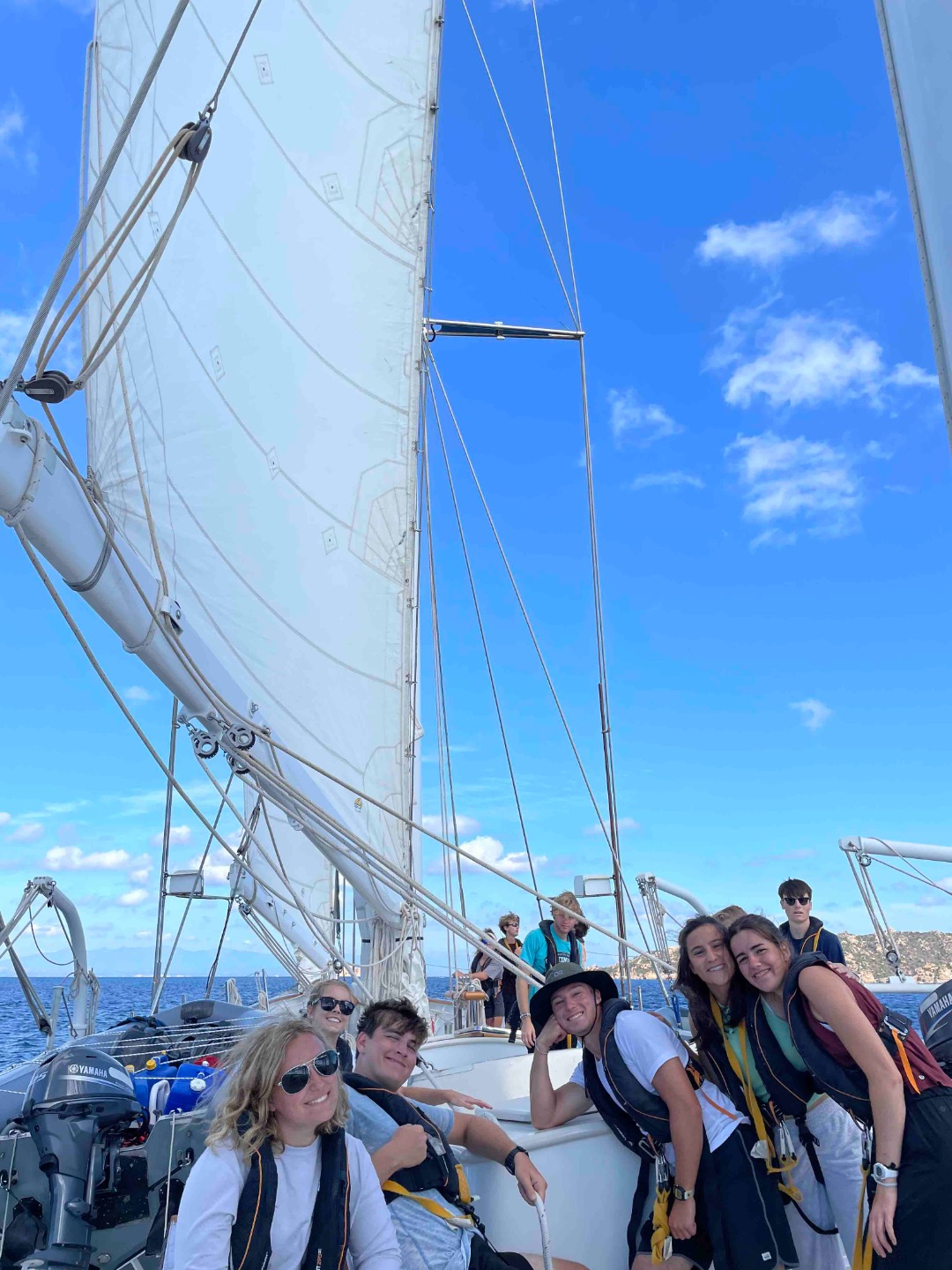 Photo 2: Some of our crew as we prepped for passage. Front row left to right: Liz, Emma, Joe, Akiva, Dani, and Clara. Hanging out in the back, we have Shona, Charlie, Jack, Declan, and a couple more hiding back there.