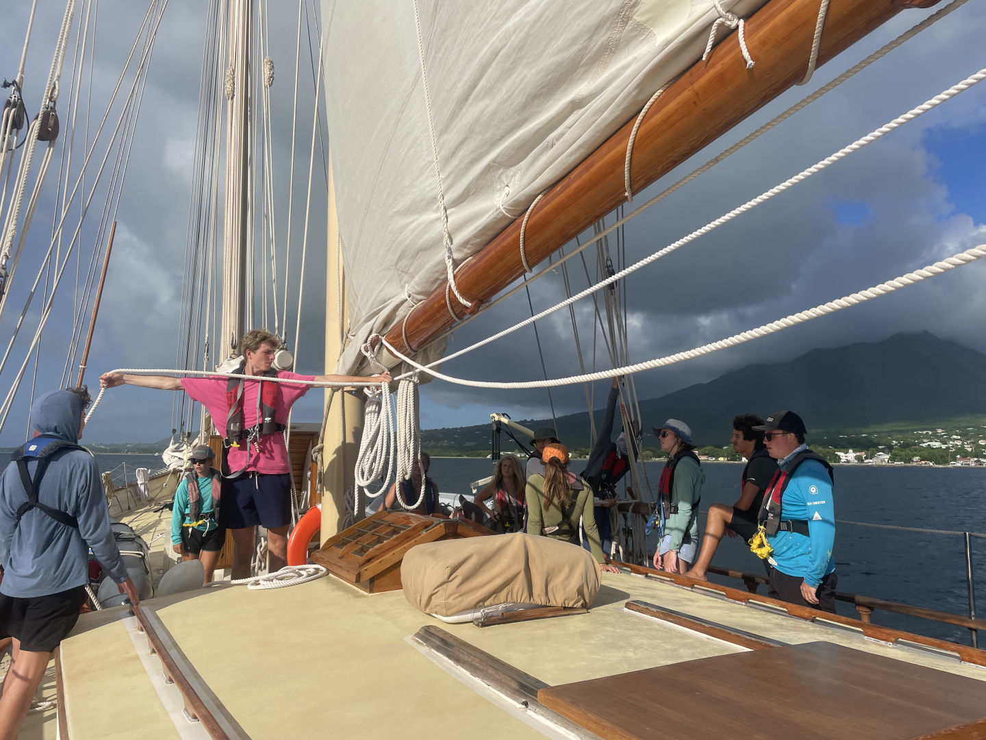 Last but not least, after we slipped off of our mooring ball in Nevis, we got the sails up, and with clear blue skies all around, a small shower cooled us off and made a massive rainbow over the green jungle-covered-volcano that is Nevis. What a lovely goodbye. With all the sails up, we had a drill to practice our response to a man overboard emergency and successfully recovered the float we threw in as our “casualty.”