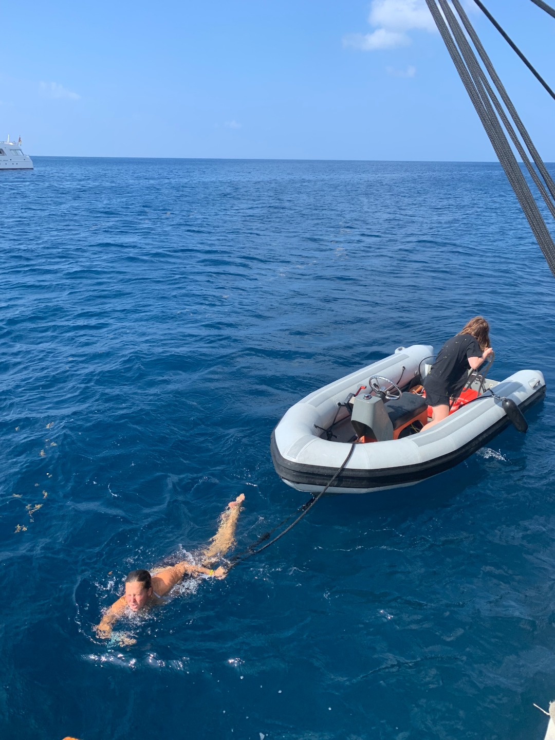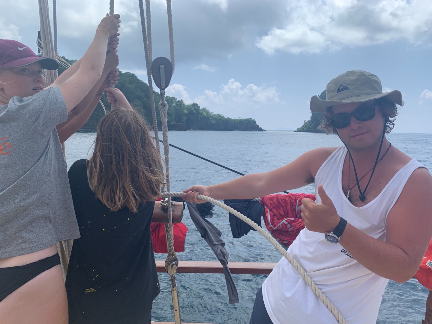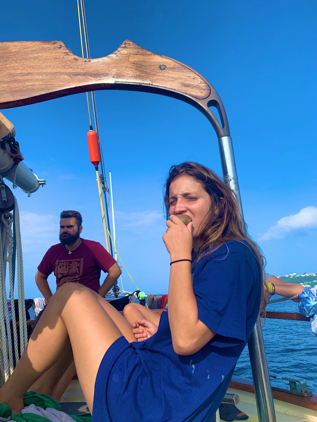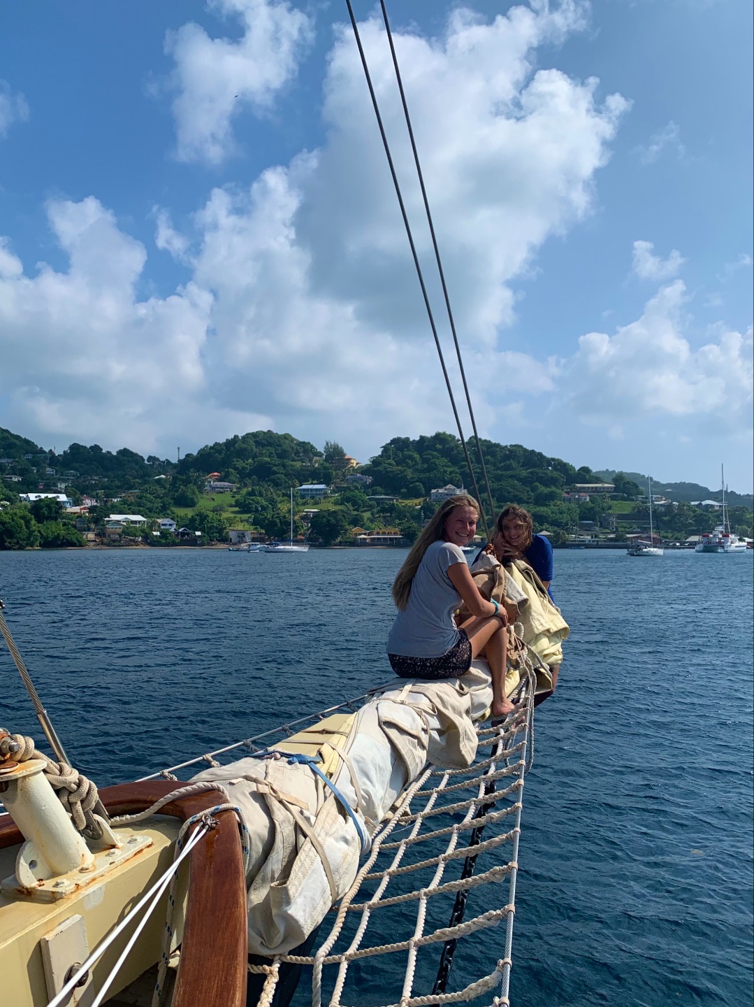 The morning started a little rough when The Mountain woke me up at 7:05 to remind me that I was the skipper today – meaning I was supposed to wake everyone up at 7:00…oops, jejje! HOWEVER, you know what they say: when you are at the bottom, the only way is up!! And the rest of the day just got better and better! After a hardy breakfast (yogurt and granola), we had a Seamanship exam and a bunch of epic moments: Quinn fished and released a little Blue Runner (learned that in marine bio) that we called Jerri (:, Sam found Logan’s phone (that fell into the ocean yesterday lol), Steph, on the same dive, found a bunch of silverware we had lost, and Alexis found her Billy Joel t-shirt that had fallen into the ocean weeks ago!! After this awesome treasure hunt, we dedicated our morning to passage prep and sail raising. When we started this program 40 days ago, passage prep and sail raising felt kind of tedious, but today, oh man! We killed it, and we had so much fun! After the dinghies made it onboard safely, we broke into teams to take the water out of the bilges, prepare the sails, and put away our dive gear. Off we went! Waving goodbye to St. Vincent and our much beloved Bequia.