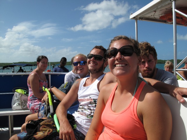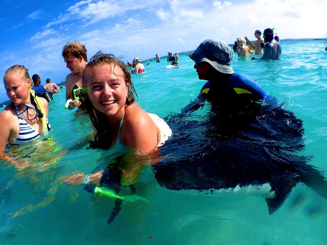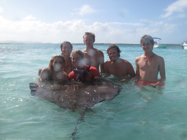 Everyone had a job and worked cohesively to calm the panicked diver and bring the unresponsive diver aboard to perform CPR, provide oxygen, and ultimately bring Captain Ben “back to life.” It was stressful, to say the least, but in retrospect, I was very impressed by what we had all learned in such a short period of time. As the day continued, we hopped into a cab and made our way to Stingray City, Antigua, for a fun-filled afternoon of petting, feeding, and holding stingrays. The excitement was palpable as you saw each of us get the first feel of a ray against our legs. On the ride back to the boat, we all shared stories of the different experiences we had with the rays, and we almost forgot about the written Rescue Diver exam that awaited us. As the rest of the crew wished us luck, the nine rescue diver students walked down the companionway, nervous to take the exam we had been preparing so thoroughly for. Tor knew how eager we were to get our results, so she graded them immediately. I am proud to say that we all passed the exam with flying colors. We were all extremely proud of one another. After an action-packed day, we finally prepared for passage to St. Barths nervously as it was rumored to be 9-foot swells. As soon as we pulled the anchor up, we sailed out into our first squall, anxious and excited for the sail that lay ahead. All in all, today was quite the day!