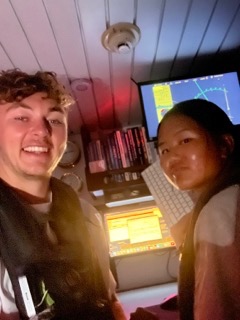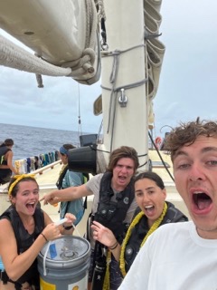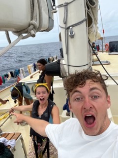 All the sails have been centerlined. Today, we are 4 degrees out of the equator. Everyone is so grateful for the dryer weather and breeze that came through today. Maybe the laundry Emily and I did five days ago will finally dry. Emily, Olivia, Beck, Addy, and I got to hang near the martingale for an hour with music, Oreos, and fruit rollups as the sunset. Iain made vegan veggie spring rolls accompanied with peanut sauce for dinner. Spencer pulled out sardines, and everyone moved away. Once he finished, we moved back. Oh, and this early morning at five am, watch team one go through our third act-it-out storytime. Joshua was the star of the show this time. Emily typed out this whole blog for Maverick while he told her what to write cause we are the best boat duo, duh. Tomorrow, he’s making a Denny’s breakfast buffet-pray for tomorrow’s saltie. Two photos are of everyone on deck, and one is of Emily typing. Also this is Emily, I want to say I miss Mom, Dad, Christine, Connor, Page, William, and all my friends who have been keeping up. Maverick’s entry: Hi, Mom and Dad and Brody! It is dark now, so im having trouble typing, but I miss you guys and am having fun here. ““we are 11 days out from Palau