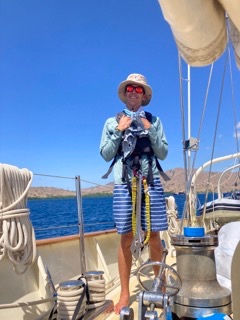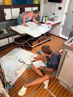 Post anchor pickup, Spencer and Addy slaved away in the anchor locker in order to get the massive catch line that we used to tie to a tree many days ago back into the deep, dark depths of the anchor locker. As they finished their jiggery-pokery on that, Lexy and Beck headed the raising of the main staysail. This was then quickly followed by Sidney leading the raising of the foreword staysail. It is quite crazy to think that many of us had little to no sailing experience before this, and now, 73 days into the trip, we are able to safely raise and lower sails without the aid of the staff. While sails were going up, Anabelle and Elanore (who so graciously volunteered to sous chef while Gabe and Sidney were busy) cheffed up a delicious lunch of Pic Pac, which consisted of spaghetti with a delicious tomato sauce, chicken, and veggies. During lunch, Steph broke the news that we would no longer be able to do a waterfall hike and hopefully see whale sharks due to the distance between the two, so we took it to a vote and, by majority, decided to keep going past the hike tomorrow in hopes of seeing whale sharks the following morning. This has sent Lexy back to the plotter (which she had been working on the entire time I have been writing this blog) in order to alter our destination from the hike to the anchorage near the large sea creatures we hope to see. Post cleanup, the 80-dayers sat down to Marine Bio with Anna, where we played a wonderful Jeopardy review for our final exam that we take tomorrow. This was then followed by a Navmaster class with Gabe, where we put in the final preparations for our Navmaster exam that we took on day 76. After a couple of notes from Gabe, some people sat down to take the timed practice test while some of the rest of us (who had already done the practice test or preferred to study in other ways) went up to watch or work on their final fish for Annas fish ID logbook that is due tonight (as classes are nearing their end we have a test or a project due every day until day 76).