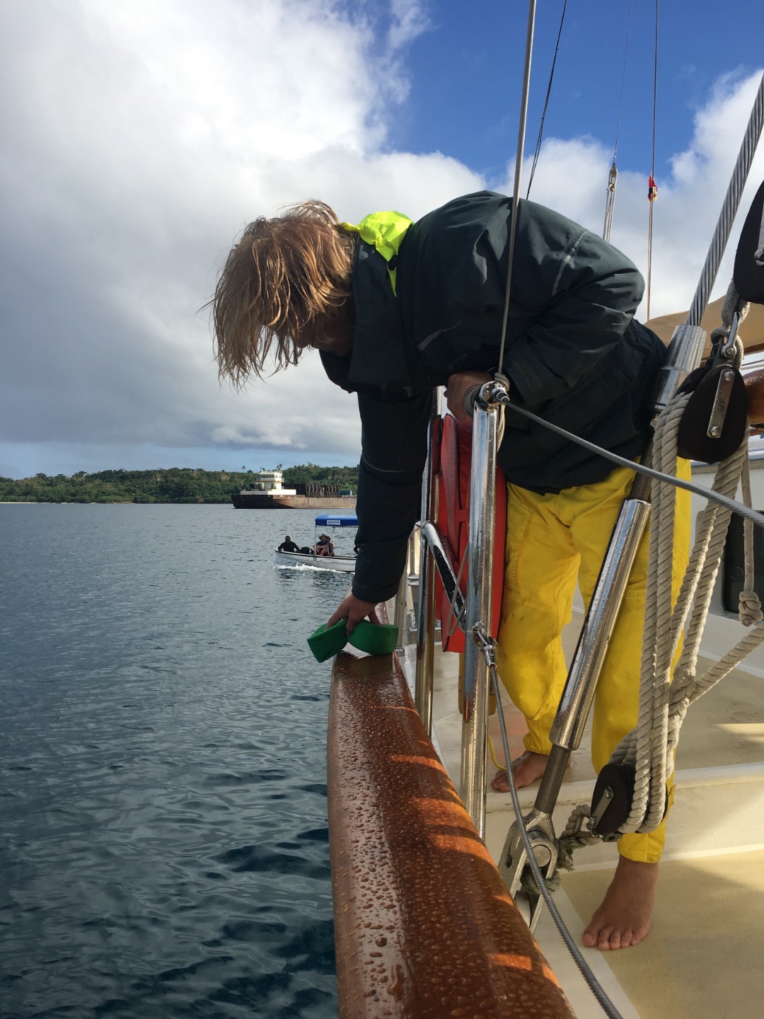 Yesterday, we arrived in Vanuatu under the rising sun as we ate cereal with the waves crashing over us. We actually arrived at the island last night, but spent the night holding the ship in a safe pattern away from land so we could more safely approach our anchorage in the day. So close, yet so far. It had been four days and five nights since we had been on land, but I think everybody would agree that this was the most fun passage yet. This was our first significant passage with our new watch teams, which meant having a new group of people to talk to underneath the stars for four hours each night. Charlotte and I also stayed up for twenty-four hours, making 121 crepes and catching two Mahi Mahi. After docking on the island, we immediately began boat appreciation (BA). This involves cleaning just about every square inch of the boat inside and out. After this time-consuming process, everybody’s eyes lit up with joy when we found we were getting our first night out in three weeks. We ended up eating dinner and getting drinks at a local bar in town before walking down the road to another bar to dance for the rest of the night. Vanuatu is an awesome island with great places to eat and hang out. We are excited to be here and continue exploring the island before setting sail to Australia.