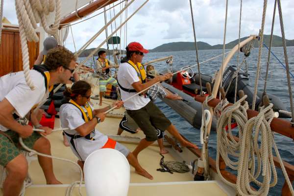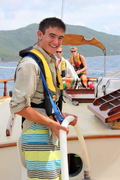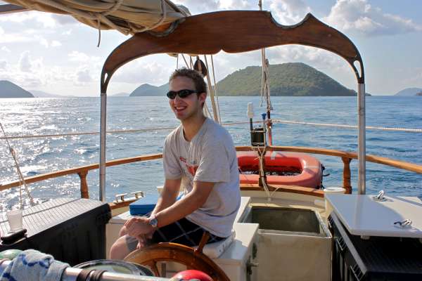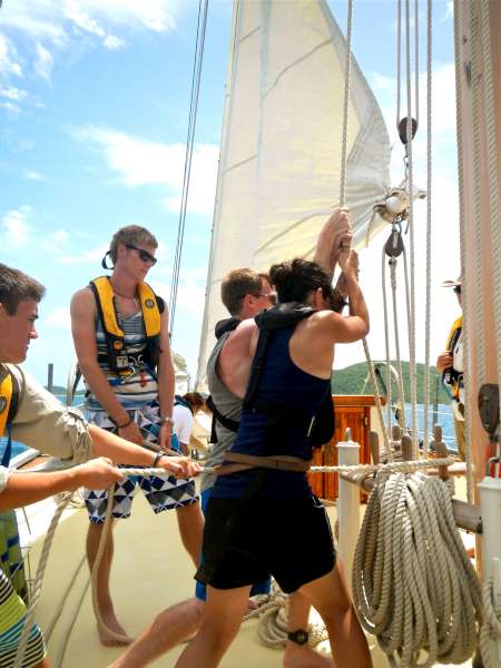 As my first time as skipper, I managed to begin the day by dropping a water bucket overboard. Thankfully, we were at anchor, and retrieving it turned out to be relatively simple since we started out the day with two open water dives. Diving, I think I found another love in my life. It’s so exciting to be able to explore the other 2/3’s of the world we live on. I can’t properly convey how much that gladdens my world. I wish I could, but well, corny as it may sound, words aren’t quite enough to describe it. The two dives of today were mainly instructional in how to deal with the obstacles encountered while diving, but they were still amazing. Doing flips on the sea floor is intense! After lunch, we began preparing for our sail from Mountain Point to Gorda Sound. Before getting up the sails, we had a fire drill aboard to set us through the paces of all our designated jobs. Today, we got the mainsail and foresail up at the same time, the same with stay-sail and jib, which was a first for us. A few enjoyable hours of sailing ended with a man-over-board drill once again to set us through our paces and make sure we knew our responding roles. We took in the sails and lowered the anchor upon arrival, and then it was Shower Time. If the masses have not already been informed, a shower aboard includes jumping off the side of the ship, climbing up that same side and applying all necessary cleaning liquids, jumping off the side once more to wash off, and then getting freshwater rinse from the deck hose. All done, of course, in swimsuits. It’s a lot of fun. Food is one of my favorite things, and dinner was delicious: chicken pone with Alfredo sauce and some garlic bread. I give a thumbs up to the cooks of the day (Chef-Boy-R-Danny and Matty Rob)! Dive tables were the next course of study after dinner for those on Ocean Star who were not already certified to dive. It’s basically a chart to help divers manage their dive times and nitrogen level intake. And with that, we wound down the end of the day. Good night and good day from Ocean Star!
