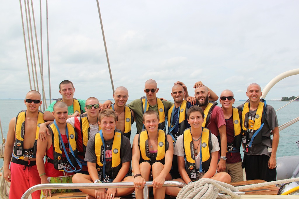 This morning, I awoke especially early. I knew that since I had to wake up early, I would need that extra kick with a cup of coffee. Coffee has been one of those special treats since we can’t have it when we’re underway. It was especially good today, too, because the hotel at Nongsa Point gave it to me for free! After slowly waking up and letting my coffee set in, I went down below to wake up the rest of the crew for their last shore runs before breakfast and our departure for Singapore on the horizon. Clearance from Nongsa Point went faster than planned, and as soon as we were done with Leah’s delicious pumpkin pancakes, we were on our way. The excitement was high as the city skyline in front of us got closer and closer. Capt. Sam took the helm since the boat traffic around Singapore is quite outrageous. Our excitement had to be set aside for a bit while we practiced our navigation skills in MTE, and Kyle taught us how to tie a proper fisherman’s knot for his how-to presentation. Then we were back on deck to get a quick photo of all the baldies from the equator crossing and to help the Singapore customs people aboard. Again clearance into Singapore went surprisingly fast, and before we knew it, we were pulling into our spot at One 15 Marina amongst many a megayacht.