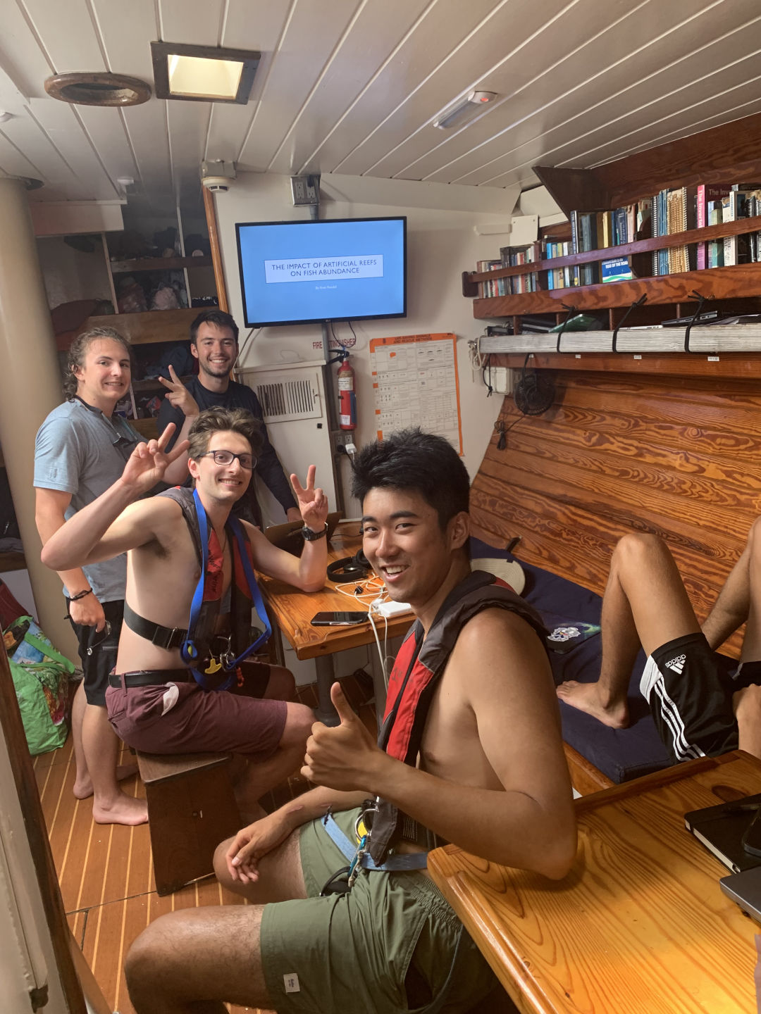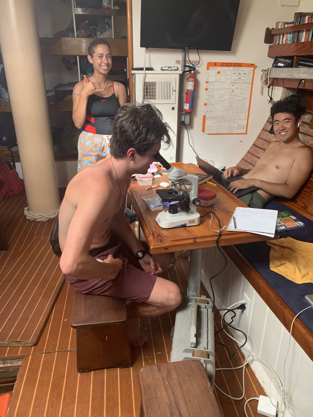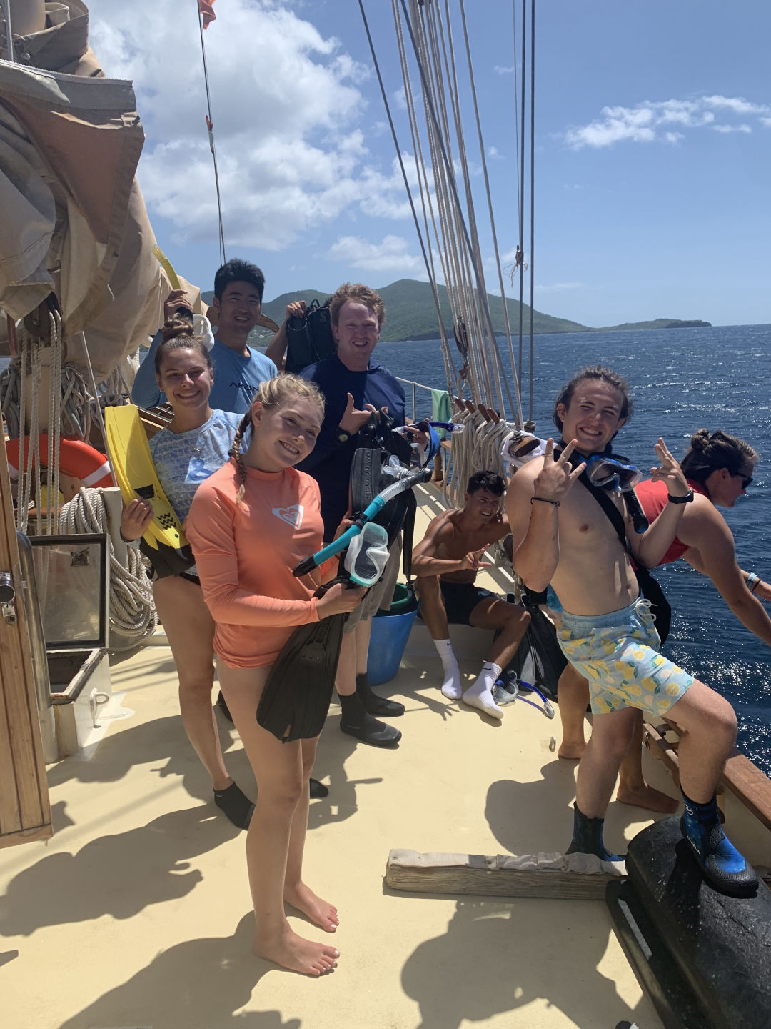 Tonight’s squeeze question was “What is one of your favorite simple pleasures?” (Gavin is watching me write this and very much judging how I spelled favourite with a u, but that’s the Canadian way, eh). The reason for the early dinner was very exciting; two-thirds of us got to go on our first-night dive! The rest had a seamanship class with Drew and will dive tomorrow night. I was in the dive group, so we got geared up, wetsuits and all, and got shuttled out to the reef once again. The dive was out of this world! Kacy led my group, and we saw an octopus (Elling is very jealous), lots of eels and crabs, a puffer fish, some box fish, and a big angel fish. While we were underwater, we did a navigation skill, and we also got to play in the bioluminescence! It was beautiful. We swam back to the boat and had a little ramen snack party up on deck, which was perfect after the dive. While we were eating, we saw something big in the water. We grabbed lights and were kinda freaking out because we thought it was a shark, but Steph and Amanda informed us that it was only a tarpon. We ended up seeing quite a lot of them. The whole ordeal was only half cool; according to Aidan, we would all love to see a shark. Most of us have a verrrrryyyyy early wake-up tomorrow for a sunrise hike, so I’m gonna wrap it up here. Big hugs to the people back home!