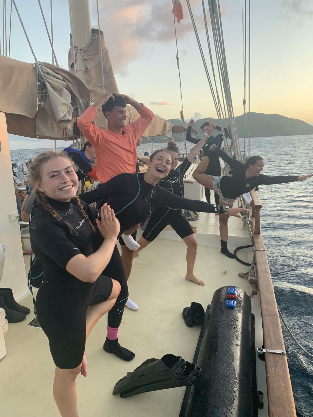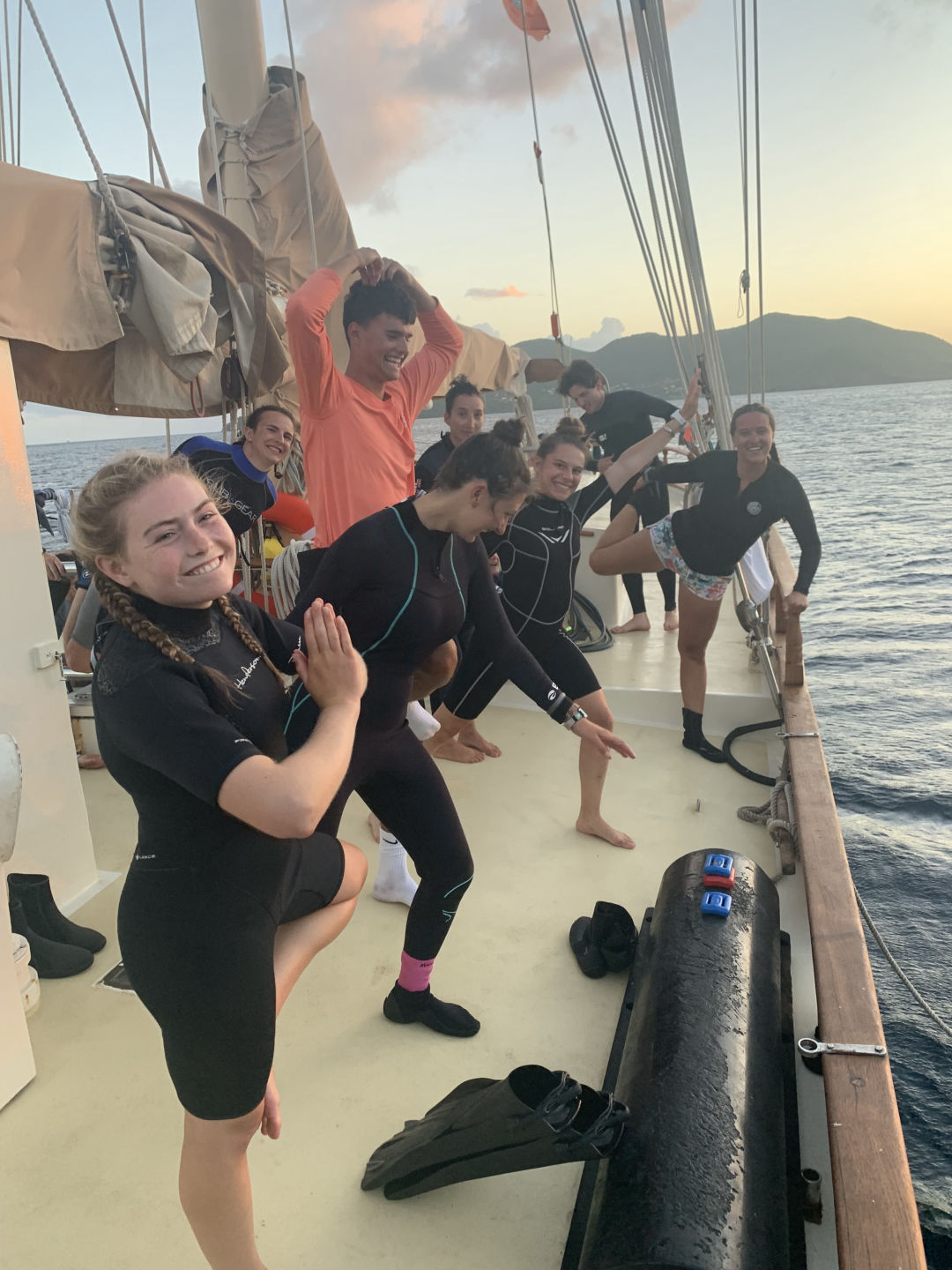 Photos featuring: The beautiful sunset, oceanography presentations underway, group research, snorkel time, and of course, wetsuit yoga.