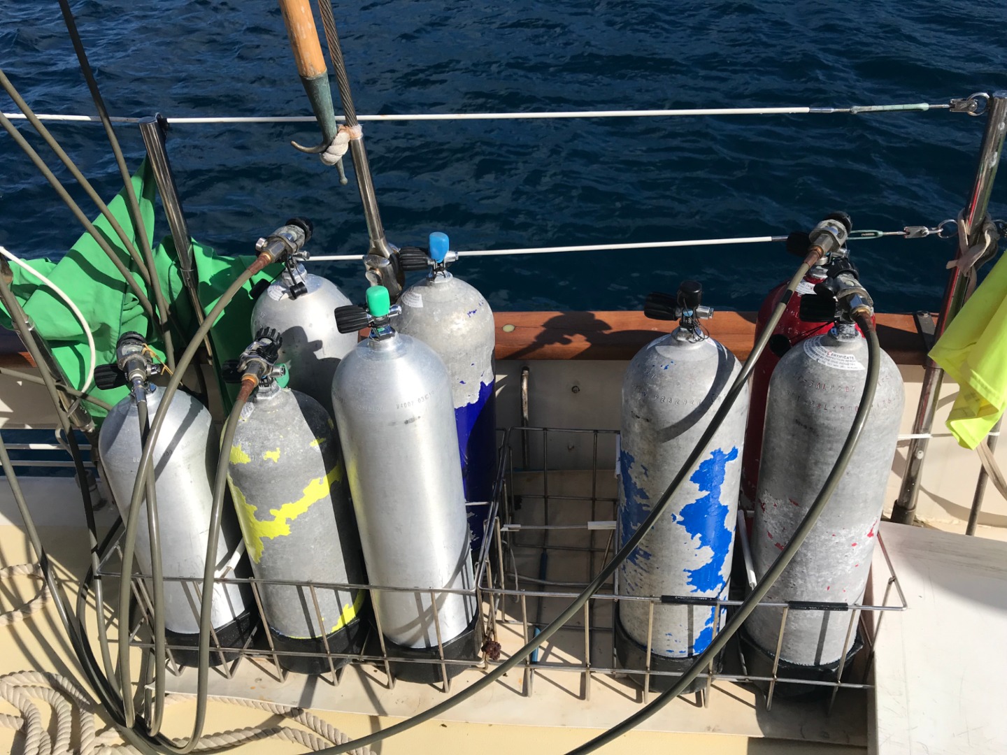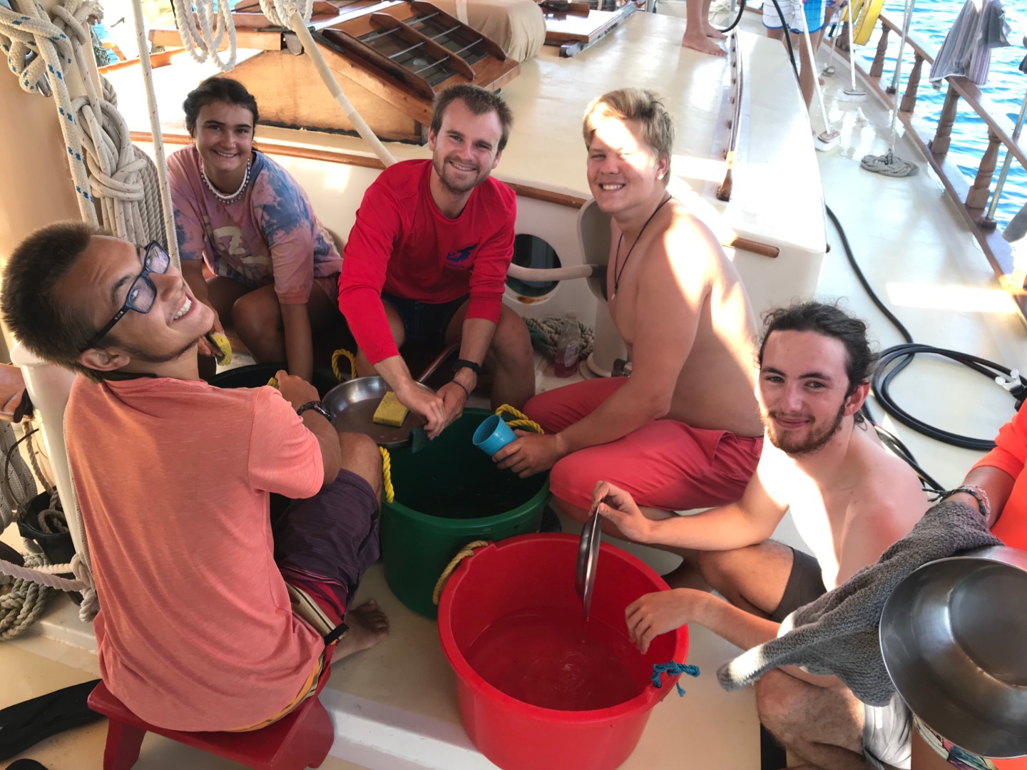 Today was a beautiful, hot, and breezy morning, but under the shade of the deck tarps, we were happy and cool. We were all excited for the dives we had coming up as we were starting the Advanced Open Water course today. While the chefs worked on finishing up breakfast, some were putting their dive gear together, some were completing dinghy school with Jon, and others were getting the dinghy launched and just generally preparing for the day. Then we ate a delicious breakfast of oatmeal pancakes, fruit, and bacon prepared by head chef Jade and her sous chefs Nate and Jill. After a quick cleanup, we had an Oceanography class. Our midterm is next week, and the students have been working hard not only in studying but also in beginning their group research projects. After class, we had some time to start collecting data for the projects. The projects include collecting and analyzing sediment from windward vs. leeward beaches, studying the diversity of plankton during the day and at night, fish surveys in sandy vs. reef habitat, and analyzing biofouling organisms on the hull and propeller of Ocean Star. To conduct their research, some of the students had to brave the lower laz with me to access the science equipment that we store deep down in the depths.