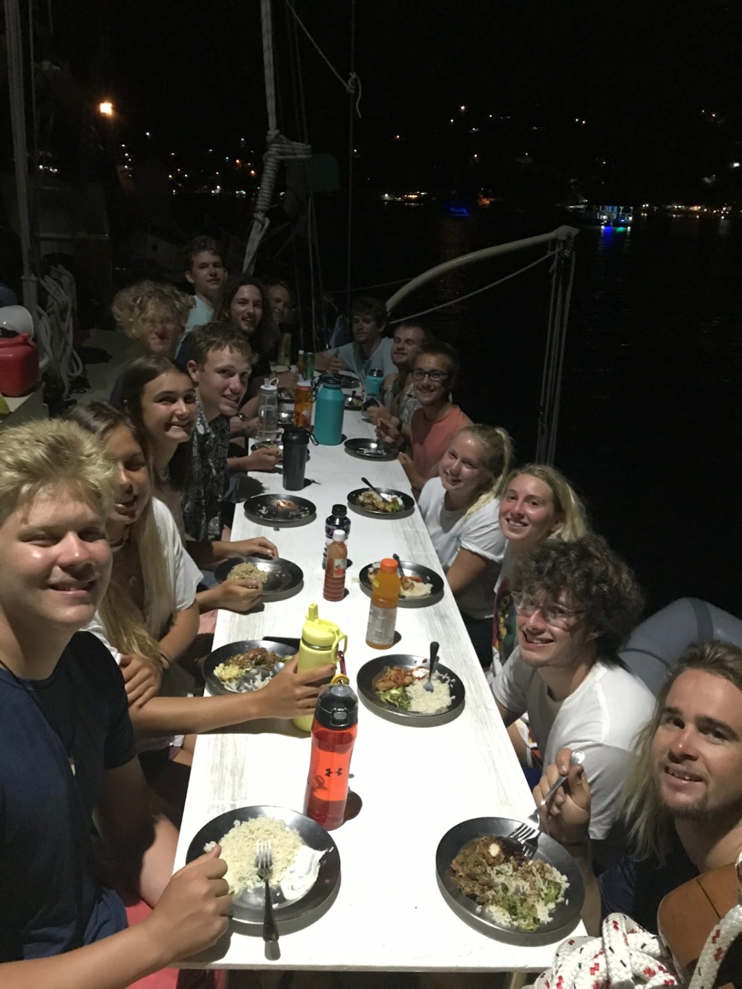 We concluded our day with homemade chicken nuggets (some compared them to Chick-fil-a!) for dinner. After a music-filled dinner cleanup, the students are now in the salon taking their VHF radio certification exam with Carolyn for seamanship class. Their next class will be the start of NavMaster, where they start learning how to use charts to do coastal navigation. We are learning so much every day, and we can’t believe we are approaching the halfway mark already!