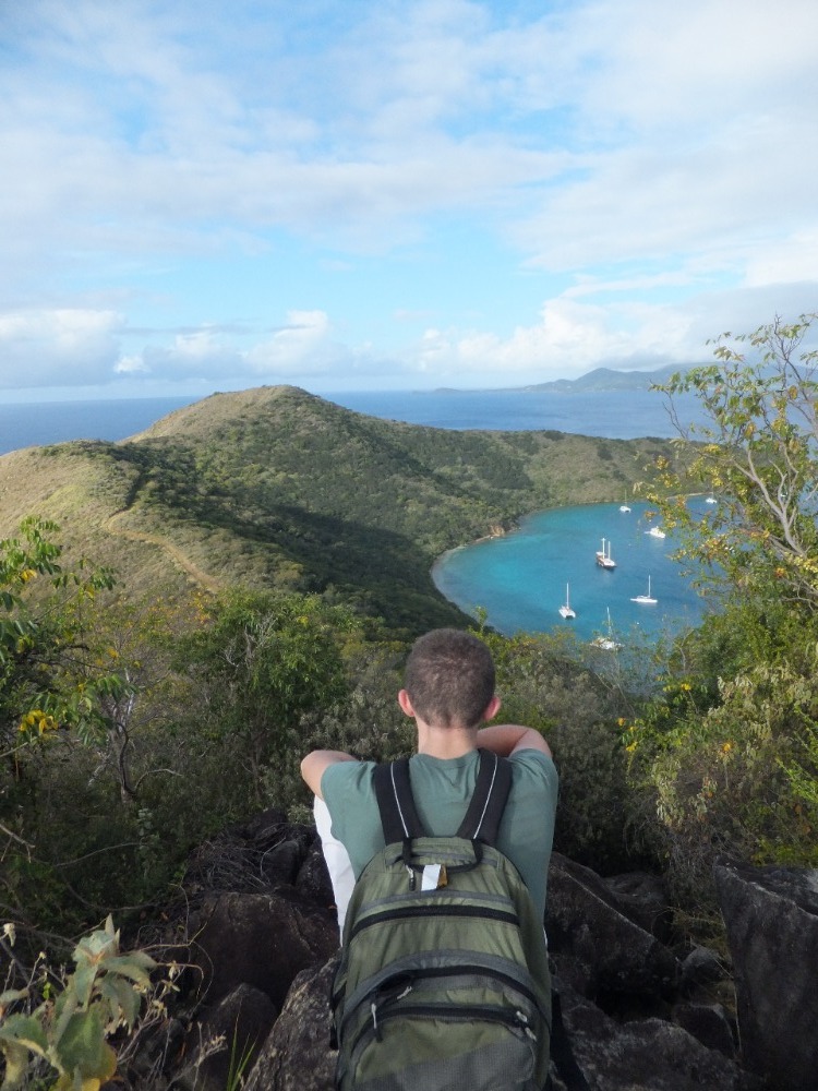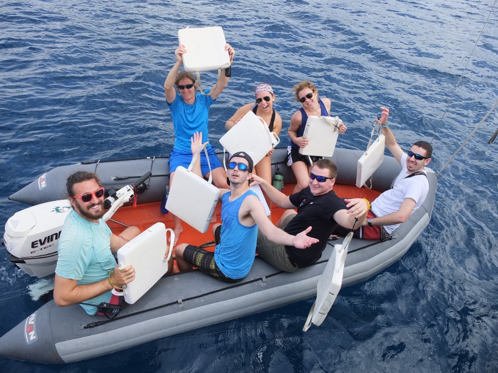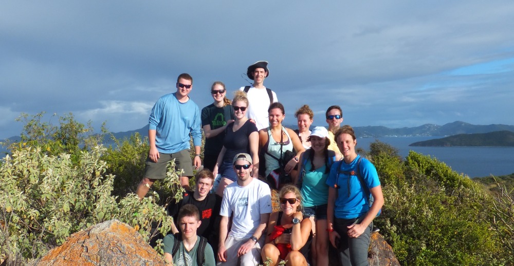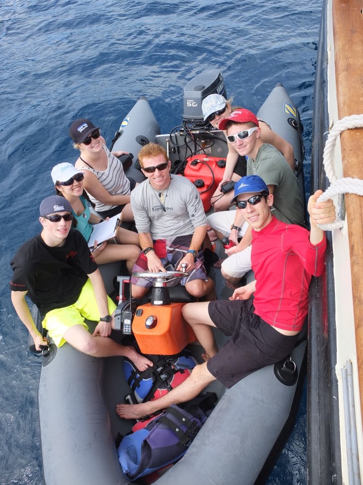 We had an early start this morning as we boated toward the shore, ready to explore two nearby salt ponds, on the lookout for native bird species. After many successful sightings, the group began a trek up the slope of the island, determined to reach the top where we saw the most amazing view of the nearby islands, the ocean waves, and our new home–the Ocean Star–nestled into the harbor below. Later, the birding continued. While we cruised about the shore of the island, keeping an eye out for nesting pelicans, we spotted a cave in the rocky hills and jumped out of the boats to play in the shallow waters. After lunch aboard the ship, we cranked out a few chapters of PADI training to prepare for the upcoming diving lessons that we were all so eager to begin. Though jellyfish warnings kept us out of the water for the rest of the day, we were all able to enjoy some free time hanging out onboard–soaking up the sun, reading, and getting to know all of our new shipmates and friends all the better.