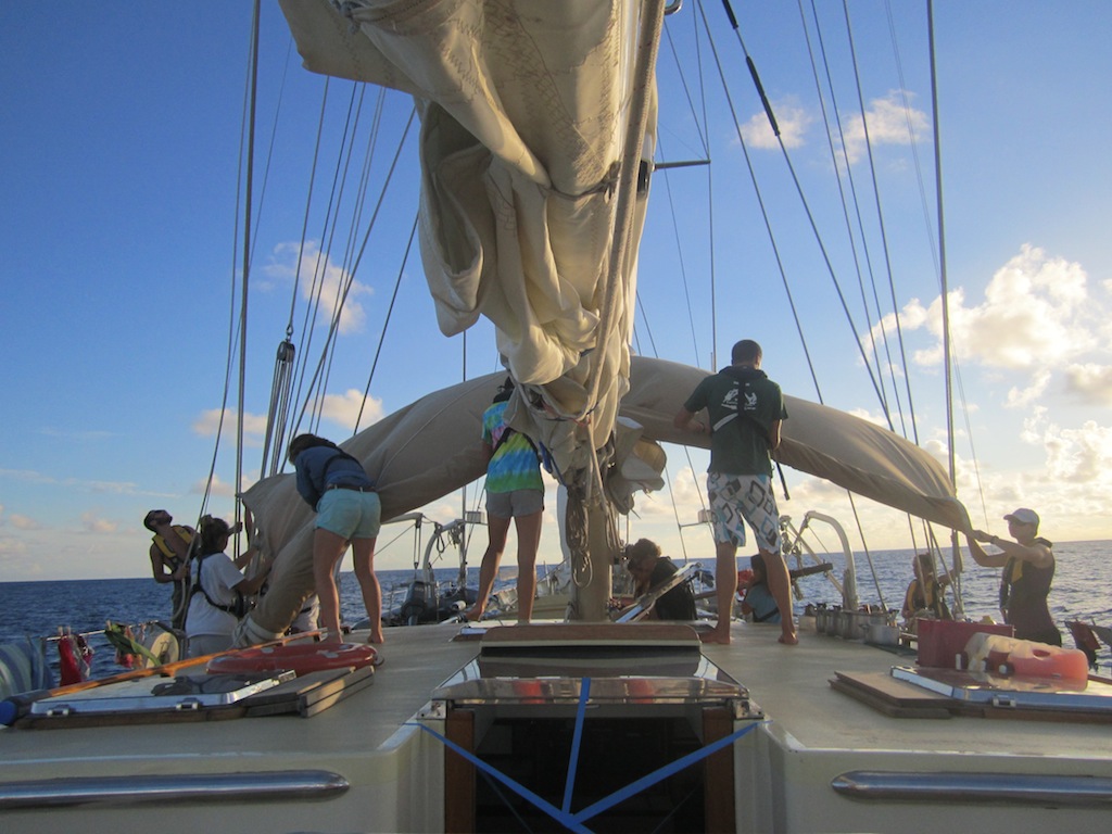 Today was just like any other day of passage life. Watch team one kicked off the day by putting up the main tarp and setting up Camp Argo. We had our final SLD class, followed by lunch and another open water shower with no land in sight. After showers, we had OCE and OCB. At the end of Faloon’s lecture, we watched a Seinfeld episode pertaining to Marine Biology. After we ate dinner, Ford and I gave our Tuamotus presentation; everyone was excited to arrive in Ahe tomorrow! Skipper out Your Skipper of the day, Lizzy H.