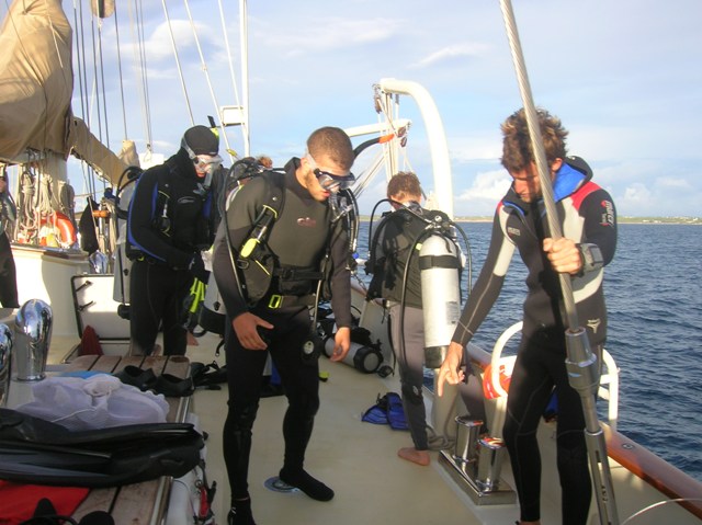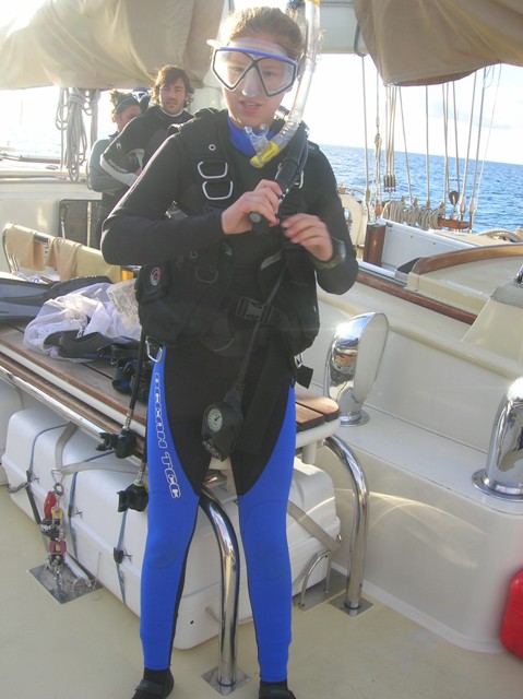 We raised the anchor and motored briefly up to Puerto Portals to anchor next to a rocky point with clear water to spend the day getting the crew through some of their dive training. The open water divers cycled through their first real dive to approximately thirty feet, and the rest of the crew went ashore to stock up on candy and soda for the passage to Formentera, eighty nautical miles to the south. At 2100, we departed in calm seas and fair winds with the stars to guide us.