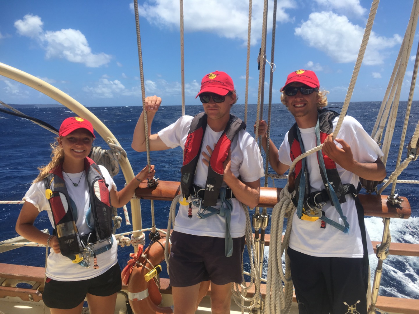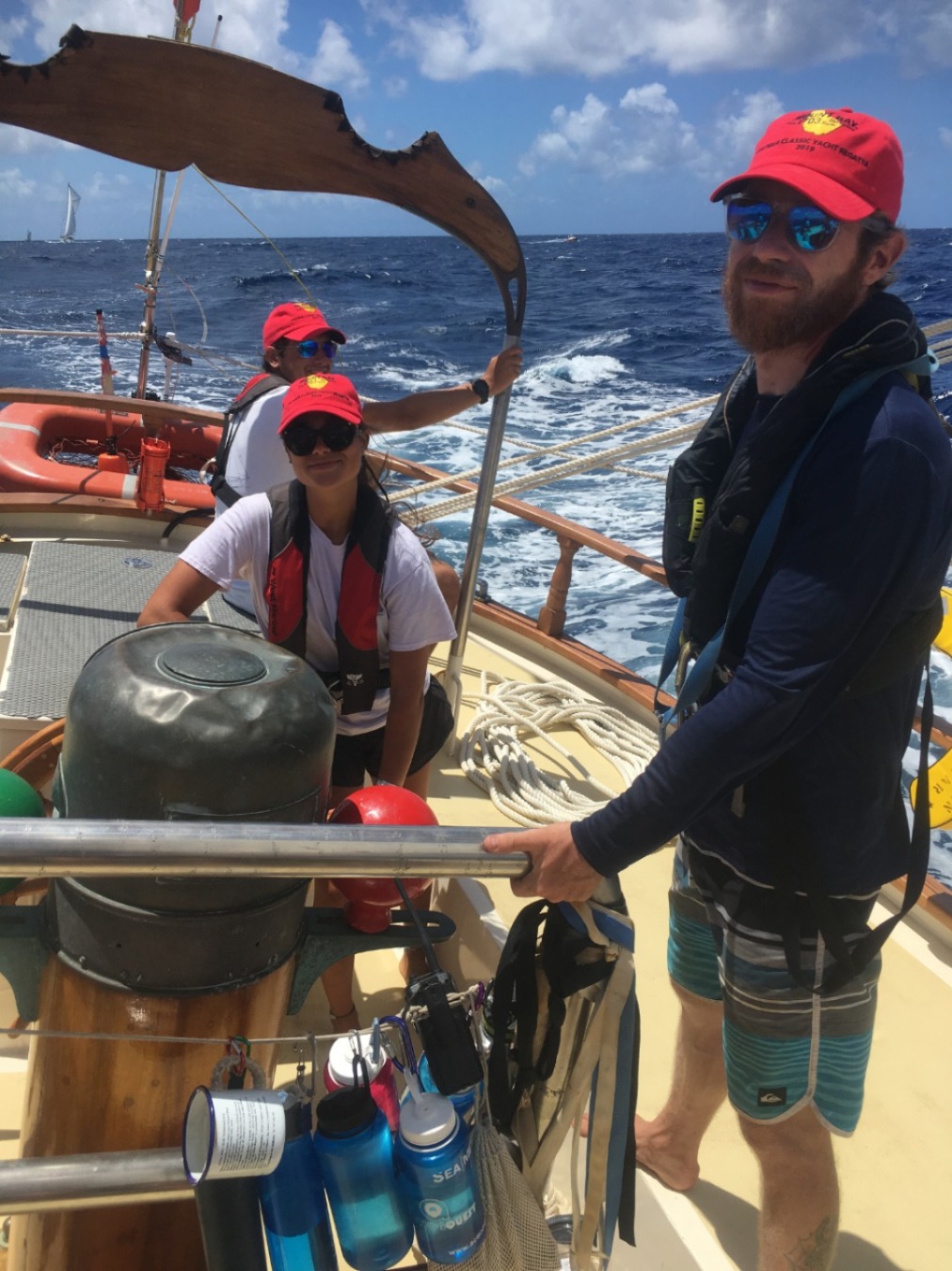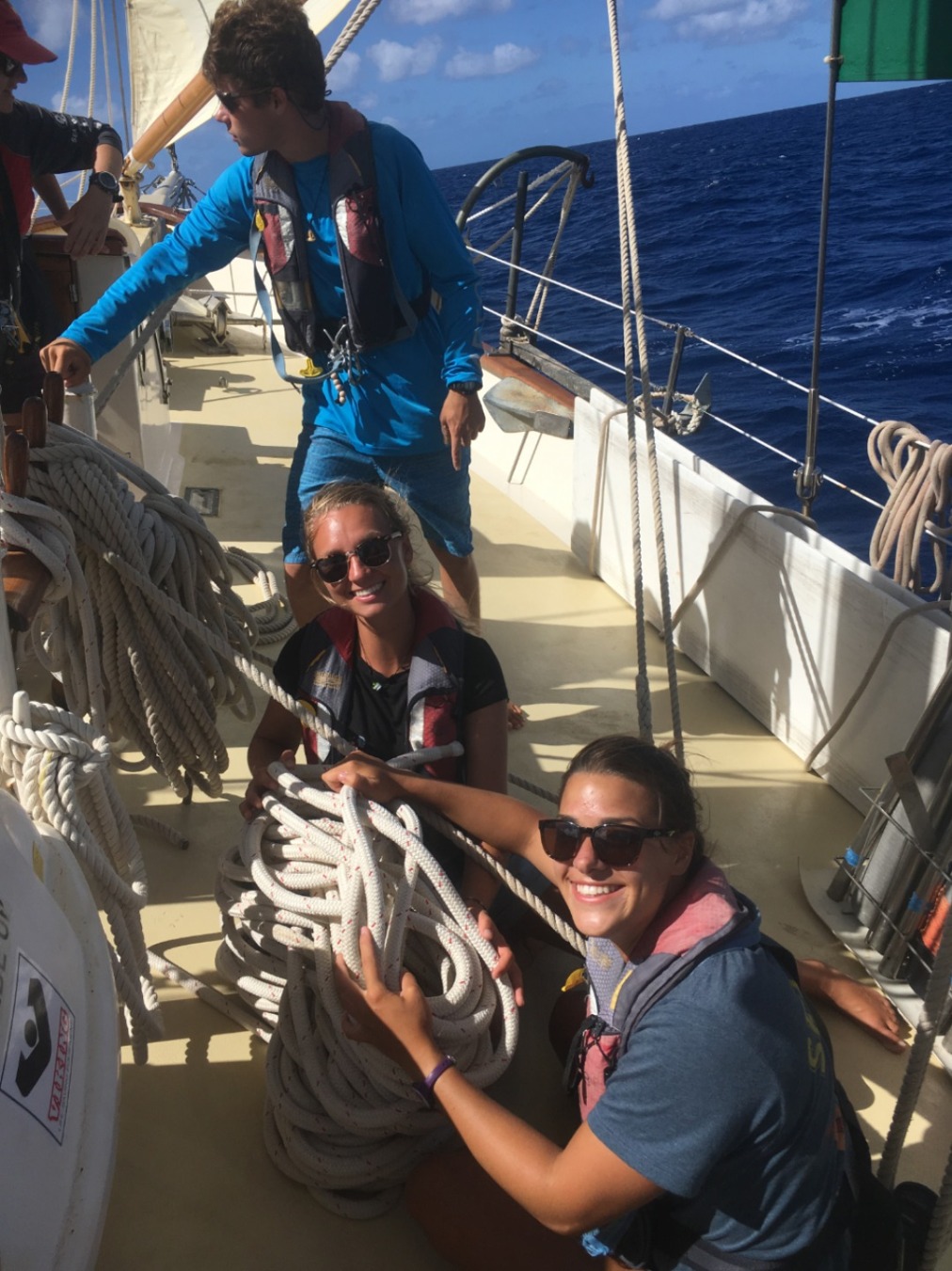 Today began once again, at 6:20. After slow wake-ups, we quickly had a breakfast of muffins and melon before prepping Ocean Star for another day of racing. After a debrief of the 23 nm track we would sail, we welcomed on board a writer who’s writing a piece on Sea|mester and who wanted to join us for the race. After about 15 minutes, we set off for what we thought would be easy sailing. About midway through rising the mainsail, a rip was spotted along with one of the sail’s seems. In a slight panic and with about 40 minutes until the start of the race, Alex and Carolyn quickly patched it up, and we mounted all the sails in 17 minutes, our new record. Although yet again we finished last, we felt newfound confidence in our abilities to handle the tacks, jibes, and points of sail we spent so many hours learning. Once back at the dock, we showered had a light salad before going out to dinner at a nice restaurant overlooking the dock ( thank you, Jules <3 and hi Julia 😉 ). We then had free time until we went to sleep.