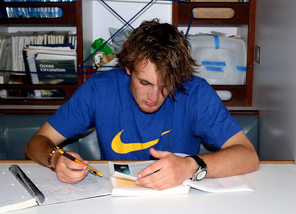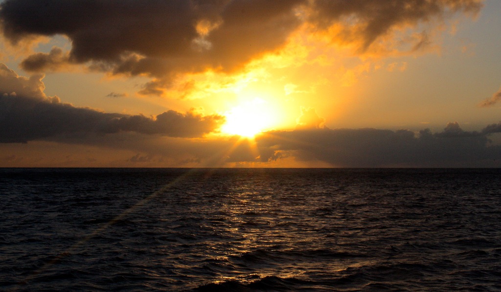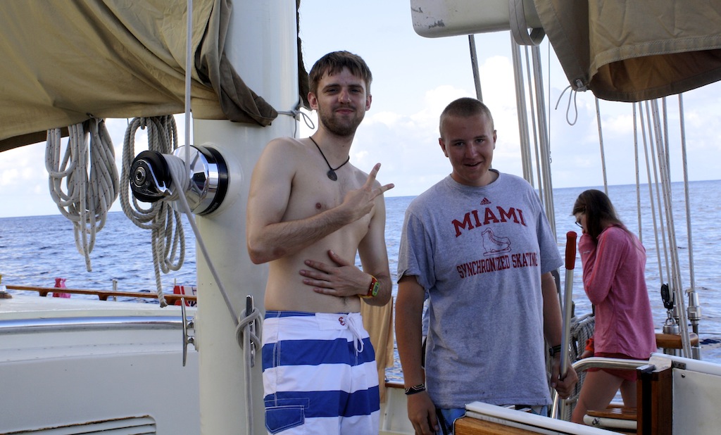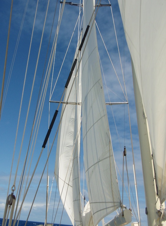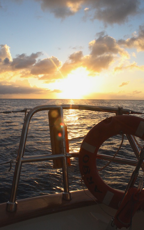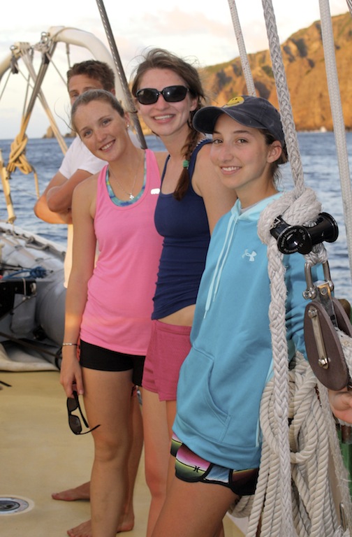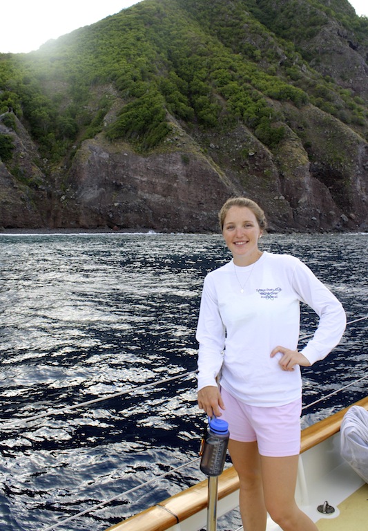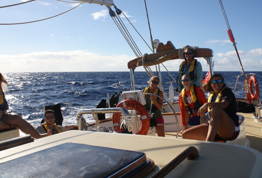 Last night, after some final adjustments to the sails, we set off on our first overnight passage to Saba. Our evening sail was accompanied by a brilliantly shiny full moon, which, in addition to 10-15 knots of wind, made for a quiet, smooth, and graceful sail through the night. Watch teams took turns watching over Argo as she glided through the water. At lunch, we were all together again, sharing stories about the first people to puke and rally, the birthday dolphins that greeted Emily when she came on deck for watch, and the flying fish that seemed to materialize out of nowhere. In the afternoon, the crew was introduced to the names of many of the critters they had been seeing on their snorkels and dives in a marine biology class, and then they had a professional skipper training class. On deck, the crew honed their sailing skills by throwing in a couple of tacks, but we finally had to throw on the engine for our final approach to the land of leprechauns and unicorns: Saba. Argo got some love as we flaked sails, washed the salt off the hull, and tidied up the deck. After the passage, everyone ate like kings for dinner- Mexican night- and we ended the evening with a birthday cake for Emily! Another epic day aboard Argo!