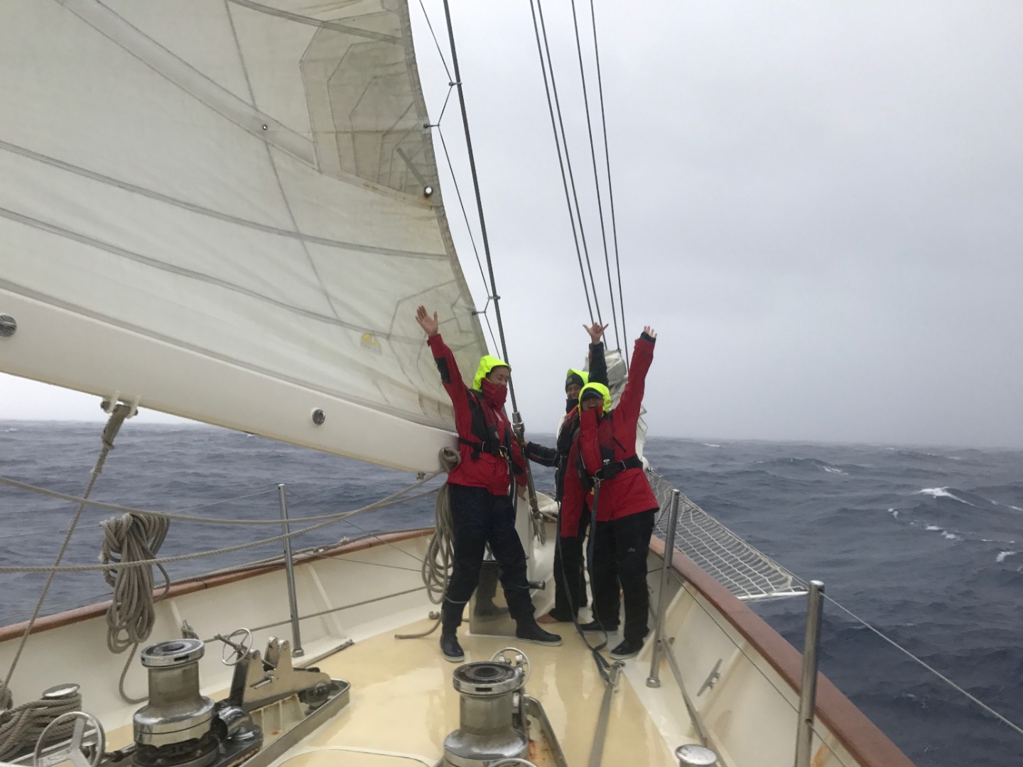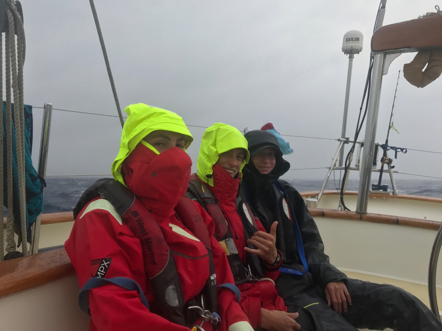 Today watch team 1. My watch team started off the day on the 12:00 am to 4:00 am watch. Everything was going swimmingly until around 2:00 am, when we saw three storms/squalls on the radar. Suddenly, the sky was lit up by lightning. We woke up Ben, who decided we needed to take down the jib and put a reef in the mainsail. Just as we took down the jib, it started pouring. It was absolutely epic. We all worked as a team to put a reef in the mainsail, which entails lowering it slightly and making it smaller, so we don’t go as fast in high wind. We turned our watch over to watch team two at 4:00 am, and just as we did, it started to rain even harder than it was previously. Watch team three took over at 8:00 am and had the roughest weather we encountered yet; they had to put a second reef in the mainsail. At this point, waves were crashing over the bow, and whoever was on bow watch was getting drenched. I know this because I watched it happen from the hatch above my bed. It was absolutely hysterical to watch a wave wash over the boat and hear the bow watch scream and cheer. After all of this, we had a lunch of veggie stir fry made by Mikayla, our head chef. Hey Mom, remember I told you I didn’t get seasick? That was a lie. I puked today, but I’m so happy and having so much fun, so that’s all that matters. Supposedly, the worst weather we’ve had to date, we’ll be getting tonight around 12:00 pm, so wish us luck. We should be getting into South Africa in the next few days, and we’re all excited to see land again after what will be over ten days at sea.