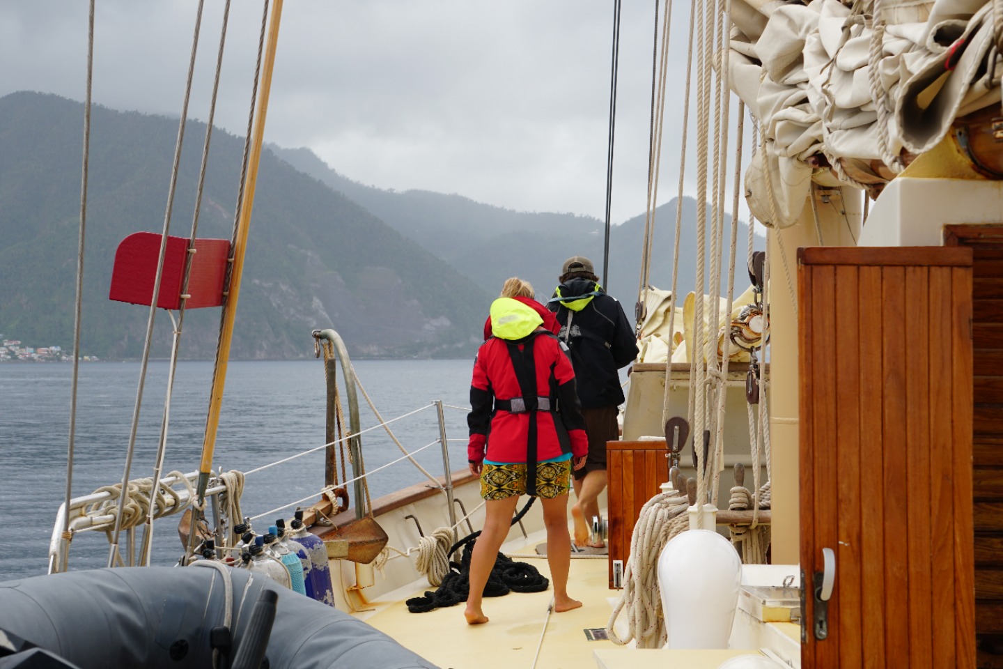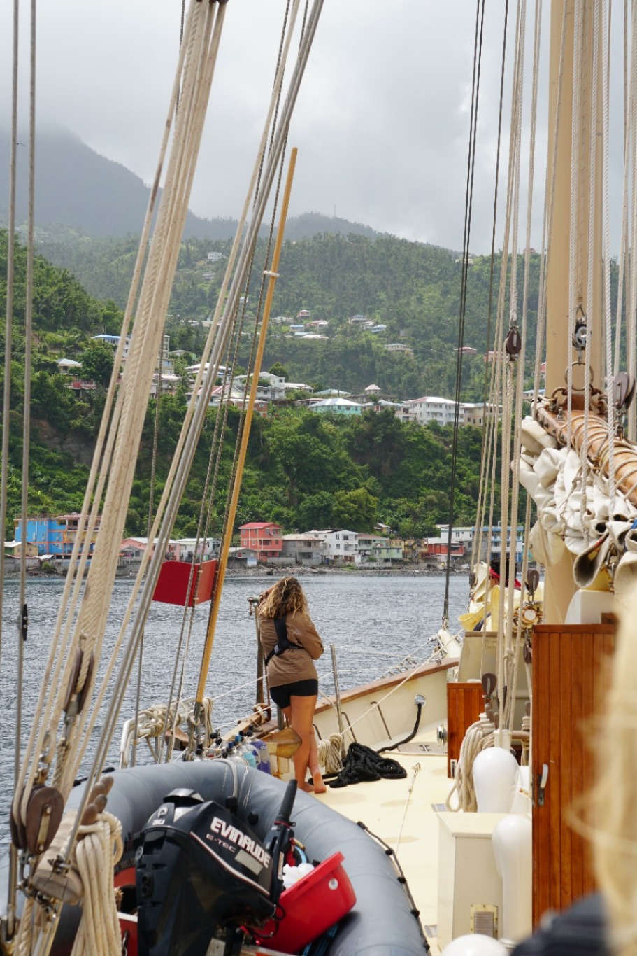Once moored on the island, we took out sponges, soap, and brushes and proceeded to clean the boat from boom to hull. There were bubbles everywhere: on the whole deck, the sails, and the crew. The scrub down continued down into the cabins and the salon, where everyone’s bunk was stripped of dirty sheets and wiped down until everything was sparkling and aromatic. Needless to say, cleaning an 88-foot schooner in the midday heat takes a toll on everyone. As the sun went down, we all bathed and sat down in the now clean salon or on deck and enjoyed the mixed sounds and smells of Roseau at night. We went to bed with exhausted bodies but thrilling experiences.
