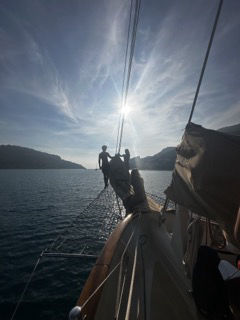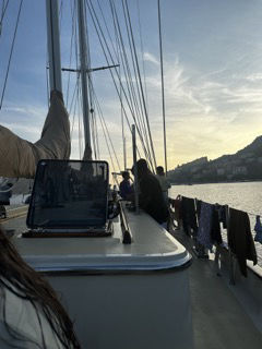 We set sail late last night, with our final destination being Porto Venere, Italy. We were all excited about what awaited us with our night shifts because this happened to be the first overnight sail. We have three watch teams: watch team one, watch Team Two, and watch Team Three. Watch team one started us off for the dog watch, a two-hour watch during dinner time compared to the normal four-hour watch shift. Then that led into watch team two taking us from 8 pm- Midnight. Watch team three get woken up at 11:30 for their 124 a.m. watch. Then the cycle repeated itself with watch team one from 48 a.m. When we are sailing, we have to stay alert, do hourly boat inspections, and, most challenging, stay awake. Luckily, because today was our first overnight trip, we got plenty of time to sleep in, with our wake-up call being 11:30. Everyone was groggy for lunch, and there weren’t as many conversations as usual.