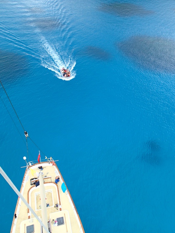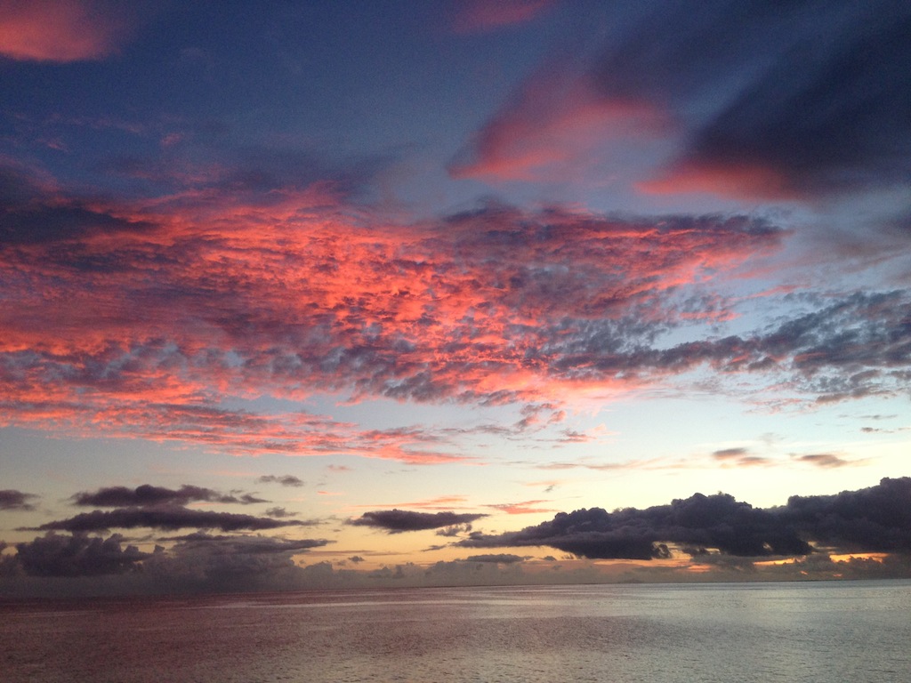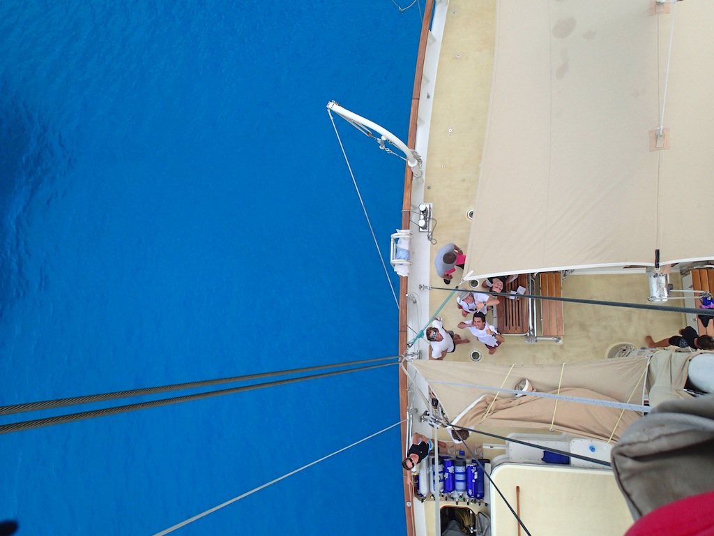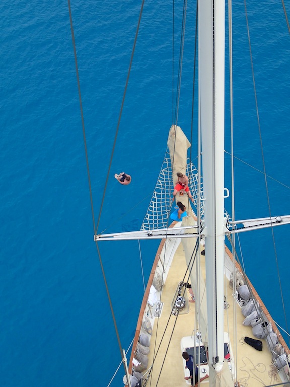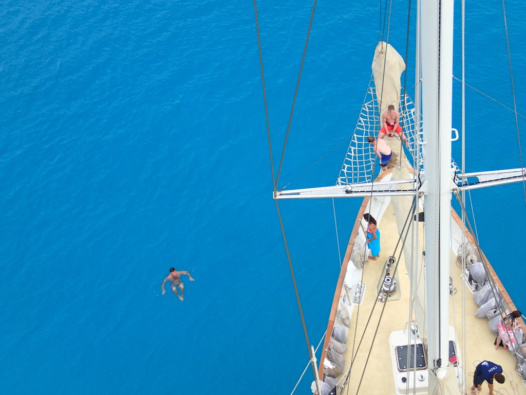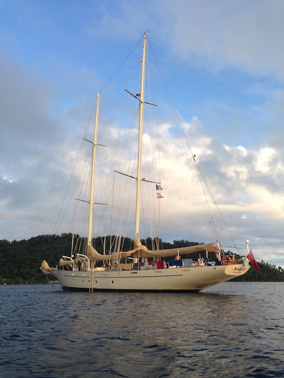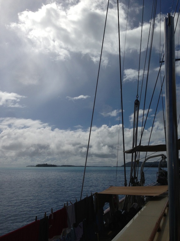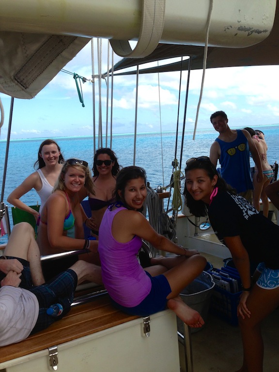 Morning today saw Argo pulling into her anchorage just across from the Hilton in Bora Bora. We struck the sails as the island came into view and then hung our heads over the side, marveling at the clearest turquoise waters most of us had ever seen. An exciting half-hour followed as Jim and Sam navigated Argo through a narrow channel into the bay. The bottom was easily visible, with coral heads passing just a few feet under the keel at times. Once the anchor was safely down, we accomplished our first deck wash, scrubbing, spraying, waxing, and polishing Argo to a glistening shine. After a tasty lunch of pesto grilled cheese whipped up by Alex, Mina, and Jim, we learned all about coral in marine biology. Professor Carolyn is getting us ready for our fast-approaching reef dives! After class, the group split up to either watch another open water diver video or snorkel over some nearby coral patches. Once the video was over, the open water kids got to go check out the snorkeling site, and then it was showering, studying, and relaxing on deck until dinner. Sam even taught the first group of us (myself included) how to drive the dinghy! After plenty of wrong turns and several missed docking attempts as everyone got used to steering with a tiller, the first six of us were checked out to drive Smoke, the “people mover” dinghy. Our chefs prepared another amazing dinner of chicken pot pie, and the question of the evening was, “If you became stranded on a deserted island, but you could choose one book/movie and one sandwich to bring with you, what would they be?” By the time everyone got done describing their favorite sandwiches, we were all dying to eat. After dinner, we sang Ben a rousing chorus of “Happy Birthday, ate some phenomenal yellow cake with chocolate sauce, and then hunkered down as Jim conducted an interesting forum. He talked about success and strategies for accomplishing both tangible and intangible personal goals, leaving us all to ponder our own personal aspirations. It seems like we’re able to pack more and more into each day we’re out here, and while it is exhausting, every single one of us loves every minute.