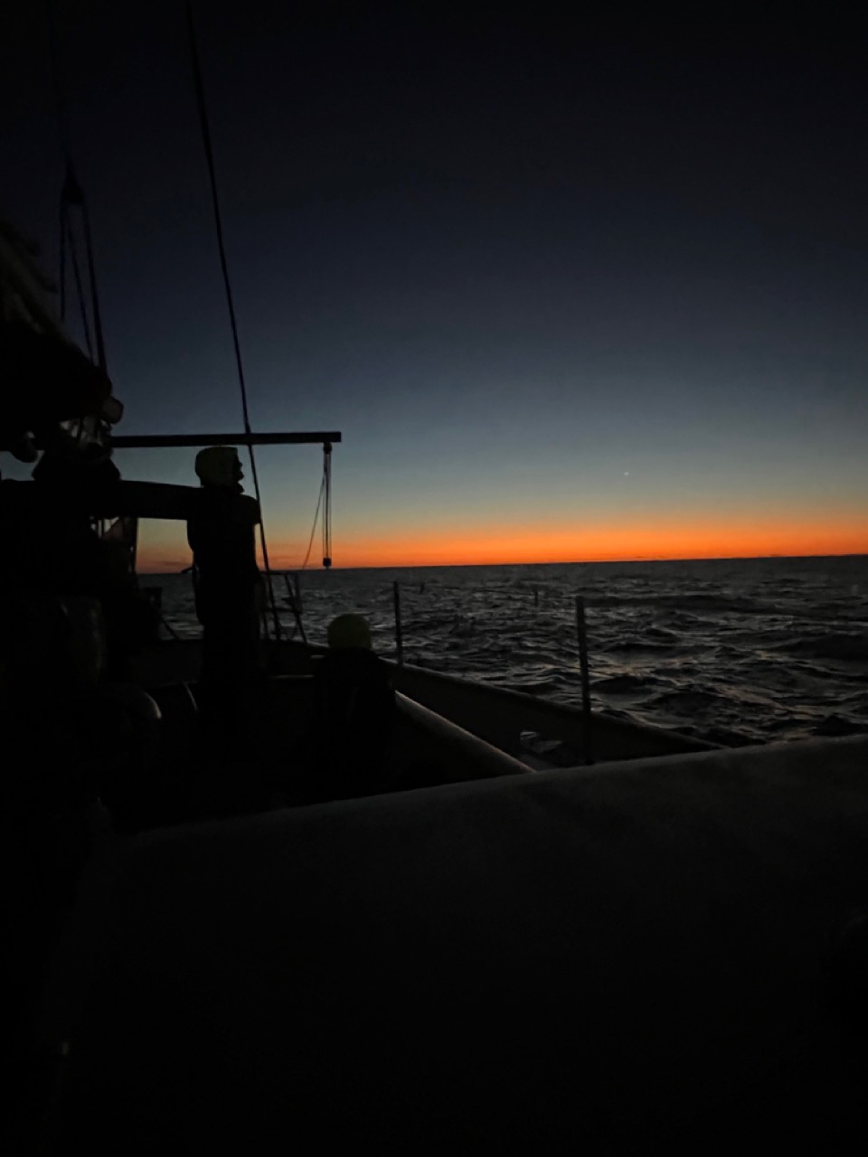 After lunch, we had Marine Biology and Seamanship. In Marine Bio, Ben taught us just how microorganisms can get, and in Seamanship, Mac and Claire taught us how to tie some new knots of which we knew not. Something we have yet to learn is how to not face plant in the salon when the boat is heeling over from consistent winds. We also got assigned to our new watch groups today, where I got to witness Maxs continuing transformation into Jack Sparrow as he slowly adds new pieces to the outfit each time I see him. It seems that his pirate doubloons are just Nutella biscuits, but I can forgive the discrepancy since he was willing to share.