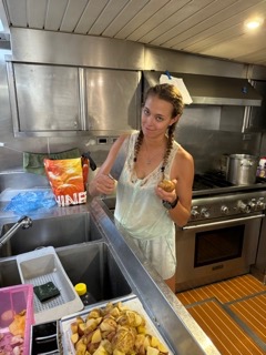 Ease the preventer. Take in the sheet! Echoed across the deck and down through the hatches as we slipped quietly through the water under just the power of our sails. I checked my watch, 0730. I guess its time to get up to do a boat check before the start of my 8-12 watch. I finished my boat check and moseyed up on deck to see that watch team 3 had successfully jibed, and we were now heading a little further south to hook into some cleaner trade wind breeze. Watch team 1 relieved watch team three and took over the final sail adjustments of the jibe. Watson hopped to the Sampson post to tail our newly rigged downwind preventer. Chloe, Talia, Boston, Ruby, and Eduardo sweat the preventer, and Grace C eased the sheet. There is nothing I love seeing more than the forward staysail sheeted out as far as she can go with the flying jib soaring overhead. After we had all the sails set out on a port tack, we settled back into the cockpit to stand by the rest of the watch. Two by two, people went down below to get their fix of coffee and breakfast. Everyone is a little worried about an oceanography quiz coming up today but lucky for them, marine scientist Mich is on our watch and could quiz everyone on the topics.