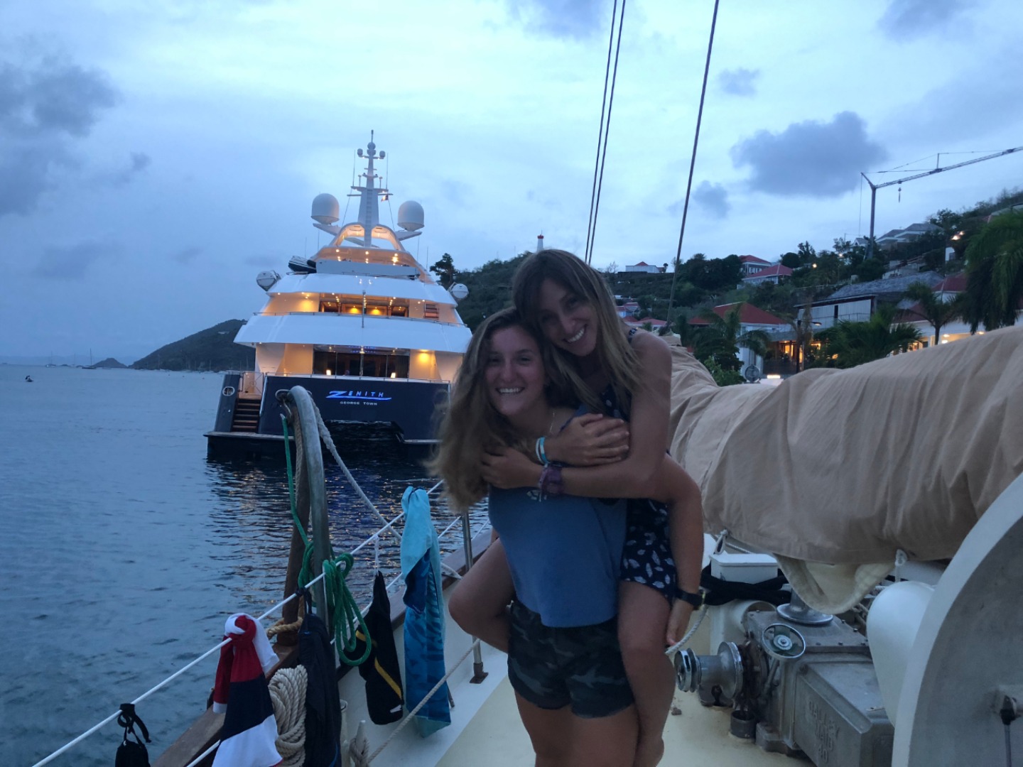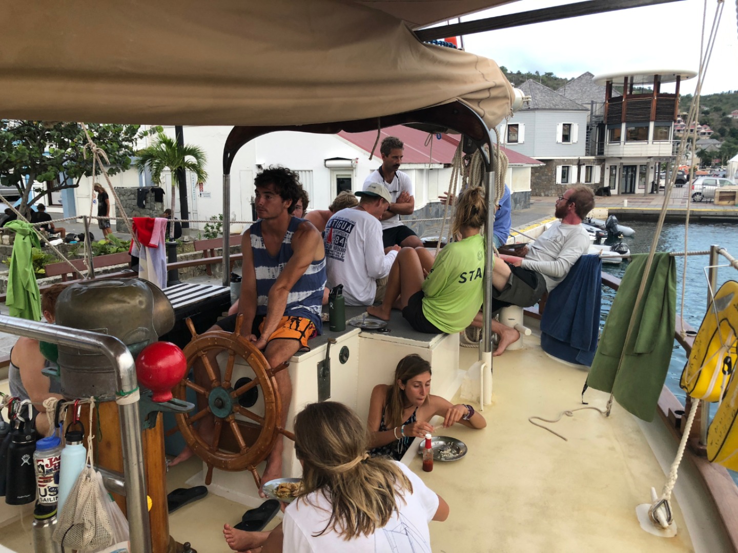 The morning after any overnight voyage, it always takes us a bit longer to wake up to the world around us truly. We bump into each other and take extra time making our coffee and varieties of tea. After officially docking, Brandon jumped off the boat and, speaking for all of us, announced that he was glad to be back in France. Even from the dock, we were able to tell that St. Barths was a little bit different from the rest of the islands we have visited. Our eyes almost didn’t recognize the Louis Vuitton and Cartier stores. We felt very out of place in clothes that we may or may not have dug ours from the bottom of our laundry. We then spent the afternoon scrubbing and tidying up the ship. After showering and feeling beyond grateful for the existence of soap, we were then graced with a delicious dinner of chicken and broccoli. During that time, Steve heroically fixed my fan. Thank you, Steve. You’re the best human being ever to have existed. After that, we all were blessed with Tom’s extraordinary patience in his teaching while we worked on our navigation skills for our Seamanship course. It was a nice and slower day, a time for us to be grateful for little joys, like coffee after a long night and the smell of clean sheets.