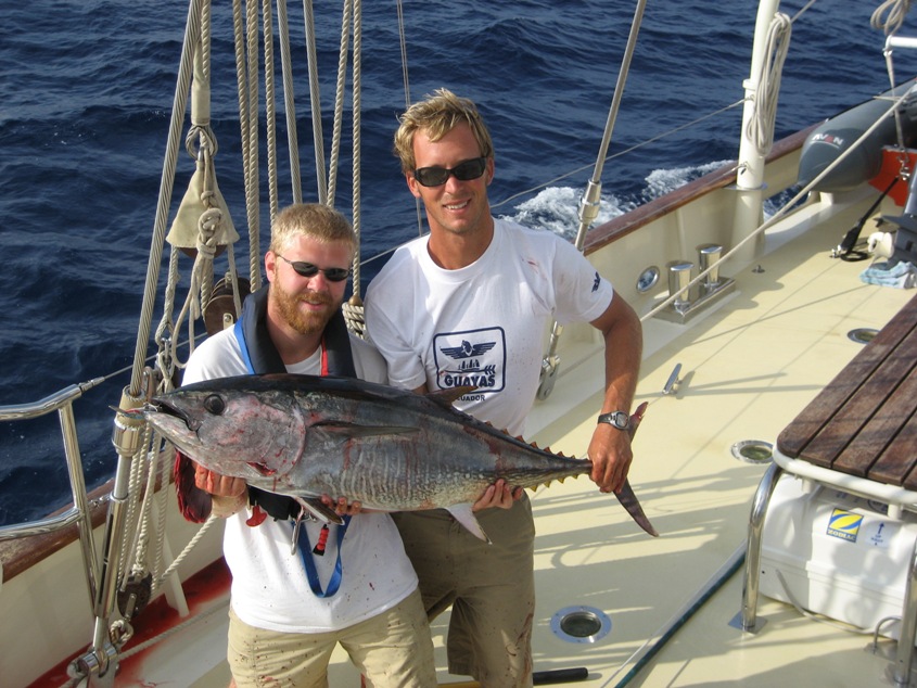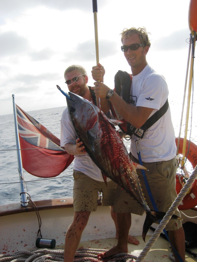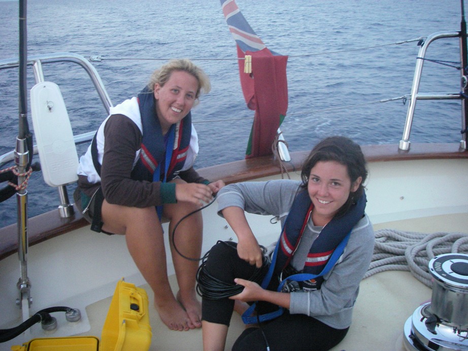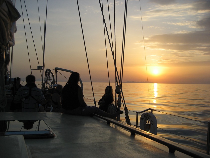 Today was the second full day of our passage to Mahon, Menorca. The morning started with excitement as a fish bit our line shortly after sunrise. It was difficult to pull it in, and after Kiernan fought with the line for several minutes, we realized that we had quite a large tuna at the end of our line, the largest we’ve ever caught on Argo! After a lunch of fresh tuna, we had an oceanography class followed by a nautical science class, then bucket showers on deck before dinner. Throughout the day, the shipmates continued to measure the temperature, salinity, and dissolved oxygen of the water hourly as part of their oceanography class. The wind picked up in the morning, and we were able to sail all day on a nice broad reach. Though our rocking with the swells is testing the sea legs of the crew, all are happy to be sailing along at a nice speed toward Spain.