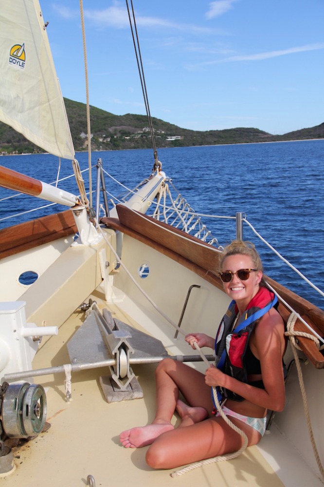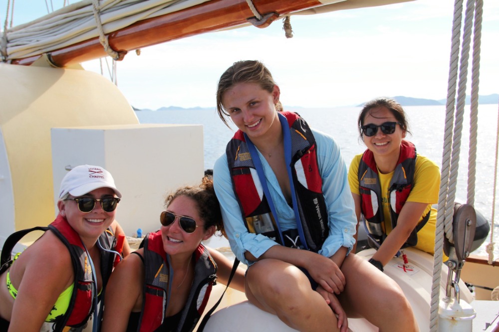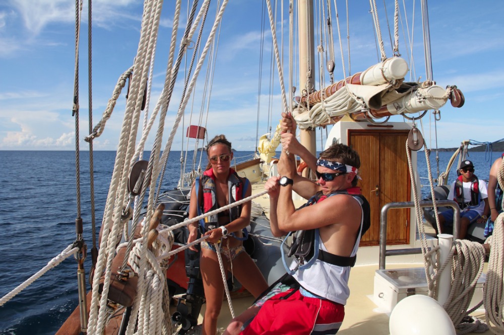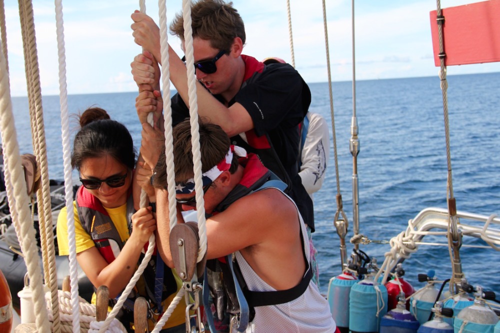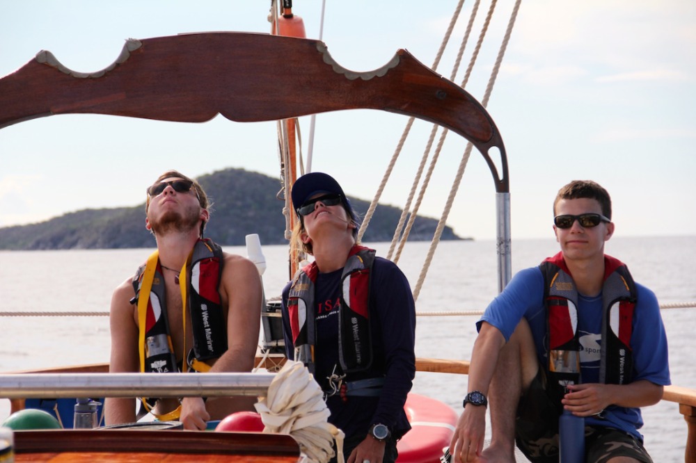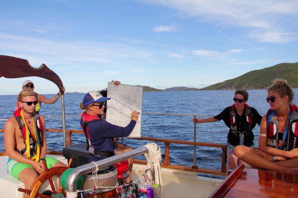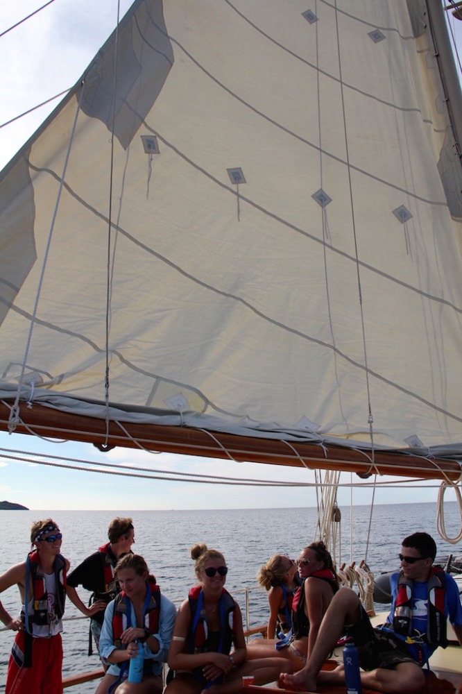 Another glorious day has passed aboard Ocean Star. The crew started the day off with some morning dives. The open-water students completed the confined water portion of the course, and I could tell just by their faces that they felt proud and accomplished. After everyone finished their dives, we prepped for passage to Mountain Point (see title). The duties aboard the ship are getting easier and easier as the days go by, and we learn more and more about the vessel. Today was just a short passage from Savannah Bay to our destination, and Tor spread crucial knowledge of points of sail. I, skipper of the day Cole Lewis, got to man the helm (steer the ship) the whole way there. I thoroughly enjoyed being in control of such a large ship. After we arrived, it was shower time and time for one of our fellow students, Yi, to master the art of diving. We all cheered her on as she successfully dove into the clear waters of the BVI. It was the first time that it seemed like we were a family instead of just a crew.